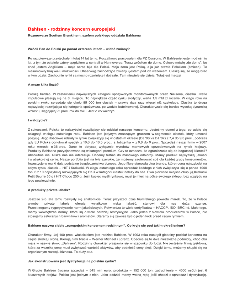 Bahlsen - rodzinny koncern europejski Rozmowa ze Scottem Brankinem, szefem polskiego oddziału Bahlsena Wrócił Pan do Polski po ponad czterech latach – widać zmiany? Po raz pierwszy przyjechałem tutaj 14 lat temu. Początkowo pracowałem dla PZ Cussons. W Bahlsenie jestem od ośmiu lat, z tym Ŝe ostatnie cztery spędziłem w centrali w Hannoverze. Teraz wróciłem do domu. Celowo mówię „do domu”, bo choć jestem Anglikiem – moje serce bije dla Polski. Moja Ŝona jest Polką, a ja juŜ prawie Polakiem (śmiech). To niesamowity kraj wielu moŜliwości. Obserwuję zachodzące zmiany i jestem pod ich waŜeniem. Cieszę się, Ŝe mogę brać w tym udział. Zachodnie rynki są mocno rozwinięte i dojrzałe. Tam niewiele się dzieje. Tutaj jest inaczej A moŜe kilka liczb? Proszę bardzo. W zestawieniu największych kategorii spoŜywczych monitorowanych przez Nielsena, ciastka i wafle impulsowe plasują się na 8. miejscu. To największa część rynku słodyczy, warta 1,5 mld zł rocznie. W ciągu roku na polskim rynku sprzedaje się około 85 000 ton ciastek – prawie dwa razy więcej niŜ czekolady. Ciastka to druga najszybciej rozwijająca się kategoria spoŜywcza, po wodzie butelkowanej. Charakteryzuje się bardzo wysoką dynamiką wzrostu, sięgającą 22 proc. rok do roku. Jest o co walczyć. I walczycie? Z sukcesami. Polska to najszybciej rozwijający się oddział naszego koncernu. Jesteśmy dumni z tego, co udało się osiągnąć w ciągu ostatniego roku. Bahlsen jest jedynym znaczącym graczem w segmencie ciastek, który umocnił pozycję. Jego ilościowe udziały w rynku zwiększyły się w ostatnim okresie (DJ ‘08 vs DJ ’07) z 7,4 do 9,5 proc., podczas gdy LU Polska odnotował spadek z 16,6 do 16,5 proc., a Jutrzenka – z 9,8 do 9 proc. SprzedaŜ naszej firmy w 2007 roku wzrosła o 36 proc. Dane te dotyczą wyłącznie wyrobów markowych sprzedawanych na rynek krajowy. Produkty Bahlsena pozycjonowane są w kategorii premium. Czy to oznacza, Ŝe ograniczacie się do bogatszej klienteli? Absolutnie nie. Nisza nas nie interesuje. Chcemy trafiać do masowego odbiorcy. Mamy produkt najwyŜszej jakości i w atrakcyjnej cenie. Nasze portfolio jest na tyle szerokie, Ŝe moŜemy zaoferować coś dla kaŜdej grupy konsumentów. Inwestycje w marki dają podstawę bezpieczeństwa biznesu. Jego filary stanowią dwa brandy, które rosną najszybciej na całym rynku ciastek – HIT i Krakuski. W ciągu ostatniego roku sprzedaŜ kaŜdego z nich zwiększyła się o ponad 1000 ton. 6 z 10 najszybciej rozwijających się SKU w kategorii ciastek naleŜy do nas. Dwa pierwsze miejsca okupują Krakuski Petit Beurre 50 g i HIT Choco 250 g. Jeśli kupiec myśli rynkowo, musi je mieć na półce swojego sklepu, bez względu na jego powierzchnię. A produkty private labels? Jeszcze 2-3 lata temu rozwijały się znakomicie. Teraz przyszedł czas triumfalnego powrotu marek. To, Ŝe w Polsce wyroby private labels oferują wyjątkowo niską jakość, stanowi dla nas duŜą szansę. Przestrzegamy rygorystycznie norm jakościowych. Potwierdza to wiele certyfikatów – HACCP, ISO, BRC itd. Mało tego, mamy wewnętrzne normy, które są o wiele bardziej restrykcyjne. Jako jeden z niewielu producentów w Polsce, nie stosujemy sztucznych barwników i aromatów. Staramy się zawsze być o jeden krok przed całym rynkiem. Bahlsen nazywa siebie „europejskim koncernem rodzinnym”. Co kryje się pod takim określeniem? Charakter firmy. Jej 100-proc. właścicielem jest rodzina Bahlsen. W 1993 roku nastąpił globalny podział koncernu na część słodką i słoną. Kierują nimi bracia – Werner Michael i Lorenz. Obecnie są to dwa niezaleŜne podmioty, choć oba mają w nazwie słowo „Bahlsen”. Rodzinny charakter przejawia się w szacunku do ludzi. Nie jesteśmy firmą giełdową, która za wszelką cenę musi zwiększać wartość aktywów, aby podnieść ceny akcji. Dzięki temu, moŜemy skupić się na organicznym rozwoju biznesu. To duŜy atut. Jak skonstruowana jest dystrybucja na polskim rynku? W Grupie Bahlsen (roczna sprzedaŜ – 545 mln euro, produkcja – 152 000 ton, zatrudnienie – 4000 osób) jest 6 kluczowych krajów. Polska jest jednym z nich. Jako oddział mamy wolną rękę jeśli chodzi o sprzedaŜ i dystrybucję. Pozwala nam to lepiej dopasować się do lokalnego rynku, jego potrzeb i oczekiwań. Zatrudnienie w dziale sprzedaŜy zwiększyliśmy ostatnio o jedną piątą. Podzieliliśmy go na dwa zespoły. Jeden obsługuje handel sieciowy, zaś drugi odpowiada za niezrzeszonych detalistów. To są ludzie pracujący cały czas w terenie. Mają doskonałe narzędzia, chociaŜby w postaci palmtopów z mobilną aplikacją sprzedaŜy. Do ilu sklepów docierają? Tylko w marcu odnotowaliśmy 25-proc. wzrost pokrycia sklepów. Docieramy do placówek detalicznych, które odpowiadają za 80 proc. dystrybucji waŜonej ciastek i wafli. Nie koncentrujemy się jednak wyłącznie na odwiedzaniu nowych sklepów. RównieŜ w tych, w których juŜ jesteśmy, moŜemy wiele zdziałać, choćby przez lepszy merchandising. Który kanał sprzedaŜy jest dla Bahlsena waŜniejszy? W tzw. tradycyjnym handlu sprzedajemy 55 proc. produkcji, a w nowoczesnym – 45 proc. Nie moŜna faworyzować Ŝadnego z kanałów dystrybucji. Polski rynek jest zupełnie inny, niŜ np. niemiecki, francuski czy brytyjski, gdzie liczy się zaledwie po kilku operatorów detalicznych z wielkiej dystrybucji. Trzeba to zrozumieć, zaakceptować i dostosować strategię do realiów. Nie wierzę, Ŝe dobre małe sklepy będą znikać z handlowej mapy Polski. Ostatnio dystrybucję swoich wyrobów powierzył wam producent kawy Inka – kto będzie następny? Cieszę się, Ŝe inni producenci z sektora FMCG doceniają wysiłki Bahlsena na rzecz doskonalenia systemu dystrybucji. W tym przypadku mowa o sąsiedzie zza miedzy – firmie Biogran. Nie wykluczam, Ŝe pod naszą dystrybucję będą podłączać się inni producenci 