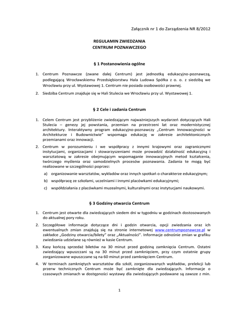 Załącznik nr 1 do Zarządzenia NR 8/2012 REGULAMIN ZWIEDZANIA CENTRUM POZNAWCZEGO § 1 Postanowienia ogólne 1. Centrum Poznawcze (zwane dalej Centrum) jest jednostką edukacyjno-poznawczą, podlegającą Wrocławskiemu Przedsiębiorstwu Hala Ludowa Spółka z o. o. z siedzibą we Wrocławiu przy ul. Wystawowej 1. Centrum nie posiada osobowości prawnej. 2. Siedziba Centrum znajduje się w Hali Stulecia we Wrocławiu przy ul. Wystawowej 1. § 2 Cele i zadania Centrum 1. Celem Centrum jest przybliżenie zwiedzającym najważniejszych wydarzeń dotyczących Hali Stulecia – genezy jej powstania, przemian na przestrzeni lat oraz modernistycznej architektury. Interaktywny program edukacyjno-poznawczy „Centrum Innowacyjności w Architekturze i Budownictwie” wspomaga edukację w zakresie architektonicznych przemianami oraz innowacji. 2. Centrum w porozumieniu i we współpracy z innymi krajowymi oraz zagranicznymi instytucjami, organizacjami i stowarzyszeniami może prowadzić działalność edukacyjną i warsztatową w zakresie obejmującym wspomaganie innowacyjnych metod kształcenia, twórczego myślenia oraz samodzielnych procesów poznawania. Zadania te mogą być realizowane w szczególności poprzez: a) organizowanie warsztatów, wykładów oraz innych spotkań o charakterze edukacyjnym; b) współpracę ze szkołami, uczelniami i innymi placówkami edukacyjnymi; c) współdziałania z placówkami muzealnymi, kulturalnymi oraz instytucjami naukowymi. § 3 Godziny otwarcia Centrum 1. Centrum jest otwarte dla zwiedzających siedem dni w tygodniu w godzinach dostosowanych do aktualnej pory roku. 2. Szczegółowe informacje dotyczące dni i godzin otwarcia, opcji zwiedzania oraz ich ewentualnych zmian znajdują się na stronie internetowej www.centrumpoznawcze.pl w zakładce „Godziny otwarcia/bilety” oraz „Aktualności”. Informacje odnośnie zmian w grafiku zwiedzania udzielane są również w kasie Centrum. 3. Kasy kończą sprzedaż biletów na 30 minut przed godziną zamknięcia Centrum. Ostatni zwiedzający wpuszczani są na 30 minut przed zamknięciem, przy czym ostatnie grupy zorganizowane wpuszczane są na 60 minut przed zamknięciem Centrum. 4. W terminach zamkniętych warsztatów dla szkół, zorganizowanych wykładów, prelekcji lub przerw technicznych Centrum może być zamknięte dla zwiedzających. Informacje o czasowych zmianach w dostępności wystawy dla zwiedzających podawane są zawsze z min. 1 tygodniowym wyprzedzeniem „Aktualności”. na stronie www.centrumpoznawcze.pl w zakładce 5. Istnieje możliwość całkowitej rezerwacji przestrzeni Centrum do indywidualnego/grupowego zwiedzania za dodatkową opłatą i po uprzedniej rezerwacji. § 4 Opłaty dla zwiedzających, rodzaje biletów, opcje zwiedzania 1. Wejście do Centrum jest odpłatne. Cennik biletów z opisem opcji zwiedzania oraz wykazem osób uprawnionych do wstępu ulgowego i bezpłatnego dostępny jest na stronie www.centrumpoznawcze.pl w zakładce „Godziny otwarcia/bilety” oraz w kasie Centrum. 2. Zakup biletu i wejście do Centrum możliwe jest pod warunkiem dostępności wolnych miejsc w wybranym przedziale czasowym. Ilość zwiedzających mogących jednocześnie zwiedzać Centrum jest limitowana i wynosi 50 osób. 3. Zakup biletu obejmującego zwiedzanie Centrum poszerzone o Kuluary i Galerię lub Kuluary, Galerię i Pokaz Videomappingu pod Kopułą możliwe jest pod warunkiem dostępności tej opcji w danym terminie. Wcześniejsza rezerwacja poszerzonej opcji zwiedzania możliwa jest z maksymalnie tygodniowym wyprzedzeniem. Pełne informacje odnośnie opcji zwiedzania w danym dniu znaleźć można w bieżących terminarzach zwiedzania, umieszczonych przy formularzu kontaktowym na stronie www.centrumpoznawcze.pl (zakładka „Godziny/bilety”), w zakładce „Aktualności” oraz w kasie Centrum. 4. Zwiedzanie Hali Stulecia możliwe jest po wykupieniu biletu obejmującego opcję zwiedzania Centrum Poznawczego poszerzoną o Kuluary i Galerię bądź Kuluary, Galerię oraz Videomapping. Hala Stulecia będzie udostępniona zwiedzającym pod warunkiem, że na jej terenie nie odbywa się aktualnie impreza okolicznościowa lub prace techniczne z nią związane. 5. Osoba kupująca bilet zobowiązana jest do zachowania paragonu, faktury lub – w przypadku dokonania przelewu bankowego na rachunek podany przy potwierdzaniu rezerwacji – potwierdzenia dokonania tego przelewu. 6. Bilet wstępu w postaci plastikowej karty zbliżeniowej RFID wydawany jest bezpośrednio przed wejściem na wystawę w kasie Centrum na podstawie dowodu zakupu biletu. Bilet wstępu zostaje zakodowany zgodnie z wykupioną opcją zwiedzania i podlega zwrotowi przy wyjściu z Centrum. 7. Za zgubienie lub zniszczenie biletu wstępu obowiązuje jednorazowa opłata w wysokości 5 zł, chyba że zwiedzający nie odpowiada za zgubienie lub zniszczenie biletu. 8. W przypadku niezapowiedzianych zmian w grafiku zwiedzania Centrum i niedostępności wykupionej wcześniej opcji zwiedzania poszerzonej o Kuluary i Galerię bądź Kuluary, Galerię i Pokaz Videomappingu pod Kopulą, Centrum dokona zwrotu wpłaconych kwot na zarezerwowane wcześniej bilety: a) w kasach Centrum gotówką lub na kartę płatniczą zgodnie z formą w jakiej płatność została wniesiona; b) na numer rachunku wskazany przez osobę rezerwującą w przypadku opłaty dokonanej przelewem; 9. Centrum nie zapewnia stałej usługi przewodników. Zwiedzanie ekspozycji ma charakter indywidualny. Zwiedzanie z przewodnikiem dostępne jest jako opcja dodatkowa, niezależna od stałej wystawy Centrum Poznawczego i obejmuje opcjonalnie budynek Hali Stulecia, Tereny Wystawowe i osiedle WUWA. Zwiedzanie z przewodnikiem wymaga wcześniejszej 2 rezerwacji i uiszczenia dodatkowej opłaty. Wszelkie informacje odnośnie zwiedzania z przewodnikiem umieszczone są na stronie www.centrumpoznawcze.pl 10. Kasy przyjmują płatność w złotówkach oraz akceptują karty płatnicz