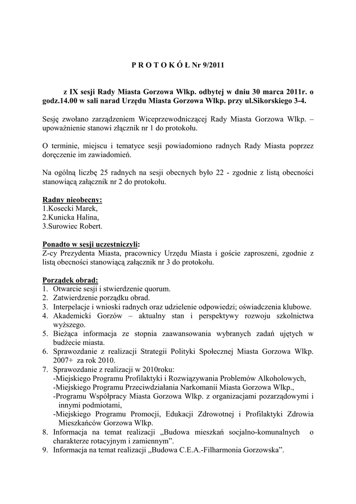 P R O T O K Ó Ł Nr 9/2011 z IX sesji Rady Miasta Gorzowa Wlkp. odbytej w dniu 30 marca 2011r. o godz.14.00 w sali narad Urzędu Miasta Gorzowa Wlkp. przy ul.Sikorskiego 3-4. Sesję zwołano zarządzeniem Wiceprzewodniczącej Rady Miasta Gorzowa Wlkp. – upoważnienie stanowi złącznik nr 1 do protokołu. O terminie, miejscu i tematyce sesji powiadomiono radnych Rady Miasta poprzez doręczenie im zawiadomień. Na ogólną liczbę 25 radnych na sesji obecnych było 22 - zgodnie z listą obecności stanowiącą załącznik nr 2 do protokołu. Radny nieobecny: 1.Kosecki Marek, 2.Kunicka Halina, 3.Surowiec Robert. Ponadto w sesji uczestniczyli: Z-cy Prezydenta Miasta, pracownicy Urzędu Miasta i goście zaproszeni, zgodnie z listą obecności stanowiącą załącznik nr 3 do protokołu. Porządek obrad: 1. Otwarcie sesji i stwierdzenie quorum. 2. Zatwierdzenie porządku obrad. 3. Interpelacje i wnioski radnych oraz udzielenie odpowiedzi; oświadczenia klubowe. 4. Akademicki Gorzów – aktualny stan i perspektywy rozwoju szkolnictwa wyższego. 5. Bieżąca informacja ze stopnia zaawansowania wybranych zadań ujętych w budżecie miasta. 6. Sprawozdanie z realizacji Strategii Polityki Społecznej Miasta Gorzowa Wlkp. 2007+ za rok 2010. 7. Sprawozdanie z realizacji w 2010roku: -Miejskiego Programu Profilaktyki i Rozwiązywania Problemów Alkoholowych, -Miejskiego Programu Przeciwdziałania Narkomanii Miasta Gorzowa Wlkp., -Programu Współpracy Miasta Gorzowa Wlkp. z organizacjami pozarządowymi i innymi podmiotami, -Miejskiego Programu Promocji, Edukacji Zdrowotnej i Profilaktyki Zdrowia Mieszkańców Gorzowa Wlkp. 8. Informacja na temat realizacji „Budowa mieszkań socjalno-komunalnych o charakterze rotacyjnym i zamiennym”. 9. Informacja na temat realizacji „Budowa C.E.A.-Filharmonia Gorzowska”. 2 10. Podjęcie uchwały w sprawie opinii do wniesienia mienia Miasta Gorzowa Wlkp. aportem do Przedsiębiorstwa Wodociągów i Kanalizacji Spółka z o.o. w Gorzowie Wlkp. - druk nr 74. 11. Podjęcie uchwały w sprawie zatwierdzenia planu finansowego środków Państwowego Funduszu Rehabilitacji Osób Niepełnosprawnych na realizację zadań z zakresu rehabilitacji zawodowej i społecznej w 2011 roku - druk nr 68. 12. Podjęcie uchwały w sprawie zmiany uchwały budżetowej na 2011 rok miasta Gorzowa Wlkp. – druk nr 75. 13. Podjęcie uchwały w sprawie zmiany uchwały budżetowej na 2011 rok miasta Gorzowa Wlkp. – druk nr 76. 14. Podjęcie uchwały w sprawie zmiany uchwały budżetowej na 2011 rok miasta Gorzowa Wlkp. – druk nr 77. 15. Podjęcie uchwały w sprawie zmiany uchwały budżetowej na 2011 rok miasta Gorzowa Wlkp. – druk nr 78. 16. Podjęcie uchwały w sprawie zmiany uchwały budżetowej na 2011 rok miasta Gorzowa Wlkp. – druk nr 82. 17. Podjęcie uchwały w sprawie zmiany Wieloletniej Prognozy Finansowej Miasta Gorzowa Wlkp. na lata 2011-2086 – druk nr 80. 18. Podjęcie uchwały zmieniającej uchwałę w sprawie ustalenia jednostkowych stawek dotacji przedmiotowej na rok 2011 dla Zakładu Gospodarki Mieszkaniowej w Gorzowie Wlkp. – druk nr 81. 19. Podjęcie uchwały w sprawie zasad udzielania dotacji celowych na inwestycje związane z ochroną środowiska i gospodarką wodną – druk nr 67. 20. Podjęcie uchwały w sprawie udzielenia dotacji dla Wspólnoty Mieszkaniowej kamienicy przy ul.Krzywoustego 10 w Gorzowie Wlkp. – druk nr 69. 21. Podjęcie uchwały w sprawie udzielenia dotacji dla Wspólnoty Mieszkaniowej kamienicy przy ul.Jasnej 3-4 w Gorzowie Wlkp. – druk nr 70. 22. Podjęcie uchwały w sprawie udzielenia dotacji dla Wspólnoty Mieszkaniowej kamienicy przy ul.Jasnej 5-6 w Gorzowie Wlkp. – druk nr 71. 23. Podjęcie uchwały w sprawie udzielenia dotacji dla Wspólnoty Mieszkaniowej kamienicy przy ul.Armii Polskiej 22 w Gorzowie Wlkp. – druk nr 72. 24. Podjęcie uchwały w sprawie udzielenia dotacji dla Wspólnot Mieszkaniowych kamienicy narożnej przy ul.Jasnej 1-2 i ul.Śląskiej 38 w Gorzowie Wlkp. – druk nr 73. 25. Podjęcie uchwały w sprawie wyrażenia zgody na ustawienie pomnika Edwarda Jancarza przy ul.Śląskiej w Gorzowie Wlkp.- druk nr 79. 26. Informacja z bieżącej działalności Prezydenta Miasta. 27. Odpowiedzi na interpelacje z VI sesji Rady Miasta z dnia 23 lutego 2011r. 28. Sprawy różne, wolne wnioski. 29. Zakończenie obrad. Ad.1 Otwarcie sesji i stwierdzenie quorum. Sesję otworzyła i jej obradom przewodniczyła Przewodnicząca Rady Miasta Krystyna Sibińska, która po powitaniu stwierdziła wymagane quorum do obradowania i podejmowania prawomocnych uchwał. 3 Ad.2 Proponowany porządek obrad. Krystyna Sibińska – poinformowała, że wpłynął wniosek Prezydenta Miasta o wycofanie z porządku obrad projektu uchwały w sprawie wyrażenia zgody na ustawienie pomnika Edwarda Jancarza przy ul.Śląskiej w Gorzowie Wlkp., ujętego w pkt.25 porządku oraz wniosek o poszerzenie porządku obrad o projekt uchwały zmieniający uchwałę w sprawie zasad gospodarowania lokalami użytkowymi i projekt uchwały w sprawie udzielenia dotacji dla Parafii Rzymsko-Katolickiej p.w. Podwyższenia Krzyża Św. w Deszcznie. Wpłynęła również prośba Komisji Gospodarki i Rozwoju o poszerzenie porządku obrad o projekt uchwały w sprawie rozstrzygnięcia skargi. Konwent proponuje poszerzenie porządku obrad o przyjęcie stanowiska w sprawie uczczenia pamięci katastrofy pod Smoleńskiem. Proponuje również zmianę kolejności i w pkt.8 rozpatrzyć projekt uchwały ujęty w pkt.11. W głosowaniu jawnym za zmianą kolejności i w pkt.8 - podjęcie uchwały w sprawie zatwierdzenia planu finansowego środków Państwowego Funduszu Rehabilitacji Osób Niepełnosprawnych na realizację zadań z zakresu rehabilitacji zawodowej i społecznej w 2011 roku, głosowało 20 radnych, przy braku głosów przeciwnych i wstrzymujących się. W głosowaniu jawnym za poszerzeniem porządku obrad o projekt uchwały zmieniający uchwałę w sprawie zasad gospod