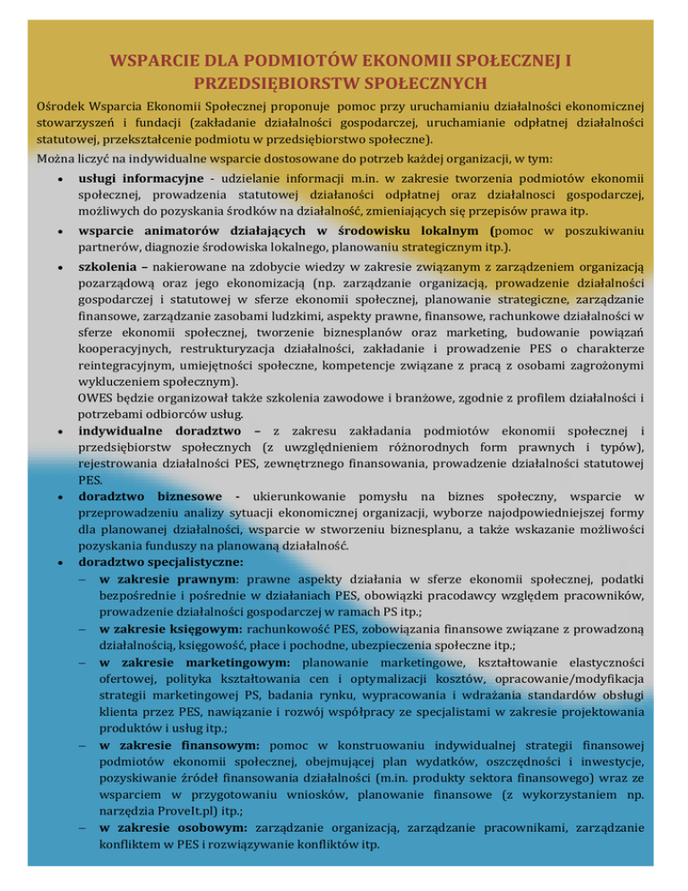 WSPARCIE DLA PODMIOTÓW EKONOMII SPOŁECZNEJ I