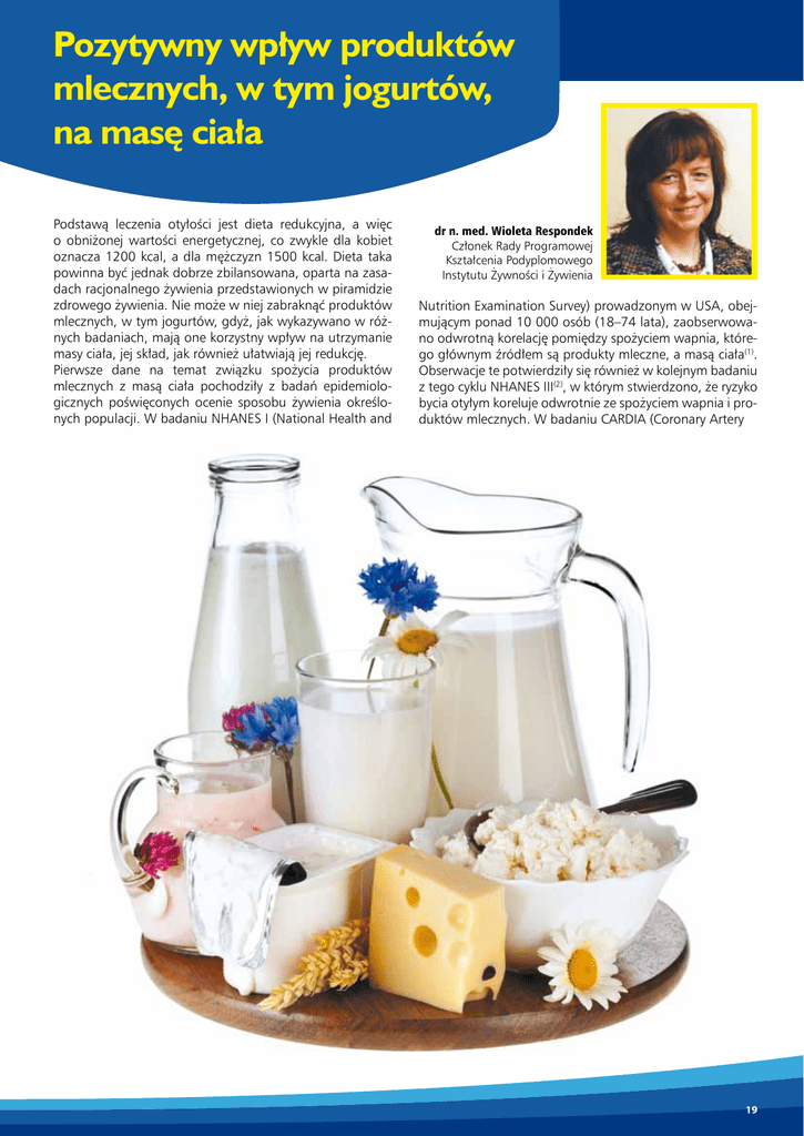 Pozytywny wpływ produktów mlecznych, w tym jogurtów, na masę ciała Podstawą leczenia otyłości jest dieta redukcyjna, a więc o obniżonej wartości energetycznej, co zwykle dla kobiet oznacza 1200 kcal, a dla mężczyzn 1500 kcal. Dieta taka powinna być jednak dobrze zbilansowana, oparta na zasadach racjonalnego żywienia przedstawionych w piramidzie zdrowego żywienia. Nie może w niej zabraknąć produktów mlecznych, w tym jogurtów, gdyż, jak wykazywano w różnych badaniach, mają one korzystny wpływ na utrzymanie masy ciała, jej skład, jak również ułatwiają jej redukcję. Pierwsze dane na temat związku spożycia produktów mlecznych z masą ciała pochodziły z badań epidemiologicznych poświęconych ocenie sposobu żywienia określonych populacji. W badaniu NHANES I (National Health and dr n. med. Wioleta Respondek Członek Rady Programowej Kształcenia Podyplomowego Instytutu Żywności i Żywienia Nutrition Examination Survey) prowadzonym w USA, obejmującym ponad 10 000 osób (18–74 lata), zaobserwowano odwrotną korelację pomiędzy spożyciem wapnia, którego głównym źródłem są produkty mleczne, a masą ciała(1). Obserwacje te potwierdziły się również w kolejnym badaniu z tego cyklu NHANES III(2), w którym stwierdzono, że ryzyko bycia otyłym koreluje odwrotnie ze spożyciem wapnia i produktów mlecznych. W badaniu CARDIA (Coronary Artery 19 Żywność dla zdrowia Risk Development in Young Adults)(3) obejmującym populację młodych ludzi wykazano odwrotną zależność między spożyciem produktów mlecznych a występowaniem otyłości i innych czynników zespołu oporności na insulinę. W kolejnych latach w wielu przeprowadzonych badaniach dowodzono, że niskie spożycie wapnia i/lub produktów mlecznych jest związane z większą masą tkanki tłuszczowej oraz z wyższym ryzykiem rozwoju nadwagi(4–8). Warto jeszcze przytoczyć wnioski z badania Framingham Heart Study(9), w którym poddano analizie zmiany w sposobie żywienia w latach 1998–2001 i 2005–2008 u ponad 3 tys. dorosłych. Stwierdzono, iż u osób, u których przez lata obserwacji wzrastało spożycie jogurtu, przyrost masy ciała i obwodu talii był istotnie mniejszy niż u tych, u których to spożycie malało. Mechanizm działania produktów mlecznych Mechanizm działania produktów mlecznych w aspekcie korzystnego wpływu na masę ciała jest stale dyskutowany. Wydaje się, że składnikami mleka, które odgrywają tu szczególną rolę, są wapń i białka serwatkowe(10,11). Produkty mleczne, jak wiadomo, są bogatym źródłem dobrze przyswajalnego wapnia. Pierwiastek ten, a dokładnie jego wewnątrzkomórkowe stężenie, jest istotnym czynnikiem regulującym metabolizm adipocytów, wpływającym na procesy magazynowania w nich triglicerydów – zwiększone stężenie wapnia wewnątrz adipocytu powoduje, poprzez ekspresję odpowiednich genów, nasilenie lipogenezy i hamowanie lipolizy, co prowadzi do wzrostu masy tkanki tłuszczowej(2). 20 Wewnątrzkomórkowe stężenie Ca pozostaje pod kontrolą hormonów kalcytropowych – parathormonu i aktywnej formy witaminy D – 1,25(OH)2-D3 (kalcytriolu). Wydaje się jednak, że w komórkach tkanki tłuszczowej główna rola przypada witaminie D(10). Zmiany w jej stężeniu, pod wpływem różnej zawartości wapnia w diecie pochodzącego z produktów mlecznych, mają istotne znaczenie w regulacji metabolizmu tkanki tłuszczowej. W błonach komórkowych adipocytów znajdują się receptory dla witaminy D, za pośrednictwem których powoduje ona szybki wzrost stężenia Ca wewnątrz komórki(12). Efektem tego jest wzmożona aktywność syntezy kwasów tłuszczowych, a w konsekwencji gromadzenie się tłuszczu w adipocytach. Wysokie spożycie wapnia, powodując zmniejszenie stężenia 1,25(OH)2-D3, przyczynia się do przewagi procesów odwrotnych – a więc zahamowania syntezy kwasów tłuszczowych i nasilenia lipolizy, co w efekcie prowadzi do obniżenia masy tkanki tłuszczowej. Ponadto, wysokie spożycie wapnia może sprzyjać zwiększonemu wydatkowi energetycznemu poprzez nasilenie termogenezy, również w mechanizmie zmian w aktywności witaminy D, ale za pośrednictwem receptorów innych niż opisane powyżej. Chodzi tu o receptory jądrowe, których interakcja z 1,25(OH)2-D3 powoduje zahamowanie aktywności białka zwanego UCP2 (uncoupling protein 2), skutkiem czego jest zmniejszenie termogenezy(13). Tak więc zmniejszenie oddziaływania kalcytriolu w wyniku zwiększonej podaży wapnia będzie prowadziło do utrzymania aktywności UCP2 i termogenezy na odpowiednio wysokim poziomie. Zalecane spożycie produktów mlecznych może być pomocne w osiągnięciu ujemnego bilansu energetycznego, ponieważ zwiększonemu spożyciu wapnia towarzyszy także zwiększone wydalanie tłuszczu w kale (obniża się więc liczba kcal dostępnych dla organizmu). W jednym z badań(14) stwierdzono, że wzrost spożycia wapnia z 500 do 1800 mg na dzień powodowało 2,5-krotny wzrost wydalania tłuszczu w kale. Zjawisko to jednak, jak się wydaje, nie ma aż tak dużego znaczenia dla korzystnego działania diety bogatej w wapń jak jej wpływ na aktywność hormonów kalcytropowych i w konsekwencji udział w korzystnych zmianach metabolizmu tkanki tłuszczowej. Bardzo ciekawym zagadnieniem jest pozytywny wpływ diety obfitującej w produkty mleczne na redukcję trzewnej tkanki tłuszczowej. Wydaje się, iż w tym przypadku istotną rolę odgrywa regulacja aktywności 11β-dehydrogenazy hydroksysteroidowej typu 1. (11β-HSD-1)(15). Jest to enzym warunkujący przekształcenie kortyzonu w kortyzol. Ekspresja 11β-HSD-1 jest szczególnie wysoka w trzewnej tkance tłuszczowej. Stwierdzono, że wysoki poziom 1,25-(OH)2-D3, związany z niskim spożyciem wapnia, powoduje nasilenie ekspresji 11β-HSD-1 i wzrost produkcji kortyzolu, co prowadzi do narastania masy trzewnej tkanki tłuszczowej. Dieta bogata w wapń ma odmienny skutek – zmniejszenie stę-
