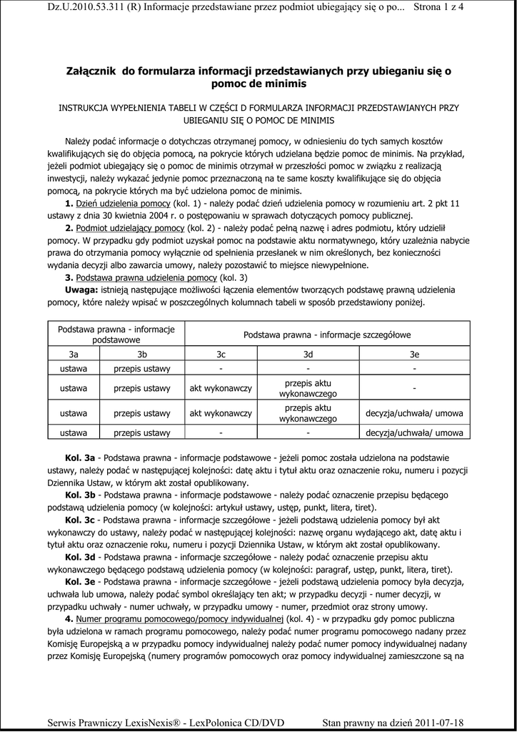 Dz.U.2010.53.311 (R) Informacje przedstawiane przez podmiot ubiegający się o po... Strona 1 z 4 Załącznik do formularza informacji przedstawianych przy ubieganiu się o pomoc de minimis INSTRUKCJA WYPEŁNIENIA TABELI W CZĘŚCI D FORMULARZA INFORMACJI PRZEDSTAWIANYCH PRZY UBIEGANIU SIĘ O POMOC DE MINIMIS NaleŜy podać informacje o dotychczas otrzymanej pomocy, w odniesieniu do tych samych kosztów kwalifikujących się do objęcia pomocą, na pokrycie których udzielana będzie pomoc de minimis. Na przykład, jeŜeli podmiot ubiegający się o pomoc de minimis otrzymał w przeszłości pomoc w związku z realizacją inwestycji, naleŜy wykazać jedynie pomoc przeznaczoną na te same koszty kwalifikujące się do objęcia pomocą, na pokrycie których ma być udzielona pomoc de minimis. 1. Dzień udzielenia pomocy (kol. 1) - naleŜy podać dzień udzielenia pomocy w rozumieniu art. 2 pkt 11 ustawy z dnia 30 kwietnia 2004 r. o postępowaniu w sprawach dotyczących pomocy publicznej. 2. Podmiot udzielający pomocy (kol. 2) - naleŜy podać pełną nazwę i adres podmiotu, który udzielił pomocy. W przypadku gdy podmiot uzyskał pomoc na podstawie aktu normatywnego, który uzaleŜnia nabycie prawa do otrzymania pomocy wyłącznie od spełnienia przesłanek w nim określonych, bez konieczności wydania decyzji albo zawarcia umowy, naleŜy pozostawić to miejsce niewypełnione. 3. Podstawa prawna udzielenia pomocy (kol. 3) Uwaga: istnieją następujące moŜliwości łączenia elementów tworzących podstawę prawną udzielenia pomocy, które naleŜy wpisać w poszczególnych kolumnach tabeli w sposób przedstawiony poniŜej. Podstawa prawna - informacje podstawowe Podstawa prawna - informacje szczegółowe 3a 3b 3c 3d 3e ustawa przepis ustawy - - - ustawa przepis ustawy akt wykonawczy przepis aktu wykonawczego - ustawa przepis ustawy akt wykonawczy przepis aktu wykonawczego decyzja/uchwała/ umowa ustawa przepis ustawy - - decyzja/uchwała/ umowa Kol. 3a - Podstawa prawna - informacje podstawowe - jeŜeli pomoc została udzielona na podstawie ustawy, naleŜy podać w następującej kolejności: datę aktu i tytuł aktu oraz oznaczenie roku, numeru i pozycji Dziennika Ustaw, w którym akt został opublikowany. Kol. 3b - Podstawa prawna - informacje podstawowe - naleŜy podać oznaczenie przepisu będącego podstawą udzielenia pomocy (w kolejności: artykuł ustawy, ustęp, punkt, litera, tiret). Kol. 3c - Podstawa prawna - informacje szczegółowe - jeŜeli podstawą udzielenia pomocy był akt wykonawczy do ustawy, naleŜy podać w następującej kolejności: nazwę organu wydającego akt, datę aktu i tytuł aktu oraz oznaczenie roku, numeru i pozycji Dziennika Ustaw, w którym akt został opublikowany. Kol. 3d - Podstawa prawna - informacje szczegółowe - naleŜy podać oznaczenie przepisu aktu wykonawczego będącego podstawą udzielenia pomocy (w kolejności: paragraf, ustęp, punkt, litera, tiret). Kol. 3e - Podstawa prawna - informacje szczegółowe - jeŜeli podstawą udzielenia pomocy była decyzja, uchwała lub umowa, naleŜy podać symbol określający ten akt; w przypadku decyzji - numer decyzji, w przypadku uchwały - numer uchwały, w przypadku umowy - numer, przedmiot oraz strony umowy. 4. Numer programu pomocowego/pomocy indywidualnej (kol. 4) - w przypadku gdy pomoc publiczna była udzielona w ramach programu pomocowego, naleŜy podać numer programu pomocowego nadany przez Komisję Europejską a w przypadku pomocy indywidualnej naleŜy podać numer pomocy indywidualnej nadany przez Komisję Europejską (numery programów pomocowych oraz pomocy indywidualnej zamieszczone są na Serwis Prawniczy LexisNexis® - LexPolonica CD/DVD Stan prawny na dzień 2011-07-18 Dz.U.2010.53.311 (R) Informacje przedstawiane przez podmiot ubiegający się o po... Strona 2 z 4 stronie internetowej Urzędu Ochrony Konkurencji i Konsumentów). W przypadku pomocy de minimis kolumny nr 4 nie wypełnia się. 5. Forma pomocy (kol. 5) - naleŜy podać formę otrzymanej pomocy (np. dotacja, refundacja, ulga podatkowa). 6. Wartość otrzymanej pomocy (kol. 6) - naleŜy podać: a) wartość nominalną pomocy (jako całkowitą wielkość środków finansowych będących podstawą do obliczania wielkości udzielonej pomocy, np. kwota udzielonej poŜyczki lub kwota odroczonego podatku) oraz b) wartość brutto (jako ekwiwalent dotacji brutto obliczony zgodnie z rozporządzeniem Rady Ministrów z dnia 11 sierpnia 2004 r. w sprawie szczegółowego sposobu obliczania wartości pomocy publicznej udzielanej w róŜnych formach (Dz. U. Nr 194, poz. 1983, z późn. zm.)). 7. Przeznaczenie pomocy (kol. 7) - naleŜy podać kod wskazujący przeznaczenie otrzymanej pomocy według poniŜszej tabeli. Wyszczególnienie Kod 1 2 A. POMOC HORYZONTALNA Pomoc na działalność badawczą, rozwojową i innowacyjną pomoc na projekty badawczo-rozwojowe a1.1 pomoc dla młodych innowacyjnych przedsiębiorstw a1.2 pomoc na techniczne studia wykonalności a1.3 pomoc na innowacje w obrębie procesów i innowacje organizacyjne w sektorze usług a1.4 pomoc na usługi doradcze w zakresie innowacji i usługi wsparcia innowacji a1.5 pomoc na tymczasowe zatrudnienie wysoko wykwalifikowanego personelu a1.6 pomoc na klastry innowacyjne a1.7 pomoc na pokrycie kosztów praw własności przemysłowej dla małych i średnich przedsiębiorstw a1.8 Pomoc na ochronę środowiska pomoc inwestycyjna umoŜliwiająca przedsiębiorstwom dostosowanie do norm wspólnotowych (zgodnie z załącznikiem XII Traktatu o przystąpieniu Rzeczypospolitej Polskiej do Unii Europejskiej), zastosowanie norm surowszych niŜ normy wspólnotowe w zakresie ochrony środowiska lub podniesienie poziomu ochrony środowiska w przypadku braku norm wspólnotowych a2.1 pomoc na nabycie nowych środków transportu spełniających normy surowsze niŜ normy wspólnotowe lub podnoszących poziom ochrony środowiska w przypadku braku norm wspólnotowych a2.2 pomoc na szybkie prz