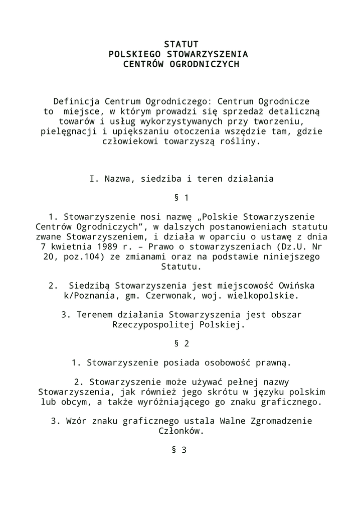 STATUT POLSKIEGO STOWARZYSZENIA CENTRÓW OGRODNICZYCH Definicja Centrum Ogrodniczego: Centrum Ogrodnicze to miejsce, w którym prowadzi się sprzedaż detaliczną towarów i usług wykorzystywanych przy tworzeniu, pielęgnacji i upiększaniu otoczenia wszędzie tam, gdzie człowiekowi towarzyszą rośliny. I. Nazwa, siedziba i teren działania § 1 1. Stowarzyszenie nosi nazwę „Polskie Stowarzyszenie Centrów Ogrodniczych”, w dalszych postanowieniach statutu zwane Stowarzyszeniem, i działa w oparciu o ustawę z dnia 7 kwietnia 1989 r. – Prawo o stowarzyszeniach (Dz.U. Nr 20, poz.104) ze zmianami oraz na podstawie niniejszego Statutu. 2. Siedzibą Stowarzyszenia jest miejscowość Owińska k/Poznania, gm. Czerwonak, woj. wielkopolskie. 3. Terenem działania Stowarzyszenia jest obszar Rzeczypospolitej Polskiej. § 2 1. Stowarzyszenie posiada osobowość prawną. 2. Stowarzyszenie może używać pełnej nazwy Stowarzyszenia, jak również jego skrótu w języku polskim lub obcym, a także wyróżniającego go znaku graficznego. 3. Wzór znaku graficznego ustala Walne Zgromadzenie Członków. § 3 Stowarzyszenie zrzesza osoby fizyczne spełniające warunki określone w § 7 niniejszego Statutu. Wspierającymi członkami Stowarzyszenia mogą być osoby prawne i fizyczne. Stowarzyszenie może być członkiem innego stowarzyszenia zarówno krajowego jak zagranicznego o podobnych zainteresowaniach i charakterze. II. Czas trwania Stowarzyszenia § 4 Czas trwania Stowarzyszenia nie jest ograniczony. III. Cele Stowarzyszenia § 5 Celem stowarzyszenia jest: 1. Działanie na rzecz rozwoju Centrów Ogrodniczych. 2. Reprezentowanie członków Stowarzyszenia wobec organów państwowych, samorządowych oraz innych podmiotów. 3. Podejmowanie i prowadzenie działań o charakterze szkoleniowym, edukacyjno- oświatowym, naukowym oraz kulturalnym na rzecz członków Stowarzyszenia oraz innych podmiotów i osób zainteresowanych działalnością Stowarzyszenia w zakresie zdobywania, upowszechniania i pomocy w pozyskiwaniu wiedzy niezbędnej bądź przydatnej w tworzeniu i prowadzeniu centrum ogrodniczego. 4. Inspirowanie i wspieranie działań służących doskonaleniu poziomu usług świadczonych przez centra ogrodnicze szczególnie w zakresie handlu, organizacji, zarządzania, ogrodnictwa, kształtowania i konserwacji terenów zieleni, ochrony środowiska , zrównoważonego rozwoju i ekologii. 5. Podejmowanie i prowadzenie działań doskonalących i podnoszących wiedzę ogrodniczą i biznesową członków Stowarzyszenia. 6. Inspirowanie i wspieranie działań służących szeroko pojętej edukacji z zakresu wiedzy i kultury ogrodniczej , przyrody i ekologii. 7. 8. Podejmowanie działań mających na celu ochronę środowiska naturalnego. Rozwijanie i promowanie wszelkich inicjatyw, postaw i działań sprzyjających podnoszeniu ogólnego poziomu kultury związanej z obcowaniem z przyrodą w szczególności z roślinami. 9. Upowszechnianie osiągnięć naukowo- badawczych i artystycznych służącej poprawie jakości produktów i usług oferowanych przez centra ogrodnicze, w szczególności w zakresie ochrony roślin, wprowadzania nowych produktów w tym odmian roślin oraz wspieranie bądź współudział w przedsięwzięciach związanych z prowadzeniem działalności badawczej i naukowej. IV. Środki realizacji § 6 Stowarzyszenie realizuje swoje cele statutowe przez: 1. szkolenie członków i innych podmiotów zainteresowanych działalnością Stowarzyszenia, 2. wszechstronne propagowanie metod i technik sprzedaży oraz pomoc w tworzeniu dobrego wizerunku rynkowego w zakresie relacji z klientem i dostawcą, a także doradztwo i pomoc organizacyjno – ekonomiczną, 3. wszechstronne upowszechnianie i promocję wiedzy branżowej z zakresu ogrodnictwa, pielęgnacji terenów zieleni oraz funkcjonowania i misji centrów ogrodniczych, a także wiedzy służącej ochronie środowiska w tym wykorzystania źródeł energii odnawialnej, propagowaniu nowości naukowych przez: stosowne publikacje, organizowanie sympozjów, kursów, zjazdów, wykładów, odczytów krajowych i zagranicznych, uczestnictwo w krajowych i zagranicznych sympozjach, kursach, zjazdach, wykładach, odczytach; organizację krajowych i zagranicznych wyjazdów szkoleniowych lub promocyjnych, 4. podejmowanie działań na rzecz ochrony środowiska naturalnego, szczególnie przez uczestnictwo w akcjach służących propagowaniu działań w tym zakresie, jak również patronowanie takim akcjom, 5. wymianę doświadczeń między członkami Stowarzyszenia, jak również przez współpracę z innymi stowarzyszeniami w kraju i zagranicą, 6. działania mające na celu reklamowanie i promowanie celów i działalności Stowarzyszenia, 7. prowadzenie działalności integrującej członków Stowarzyszenia poprzez aktywność kulturalną, rekreacyjną i towarzyską, inicjując tym samym współpracę i wzajemną pomoc członków Stowarzyszenia, 8. 9. współpracę i wzajemną pomoc członków Stowarzyszenia, działalność wystawienniczą, wydawniczą i prasową, 10. wspieranie inicjatyw organizowanych przez inne podmioty zewnętrzne w zakresie pokrywającym się z celami Stowarzyszenia, głównie przez oficjalne popieranie lub patronowanie takim przedsięwzięciom, a także bezpłatne użyczanie logo Stowarzyszenia, 11. współpracę z jednostkami badawczo rozwojowymi i naukowymi oraz inspirowanie działalności naukowej i oświatowej. 12. inne działania sprzyjające rozwojowi statutowych celów i struktur Stowarzyszenia. V. Członkowie Stowarzyszenia, ich prawa i obowiązki § 7 1. Członkiem zwyczajnym stowarzyszenia może być każda osoba fizyczna będąca aktualnie lub w przeszłości właścicielem centrum ogrodniczego lub uczestnicząca w zarządzaniu centrum ogrodniczym. 2. O przyjęciu w poczet członków zwyczajnych decyduje Zarząd Stowarzyszenia po zapoznaniu się z pisemną deklaracją kandydata. 3. Członkiem wspierającym Stowarzyszen