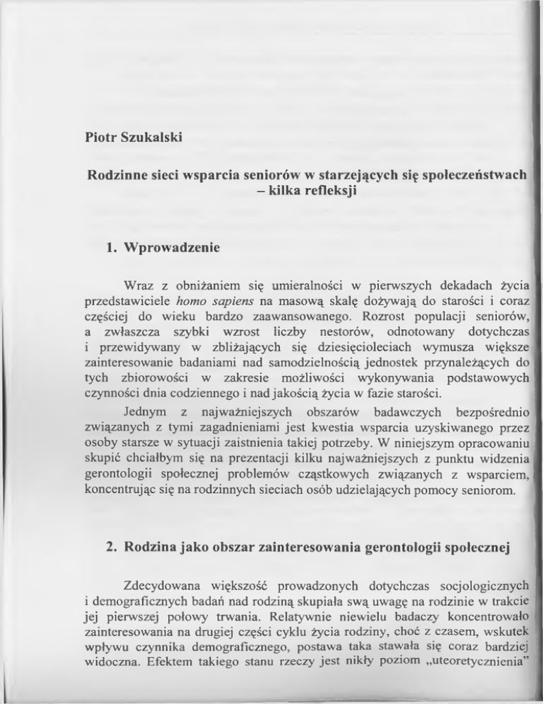 Piotr Szukalski R odzinne sieci wsparcia seniorów w starzejących się społeczeństwach - kilka refleksji 1. W prowadzenie Wraz z obniżaniem się umieralności w pierwszych dekadach życia przedstawiciele homo sapiens na masową skalę dożywają do starości i coraz częściej do wieku bardzo zaawansowanego. Rozrost populacji seniorów, a zwłaszcza szybki wzrost liczby nestorów, odnotowany dotychczas i przewidywany w zbliżających się dziesięcioleciach wymusza większe zainteresowanie badaniami nad samodzielnością jednostek przynależących do tych zbiorowości w zakresie możliwości wykonywania podstawowych czynności dnia codziennego i nad jakością życia w fazie starości. Jednym z najważniejszych obszarów badawczych bezpośrednio związanych z tymi zagadnieniami jest kwestia wsparcia uzyskiwanego przez osoby starsze w sytuacji zaistnienia takiej potrzeby. W niniejszym opracowaniu skupić chciałbym się na prezentacji kilku najważniejszych z punktu widzenia gerontologii społecznej problemów cząstkowych związanych z wsparciem, koncentrując się na rodzinnych sieciach osób udzielających pomocy seniorom. 2. Rodzina jako obszar zainteresowania gerontologii społecznej Zdecydowana większość prowadzonych dotychczas socjologicznych i demograficznych badań nad rodziną skupiała swą uwagę na rodzinie w trakcie jej pierwszej połowy trwania. Relatywnie niewielu badaczy koncentrowało zainteresowania na drugiej części cyklu życia rodziny, choć z czasem, wskutek wpływu czynnika demograficznego, postawa taka stawała się coraz bardziej widoczna. Efektem takiego stanu rzeczy jest nikły poziom „uteoretycznienia” Rodzinne sieci wsparcia seniorów w starzejących się społeczeństwach.. tych nielicznych badań, tj. włączenia ich w szersze teoretyczne ramy głównych koncepcji funkcjonujących w socjologii rodziny. Podejścia te skądinąd koncentrują się zazwyczaj na rodzinie nuklearnej, a dokładniej na współczesnej miejskiej rodzinie, co pociąga za sobą znaczące pomniejszenie zainteresowania strukturami wielopokoleniowymi i generalnie pozanukleamymi. Jest to zgodne z dominującym w tradycji socjologicznej podejściem koncentrującym się na rodzinie skupionej wokół pary małżeńskiej, z pozostawieniem na boku rodziny rozszerzonej zarówno „tradycyjnej” (zamieszkujące wspólnie, spokrewnione rodziny nuklearne), jak i „zmodyfikowanej” (zespół krewnych i powinowatych rozmieszczonych, mieszkających oddzielnie, niekiedy w dużej odległości). Stosunkowo liczne badania nad drugą częścią życia rodziny prowadzone w środowisku gerontologów zogniskowane są z reguły wokół konkretnych problemów, zagadnień związanych z próbą zrozumienia i rozwiązania występujących w ocenie badaczy nieprawidłowości postępowania członków rodziny z wchodzącym w jej skład seniorem, przede wszystkim z osobą chorą, niepełnosprawną a stąd i wymagającą wsparcia ze strony bliskich. Podejście takie automatycznie pozostawia na marginesie zainteresowań badawczych rodziny „normalne” (tj. takie, w których przywołane przypadki różnorakich deficytów, upośledzeń nie występują) oraz zdrowych i pełnosprawnych seniorów, rzadko kiedy przy tym osadzając uzyskane rezultaty w szerszych teoretycznych ramach (zob. szerszą dyskusję na ten temat (Cohler, Altergott 1995). Brak umocowania teoretycznego to skądinąd zarzut dotyczący generalnie badań z zakresu gerontologii społecznej, niezależnie od tego, czy skoncentrowanych na rodzinie, czy na innych instytucjach społecznych, czy sferach życia (przykładowo badania prowadzone w latach 90. wskazywały, że w 80% artykułów publikowanych w czołowych, anglojęzycznych czasopismach gerontologicznych brak jest jakiegokolwiek odwołania do teorii) (Hagestad, Dannefer 2001: 4). Socjologowie rodziny uw ażają iż dotychczasowe badania nad rodziną prowadzone przez gerontologów układały się w cztery odrębne etapy (Marshall i wsp. 1993). Na samym początku dominowało podejście skupiające się na utracie przez osoby stare ról społecznych i postępującej z wiekiem i biegiem czasu izolacji seniorów od życia rodzinnego. Następnie uwaga była skoncentrowana na procesach wymiany, funkcjonalnej solidarności jako wyrazie adaptacyjności rodziny jako instytucji do wymagań współczesności. Na kolejnym etapie badacze skupiali swą uwagę na solidarności rodziny, wyróżniając jej sześć typów (norm atywną uczuciow ą funkcjonalną, strukturalną solidarność związku i zgodności) i próbując dokonać całościowej, Wielowymiarowej oceny relacji międzypokoleniowych w rodzinie. Wreszcie ostatni, obecny etap zdominowany został przez dyskusję na temat udzielania Piotr Szukalski i otrzymywania pomocy w ramach rodziny (family caregiving) ze szczególnym uwzględnieniem podstawowych opiekunów i psychiczno-ekonomicznego obciążenia opiekuna (caregiver burden). Osobiście dodałbym piąty najnowszy etap - w ostatnich latach widoczne są w literaturze przedmiotu tendencje do stosowania holistycznego, eklektycznego podejścia, wpisywanego w szersze ramy badań nad integracją międzypokoleniową kształtowaniem się relacji intergeneracyjnych na różnych płaszczyznach. Do tego nurtu zaliczyć można np. prace I. A. Connidis (2001) czy Grundy E. (2004). Pośrednio na rozpowszechnienie tego podejścia wskazywałyby przywołane już wyniki badań G. O. Hagestad i D. Dannefer (2001), mówiące o „awersji” gerontologów do teorii. Większość badaczy bowiem w praktyce tworzy swoistą miksturę z dostępnych teoretycznych składników, którą uznaje za najbardziej odpowiadającą do realizacji swych badań. 3. D em ograficzne zm iany rodziny - konsekwencje dla jej potencjału pielęgnacyjnego Rodzina jako potencjalna sieć wsparcia jest strukturą dynamiczną. Zmieniają się - dostosowując do wymagań otoczenia - nie tylko jej funkcje, ale również i struktura demograficzna.