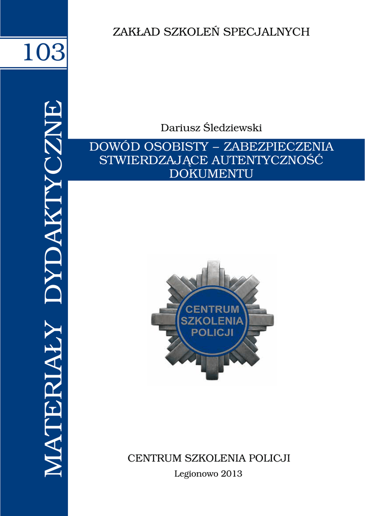 MATERIAŁY DYDAKTYCZNE 103 Zakład Szkoleń Specjalnych ZAKŁAD SZKOLEŃ SPECJALNYCH Dariusz Śledziewski DOWÓD OSOBISTY – ZABEZPIECZENIA STWIERDZAJĄCE AUTENTYCZNOŚĆ DOKUMENTU CENTRUM SZKOLENIA POLICJI Legionowo 2013 1 Zakład Szkoleń Specjalnych Zdjęcia: podkom. Waldemar Weremko Zakład Szkoleń Specjalnych Korekta, skład i druk: Wydział Wydawnictw i Poligrafii Centrum Szkolenia Policji w Legionowie 2 Nakład 50 egz. Zakład Szkoleń Specjalnych Spis treści Wstęp ......................................................................................................................................... 5 I. Zabezpieczenia stwierdzające autentyczność dowodu osobistego . ....................................... 7 1. Personalizacja . ................................................................................................................ 8 2. Zmienny poziom grawerowania . .................................................................................... 9 3. Kinegram . ....................................................................................................................... 9 4. Mikrodruk....................................................................................................................... 10 5. Efekt CLI . ..................................................................................................................... 11 6. Efekt kineprint . ............................................................................................................. 11 7. Farba zmienna optycznie . ............................................................................................. 12 8. Rysunek utajony ............................................................................................................ 12 9. Znaki alfabetu Braille’a . ............................................................................................... 13 10. Linie rozetowe . ............................................................................................................. 13 11. Nitka .............................................................................................................................. 14 12. Elementy widoczne w promieniach UV ....................................................................... 15 13. Tło dokumentu .............................................................................................................. 16 Literatura . ................................................................................................................................ 17 3 Zakład Szkoleń Specjalnych 4 Zakład Szkoleń Specjalnych WSTĘP Policjanci w ramach ustawowych uprawnień mają prawo legitymowania osób w celu ustalenia ich tożsamości. Jest to podstawowa czynność policjanta pełniącego służbę. Najczęściej stosowanym sposobem ustalenia tożsamości osoby podczas czynności legitymowania jest weryfikacja danych osobowych na podstawie dokumentu. Zgodnie z § 4 rozporządzenia Rady Ministrów z dnia 8 lutego 2005 r. w sprawie sposobu postępowania przy wykonywaniu niektórych uprawnień Policji oraz wzorów dokumentów stosowanych w tych sprawach policjant ustala tożsamość osoby legitymowanej na podstawie: 1)dowodu osobistego, 2)paszportu, 3)zagranicznego dokumentu tożsamości, 4)innego niebudzącego wątpliwości dokumentu zaopatrzonego w fotografię i oznaczonego numerem lub serią, 5)oświadczenia osoby, której tożsamość została ustalona na podstawie dokumentów, o których mowa w pkt 1–4, 6) telefonicznego lub osobistego porozumienia się z osobą wskazaną przez osobę legitymowaną. Obowiązek posiadania dowodu osobistego mają między innymi obywatele polscy zamieszkujący na terenie Rzeczypospolitej Polskiej (ustawa z dnia 10 kwietnia 1974 r. o ewidencji ludności i dowodach osobistych – Dz. U. z 2006 r. Nr 139, poz. 993, z późn. zm.). Jest to dokument, którym najczęściej legitymują się obywatele RP na terenie kraju. Na jego podstawie można bezwzględnie ustalić tożsamość osoby. Próby ukrycia swojej tożsamości przez osoby będące w konflikcie z prawem niosą za sobą potrzebę poznania zabezpieczeń stosowanych w dowodzie osobistym, w celu weryfikacji jego autentyczności i co się z tym wiąże – tożsamości osoby. W niniejszej publikacji przedstawiono zagadnienia związane z zabezpieczeniami występującymi w dowodzie osobistym, sposobami ich weryfikacji z pozycji osoby ustalającej dane personalne osoby legitymowanej i możliwościami potwierdzenia autentyczności dokumentu na podstawie tych zabezpieczeń. 5 Zakład Szkoleń Specjalnych 6 Zakład Szkoleń Specjalnych I. ZABEZPIECZENIA STWIERDZAJĄCE AUTENTYCZNOŚĆ DOWODU OSOBISTEGO Nowy wzór dowodu osobistego został wprowadzony do użytku 1 stycznia 2001 r. Jest to najważniejszy dokument, jakim posługują się obywatele Rzeczypospolitej Polskiej. Dokument ten pozwala na jednoznaczne zidentyfikowanie jego posiadacza i jednocześnie w sposób trwały chroni zamieszczone w nim dane przed celowym lub przypadkowym zniszczeniem. Nowy dowód osobisty swym wyglądem zewnętrznym przypomina kartę kredytową. Producent zadbał, by ten nowoczesny dokument był dobrze zabezpieczony, a także by część tych zabezpieczeń była możliwa do prostej, a zarazem dyskretnej, kontroli. Awers Rewers Dowód osobisty ma postać wielowarstwowej karty poliwęglanowej o wymiarach 86×54 mm, zawierającej podstawowe informacje o jej posiadaczu, dacie wydania, organie wydającym i terminie ważności. Informacje zapisane są zarówno w sposób jawny, jak i zakodowany. Numer „plastikowego” dowodu osobistego składa się z trzech liter i sześciu cyfr, z których jedna (pierwsza cyfra) to cyfra kontrolna. Dowód posiada wiele nowoczesnych zabezpieczeń, które gwarantują autentyczność dokumentu, w znaczącym stopniu utrudniają jego sfałszowanie, a jednocześnie ułatwiają sprawdzenie, czy dokument jest prawdziwy. Do podstawowych