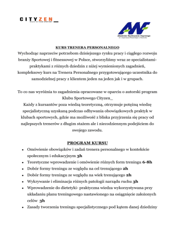 KURS TRENERA PERSONALNEGO Wychodząc naprzeciw potrzebom dzisiejszego rynku pracy i ciągłego rozwoju branży Sportowej i fitnessowej w Polsce, stworzyliśmy wraz ze specialistamipraktykami z różnych dziedzin z niżej wymienionych zagadnień, kompleksowy kurs na Trenera Personalnego przygotowującego uczestnika do samodzielnej pracy z klientem jeden na jeden jak i w grupach. To co nas wyróżnia to zagadnienia opracowane w oparciu o autorski program Klubu Sportowego Cityzen_ Każdy z kursantów poza wiedzą teoretyczną, otrzymuje potężną wiedzę specjalistyczną uzyskaną podczas odbywania obowiązkowych praktyk w klubach sportowych, gdzie ma możliwość z bliska przyjrzenia się pracy od najlepszych trenerów z długim stażem ale i niecodziennym podejściem do swojego zawodu. PROGRAM KURSU Omówienie obowiązków i zadań trenera personalnego w kontekście społecznym i edukacyjnym 3h Teoretyczne wprowadzenie i omówienie różnych form treningu 6-8h Dobór formy treningu ze względu na cel trenującego 2h Dobór formy treningu ze względu na wiek trenującego 2h Wykrywanie i eliminacja różnych patologii narządu ruchu 3h Wprowadzenie do dietetyki- praktyczna wiedza wykorzystywana przy układaniu planu treningowego nastawionego na osiągnięcie założonych celów 3h Zasady tworzenia treningu specjalistycznego pod kątem danej dziedziny sportowej 4 h Nauka budowania więzi i relacji na linii Trener-klient 2h Zasady wplatania odnowy biologicznej w trening i jego wpływ na organizm 2h Zyskasz praktyczną wiedzę na temat: Treningu funkcjonalnego Treningu wytrzymałościowego treningu siłowego Treningu Cardio Treningu korekcyjnego TRX Treningu nastawionego na uelastycznienie Prioprocepcji Szerokiego postrzegania Czucia głębokiego Nowoczesnych form ruchu: Bodybar, BallShape, BodyCross, AquaSport Dietetyki z wstępem do suplementacji Treningu specjalistycznego dedykowanego pod daną dyscypline sportową Wprowadzenie do Bio-regeneracji CZAS TRWANIA KURSU: od 1-2 miesięcy, zjazdy (sobota-niedziela) 45 godzin zajęć praktycznych połączonych z praktykami w klubie sportowym 30 godzin to wykłady-zajęcia teoretyczne Uczestnicy Kursu po pozytywnym zdaniu egzaminu otrzymują Certyfikat AWF i Cityzen „Trener Personalny”. KOSZT KURSU: 1500 zł.