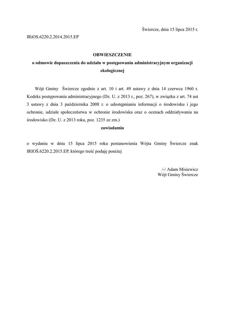 Świercze, dnia 15 lipca 2015 r. IRiOS.6220.2.2014.2015.EP OBWIESZCZENIE o odmowie dopuszczenia do udziału w postępowaniu administracyjnym organizacji ekologicznej Wójt Gminy Świercze zgodnie z art. 10 i art. 49 ustawy z dnia 14 czerwca 1960 r. Kodeks postępowania administracyjnego (Dz. U. z 2013 r., poz. 267), w związku z art. 74 ust 3 ustawy z dnia 3 października 2008 r. o udostępnianiu informacji o środowisku i jego ochronie, udziale społeczeństwa w ochronie środowiska oraz o ocenach oddziaływania na środowisko (Dz. U. z 2013 roku, poz. 1235 ze zm.) zawiadamia o wydaniu w dniu 15 lipca 2015 roku postanowienia Wójta Gminy Świercze znak IRIOŚ.6220.2.2015.EP, którego treść podaję poniżej /-/ Adam Misiewicz Wójt Gminy Świercze Świercze, dnia 2015.07.15 IRiOŚ.6220.2.2015.EP POSTANOWIENIE Na podstawie art. 44 ust. 1 i 4 ustawy z dnia 3 października 2008 roku o udostępnianiu informacji o środowisku i jego ochronie, udziale społeczeństwa w ochronie środowiska oraz o ocenach oddziaływania na środowisko ( Dz. U. z 2013 r., poz. 1235 z późn. zm.) i stosownie z art. 123 ustawy z dnia 14 czerwca 1960 roku - Kodeks postępowania administracyjnego (tekst jednolity: Dz. U. z 2013 r. poz. 267 ze zm.), po rozpatrzeniu wniosku złożonego przez Stowarzyszenie Na Rzecz Wspomagania Społeczności Lokalnych i Ochrony oraz Odtwarzania Środowiska Naturalnego RZEKOTKA, Wyrzyki 9, 06-150 Świercze o dopuszczenie do udziału na prawach strony w postępowaniu prowadzonym przez Wójta Gminy Świercze w sprawie wydania decyzji o środowiskowych uwarunkowaniach postanawiam odmówić dopuszczenia Stowarzyszenia Na Rzecz Wspomagania Społeczności Lokalnych i Ochrony oraz Odtwarzania Środowiska Naturalnego RZEKOTKA, Wyrzyki 9, 06-150 Świercze do udziału na prawach strony w postępowaniu z wniosku Alma Viento Sp. z o.o. ul. Chełmońskiego 12/1, 05-300 Mińsk Mazowiecki w sprawie wydania decyzji o środowiskowych uwarunkowaniach zgody na realizację przedsięwzięcia polegającego na budowie elektrowni wiatrowej wraz z infrastrukturą towarzyszącą na działce oznaczonej nr ew. 94/1 w obrębie miejscowości Wyrzyki, gmina Świercze. UZASADNIENIE Pismem z dnia 29 czerwca 2015 roku Stowarzyszenie Na Rzecz Wspomagania Społeczności Lokalnych i Ochrony oraz Odtwarzania Środowiska Naturalnego RZEKOTKA, Wyrzyki 9, 06-150 Świercze, zwróciło się do Wójta Gminy Świercze o dopuszczenie na prawach strony do udziału w postępowaniu z wniosku Alma Viento Sp. z o.o. ul. Chełmońskiego 12/1, 05300 Mińsk Mazowiecki w sprawie wydania decyzji o środowiskowych uwarunkowaniach zgody na realizację przedsięwzięcia polegającego na budowie elektrowni wiatrowej wraz z infrastrukturą towarzyszącą na działce oznaczonej nr ew. 94/1 w obrębie miejscowości Wyrzyki, gmina Świercze. Dopuszczenie do udziału w postępowaniu administracyjnym na prawach strony reguluje art. 31 kpa. Zgodnie z art. 31 ust. 1 kpa organizacja społeczna może występować z żądaniem dopuszczenia jej do udziału w postępowaniu w sprawie dotyczącej innej osoby, jeżeli jest to uzasadnione celami statutowymi tej organizacji oraz jeżeli przemawia za tym interes społeczny. Szczegółowe regulacje dotyczące dopuszczenia do udziału w postępowaniu na prawach strony organizacji społecznych zawierają przepisy ustawy ooś. Przepisy te dotyczą dopuszczenia organizacji ekologicznych ( a więc tych, których statutowym celem jest ochrona środowiska ) do udziału w postępowaniu wymagającym udziału społeczeństwa. Zgodnie z art. 79 ust. 1 ustawy ooś, w przypadku postępowania w sprawie wydania decyzji o środowiskowych uwarunkowaniach, postępowanie z udziałem społeczeństwa przeprowadza się jedynie w ramach oceny oddziaływania na środowisko. Art. 44 ust. 1 ustawy ooś, stanowi iż: „ Organizacje ekologiczne, które powołując się na swoje cele statutowe, zgłoszą chęć uczestniczenia w określonym postępowaniu wymagającym udziału społeczeństwa, uczestniczą w nim na prawach strony, jeżeli prowadzą działalność statutową w zakresie ochrony środowiska lub ochrony przyrody, przez minimum 12 miesięcy przed dniem wszczęcia tego postępowania. Organizacja społeczna może brać udział w postępowaniu administracyjnym na prawach strony, jeżeli spełnione są łącznie następujące przesłanki: 1. jest to uzasadnione celami statutowymi organizacji ekologicznej, 2. postępowanie prowadzone jest udziałem społeczeństwa, 3. jeżeli prowadzą działalność statutową w zakresie ochrony środowiska lub ochrony przyrody, przez minimum 12 miesięcy przed dniem wszczęcia postępowania. W rozpatrywanej sprawie cele statutu umożliwiają udział Stowarzyszenia w postępowaniu gdyż, ust. 4 pkt. 1 Regulaminu, stanowi – celem Stowarzyszenia jest zachowanie, ochrona i odtwarzanie środowiska naturalnego. Druga z przesłanek tj. postępowanie prowadzone jest z udziałem społeczeństwa - brak na dzień 15 lipca 2015 roku obwieszczenia Wójta. Natomiast trzecia z przesłanek – działalność statutowa winna być prowadzona minimum 12 miesięcy przed dniem wszczęcia tego postępowania nie jest przez Stowarzyszenie spełniona, gdyż zgodnie z przedłożoną kopią regulaminu Stowarzyszenia Na Rzecz Wspomagania Społeczności Lokalnych i Ochrony oraz Odtwarzania Środowiska Naturalnego RZEKOTKA, zebranie założycielskie miało miejsce 12 października 2014 roku, natomiast postępowanie w przedmiotowej sprawie toczy się od dnia 02 czerwca 2015 roku. Wobec powyższego w opinii Wójta Gminy Świercze wystąpienie Stowarzyszenia o dopuszczenie do udziału na prawach strony w postępowaniu w sprawie wydania decyzji o środowiskowych uwarunkowaniach dla przedsięwzięcia pn.: „ Budowa elektrowni wiatrowej wraz z infrastrukturą towarzyszącą na działce oznaczonej nr 94/1 w obrębie miejscowości Wyrzyki” na wniosek Alma Viento Sp.z o.o. ul. Chełmońskiego 12/1, 05-300 Mińsk jest nieuzasadnione