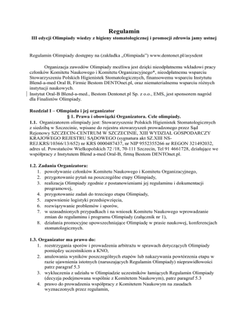 Regulamin III edycji Olimpiady wiedzy z higieny stomatologicznej i promocji zdrowia jamy ustnej Regulamin Olimpiady dostępny na (zakładka „Olimpiada”) www.dentonet.pl/asysdent Organizacja zawodów Olimpiady możliwa jest dzięki nieodpłatnemu wkładowi pracy członków Komitetu Naukowego i Komitetu Organizacyjnego*, nieodpłatnemu wsparciu Stowarzyszeniu Polskich Higienistek Stomatologicznych, finansowemu wsparciu Instytutu Blend-a-med Oral B, Firmie Bestom DENTOnet.pl, oraz niematerialnemu wsparciu różnych instytucji naukowych. Instytut Oral-B Blend-a-med., Bestom Dentonet.pl Sp. z o.o., EMS, jest sponsorem nagród dla Finalistów Olimpiady. Rozdział I – Olimpiada i jej organizator § 1. Prawa i obowiązki Organizatora. Cele olimpiady. 1.1. Organizatorem olimpiady jest: Stowarzyszenie Polskich Higienistek Stomatologicznych z siedzibą w Szczecinie, wpisane do rejestru stowarzyszeń prowadzonego przez Sąd Rejonowy SZCZECIN-CENTRUM W SZCZECINIE, XIII WYDZIAŁ GOSPODARCZY KRAJOWEGO REJESTRU SĄDOWEGO (sygnatura akt SZ.XIII NSREJ.KRS/10366/13/652) nr KRS 0000487437, nr NIP 9552355266 nr REGON 321492032, adres ul. Powstańców Wielkopolskich 72 /18, 70-111 Szczecin, Tel 91 4661728, działające we współpracy z Instytutem Blend a-med Oral-B, firmą Bestom DENTOnet.pl. 1.2. Zadania Organizatora: 1. powoływanie członków Komitetu Naukowego i Komitetu Organizacyjnego, 2. przygotowanie pytań na poszczególne etapy Olimpiady, 3. realizacja Olimpiady zgodnie z postanowieniami jej regulaminu i dokumentacji programowej, 4. przygotowanie zadań do trzeciego etapu Olimpiady, 5. zapewnienie logistyki przedsięwzięcia, 6. rozwiązywanie problemów i sporów, 7. w uzasadnionych przypadkach i na wniosek Komitetu Naukowego wprowadzanie zmian do regulaminu i programu Olimpiady (załącznik nr 1), 8. działania promocyjne upowszechniające Olimpiadę w prasie naukowej, konferencjach stomatologicznych. 1.3. Organizator ma prawo do: 1. rozstrzygania sporów i prowadzenia arbitrażu w sprawach dotyczących Olimpiady pomiędzy uczestnikiem a KNO, 2. anulowania wyników poszczególnych etapów lub nakazywania powtórzenia etapu w razie ujawnienia istotnych (naruszających Regulamin Olimpiady) nieprawidłowości patrz paragraf 5.3 3. wykluczenia z udziału w Olimpiadzie uczestników łamiących Regulamin Olimpiady (decyzja podejmowana wspólnie z Komitetem Naukowym), patrz paragraf 5.3 4. prawo do prowadzenia współpracy z Komitetem Naukowym na zasadach wyznaczonych przez regulamin, 5. reprezentowania Olimpiady w mediach, prasie. 1.4. Cele Olimpiady 1. jednoczenie słuchaczy i wspieranie w kształceniu przeddyplomowym społeczności higienistek stomatologicznych, 2. mobilizowanie do pogłębiania wiedzy z zakresu higieny stomatologicznej i promocji zdrowia jamy ustnej poprzez rywalizację wśród słuchaczy policealnych szkół medycznych higienistek stomatologicznych. 3. podnoszenie na wyższy poziom kwalifikacji zawodowych absolwentów kierunku higienistka stomatologiczna w policealnych szkołach medycznych publicznych i niepublicznych § 2. Struktura organizacyjna Olimpiady 2.1. Olimpiada jest oparta na modelu scentralizowanym. Za poziom merytoryczny Olimpiady odpowiedzialny jest Komitet Naukowy Olimpiady, a za organizację poszczególnych etapów odpowiedzialny jest Komitet Organizacyjny Olimpiady. 1. Komitet Organizacyjny Olimpiady*(KOO) wybrany jest przez Organizatorów i współorganizatorów. 2. Komitet Naukowy Olimpiady* (KNO) oraz jego Przewodniczący powoływany jest przez Organizatorów Olimpiady. 3. KNO decyduje o stronie merytorycznej Olimpiady, układa zadania, przyznaje tytuły finalistów i laureatów, rozstrzyga odwołania. 4. KNO podejmuje decyzje zwykłą większością głosów w obecności przynajmniej 50% członków. W przypadku równej liczby głosów rozstrzyga głos Przewodniczącego. 5. W przypadku, gdy zebranie się KNO nie jest możliwe, a podjęcie decyzji jest konieczne, prawomocne decyzje może podjąć trzech spośród następujących członków KNO: Przewodniczący, Zastępca Przewodniczącego, Kierownik Organizacyjny, Sekretarz naukowy do spraw zadań teoretycznych i praktycznych. Decyzje podjęte w tym trybie nie mogą dotyczyć kwalifikacji do zawodów III stopnia oraz przyznawania tytułów laureata. 6. Posiedzenia KNO w sprawach związanych z zatwierdzaniem zadań wszystkich stopni, kryteriami ocen, kwalifikacją do zawodów III stopnia, przyznawaniem tytułów, ujawnianiem nazwisk autorów prac i odwołaniami są protokołowane - w czasie trwania olimpiady do dnia 09.04.2017 roku. 7. W przypadku nieobecności Przewodniczącego wszystkie jego funkcje sprawuje Zastępca Przewodniczącego. Posiedzenia KNO może prowadzić również członek KOO wyznaczony przez Przewodniczącego KNO. Rozdział II – Organizacja Olimpiady § 3. Uczestnicy Olimpiady 3.1 Uczestnikami Olimpiady mogą być uczniowie szkół medycznych policealnych, publicznych i niepublicznych o uprawnieniach szkół publicznych, kształcących na kierunku: higienistka stomatologiczna, będących na pierwszym i drugim roku nauki. 3.2. W indywidualnych przypadkach KNO może wyrazić zgodę i ustalić zasady organizacyjne udziału w Olimpiadzie uczniów nie będących obywatelami Rzeczypospolitej Polskiej oraz uczniów mających obywatelstwo RP, ale będących uczniami szkół zlokalizowanych poza terytorium RP. Zasady te nie mogą naruszać niniejszego regulaminu, ani wymagań merytorycznych obowiązujących uczniów szkół krajowych mających obywatelstwo polskie. 3.3. By wziąć udział w Olimpiadzie Uczestnik powinien zgłosić swój udział na stronie internetowej www.dentonet.pl/asysdent – zakładka OLIMPIADA. Zgłoszenie uczestnika w Olimpiadzie jest bezpłatne. Terminy patrz Załącznik nr 1. 3.4. Uczestnicy zobowiązani są do: 1. przestrzegania regulaminu i programu (załącznik nr 1) Olimpiady, 2. informowania Komitetu Naukowego oraz Komitetu Organizacyjnego o swoich zastrzeżeniach t