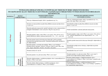 WYMAGANIA EDUKACYJNE DLA UCZNÓW KLASY TRZECIEJ W ROKU SZKOLNYM 2013/2014 PO UKOŃCZENIU KLASY TRZECIEJ UCZEŃ POSIADA NASTĘPUJĄCE UMIEJĘTNOŚCI W POSZCZEGOLNYCH OBSZARACH JĘZYKOWYCH: Funkcje językowe JĘZYK I UMIEJĘTNOŚCI Materiał leksykalnogramatyczny Hello Bugs! ROZDZIAŁ POZIOM PODSTAWOWY CZYNNOŚCI UCZNIA: POZIOM PONADPODSTAWOWY CZYNNOŚCI UCZNIA: Wita się z bohaterami książki: Hello! i przedstawia się: I’m… Wita się z bohaterami książki: Hello! i przedstawia się: I’m…, pyta o ich imię: What’s your name? Powtarza za nauczycielem na jaka literę alfabetu zaczyna się dane słowo: C is for cow. Samodzielnie podaje na jaką literę alfabetu zaczyna się dane słowo: C is for cow. Rozumie polecenia nauczyciela i potrafi wykonać je wraz z nauczycielem i kolegami /koleżankami: Listen and point, Sing the song and say. Potrafi samodzielnie wykonać polecenia nauczyciela. Rozumie pytania o imię i wiek: What’s your name?, How old are you? i potrafi dokończyć zdania z pomocą nauczyciela: I’m…, I’m …years old. Rozumie pytania o imię i wiek: What’s your name?, How old are you? i potrafi samodzielnie na nie odpowiedzieć: I’m…, I’m …years old. Rozumie pytania nauczyciela dotyczące historyjki, jeżeli są poparte pomocniczymi gestami nauczyciela i obrazkami podręcznika i próbuje na nie odpowiedzieć. Rozumie pytania nauczyciela dotyczące historyjki i odpowiada na nie. Rozumie pytanie, o to kiedy ma urodziny: When’s your birthday? Powtarza nazwy miesięcy: January, February, March, April, May, June, July, August, September, October, November, December. Samodzielnie podaje nazwy miesięcy, odpowiada na pytanie nauczyciela. Powtarza liczby od 1 do 20. Samodzielnie liczy od 1 do 20. Rozumie pytanie o to, jak ma na imię: What’s your name? Rozumie pytanie o to, jak ma na imię: What’s your name? i potrafi na nie odpowiedzieć pełnym zdaniem: I’m … Rozumie zdania pytające z zaimkiem pytajnym what i czasownikiem be w formie is: What’s your name? Rozumie zdania zdania pytające z zaimkiem pytającym when i czasownikiem be w formie is: When’s your birthday? Rozumie zdania pytające z zaimkiem pytajnym what i czasownikiem be w formie is: What’s your name? i potrafi na nie odpowiedzieć: I’m … Rozumie zdania pytające z zaimkiem pytającym when i czasownikiem be w formie is: When’s your birthday? i potrafi na nie samodzielnie odpowiedzieć. Inne umiejętności Potrafi zapisać wybrane liczby. Potrafi zapisać wybrane liczby i podyktować je koledze lub koleżance. Rozumie tryb rozkazujący i instrukcje. Rozumie tryb rozkazujący i instrukcje oraz próbuje sam je wydawać. Rozumie znaczenie zaimka pytajnego how w pytaniach z czasownikiem be: How old are you?, jeśli pytania są poparte pomocniczymi gestami. Rozumie znaczenie zaimka pytajnego what w pytaniach z czasownikiem be: What day is it?, What’s your name? Rozumie i potrafi dokończyć zdanie z czasownikiem be w formie is: C is for cow. Potrafi samodzielnie zbudować zdanie z czasownikiem be w formie is: C is for cow. Wykonuje odpowiednie czynności do słów piosenek: The Bug Hello Song, Goodbye Song, The Bugs Alphabet Song, Wykonuje odpowiednie czynności do słów piosenek: The Bug Hello Song, Goodbye Song, The Bugs Alphabet Song i próbuje śpiewać wraz z nagraniem. Z pomocą nauczyciela określa, jaki jest miesiąc. Samodzielnie potrafi określić, jaki jest miesiąc. Z pomocą nauczyciela określa kolory. Samodzielnie potrafi określić kolory. Wykonuje klasowy kalendarz urodzinowy. Wykonuje klasowy kalendarz urodzinowy i nazywa wszystkie miesiące. Rozumie zasady gry: Strat back after summer i bierze w niej udział. Rozumie zasady gry: Strat back after summer, potrafi wykorzystać podczas gry poznane słownictwo. Literuje wyrazy z pomocą nauczyciela. Samodzielnie literuje wyrazy. ROZDZIAŁ JĘZYK I UMIEJĘTNOŚCI POZIOM PODSTAWOWY CZYNNOŚCI UCZNIA: Potrafi dopasować karty wyrazowe z nazwami przedmiotów w klasie do kart obrazkowych z pomocą nauczyciela. Funkcje językowe Materiał leksykalnogramatyczny 1. Archie’s Pet. Rozumie pytania o to, jaki przedmiot: What is it? i potrafi dokończyć zdanie z pomocą nauczyciela: It’s notebook/ruler/pen/school bag/desk/ chair. Potrafi określić położenie przedmiotów. POZIOM PONADPODSTAWOWY CZYNNOŚCI UCZNIA: Potrafi dopasować i nazwać wszystkie karty wyrazowe z nazwami przedmiotów w klasie do kart obrazkowych, używa słownictwa związanego z przedmiotami w klasie. Rozumie pytania o to, jaki przedmiot: What is it? i potrafi dokończyć zdanie: It’s notebook/ruler/pen/school bag/desk/chair. Samodzielnie określa położenie wszystkich przedmiotów.. Rozumie treść historyjki Archie’s pet, potrafi ustalić kolejność wydarzeń na podstawie słuchanego tekstu i ilustracji, odpowiedzieć na pytania pomocnicze nauczyciela dotyczące historyjki. Rozumie dokładnie pełną treść historyjki Archie’s pet. Potrafi wskazać właściwe rysunki i odpowiedzieć na szczegółowe pytania nauczyciela dotyczące historyjki. Rozumie i odpowiada na pytania nauczyciela dotyczące rymowanki: What is it? i wskazuje przedmioty wymieniane przez nauczyciela. Poznaje nazwy zwierzątek, zapamiętuje ich nazwy: hamster, dog, tortoise, bird, fish, grasshopper. Rozumie i potrafi odpowiedzieć na wszystkie pytania nauczyciela dotyczące rymowanki: What is it? i wskazuje wszystkie przedmioty wymieniane przez nauczyciela. Wykazuje zainteresowanie światem przyrody, bezbłędnie nazywa zwierzątka, rozróżnia je i potrafi opisać. Rozumie polecenia wydawane przez nauczyciela podczas zabawy kartami wyrazowymi. Rozumie i wykonuje polecenia wydawane przez nauczyciela podczas zabawy kartami wyrazowymi. Rozumie zdania pytające z zaimkiem pytającym where i czasownikiem be w formie is: Where is it? Rozumie zdania pytające z zaimkiem pytającym where i czasownikiem be w formie is: Where is it? i potrafi na nie samodzielnie odpowiedzieć. 