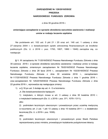 ZARZĄDZENIE Nr 129/2016/DSOZ PREZESA NARODOWEGO FUNDUSZU ZDROWIA z dnia 30 grudnia 2016 r. zmieniające zarządzenie w sprawie określenia warunków zawierania i realizacji umów w rodzaju leczenie szpitalne Na podstawie art. 102 ust. 5 pkt 21 i 25 oraz art. 146 ust. 1 ustawy z dnia 27 sierpnia 2004 r. o świadczeniach opieki zdrowotnej finansowanych ze środków publicznych (Dz. U. z 2016 r. poz. 1793, 1807, 1860 i 1948) zarządza się, co następuje: § 1. W zarządzeniu Nr 71/2016/DSOZ Prezesa Narodowego Funduszu Zdrowia z dnia 30 czerwca 2016 r. w sprawie określenia warunków zawierania i realizacji umów w rodzaju leczenie szpitalne, zmienionym zarządzeniem Nr 79/2016/DSOZ Prezesa Narodowego Funduszu Zdrowia z dnia 28 lipca 2016 r., zarządzeniem Nr 102/2016/DSOZ Prezesa Narodowego Funduszu Zdrowia z dnia 30 września 2016 r., zarządzeniem Nr 117/2016/DSOZ Prezesa Narodowego Funduszu Zdrowia z dnia 1 grudnia 2016 r. oraz zarządzeniem Nr 125/2016/DSOZ Prezesa Narodowego Funduszu Zdrowia z dnia 22 grudnia 2016 r., wprowadza się następujące zmiany: 1) w § 18 po ust. 3 dodaje się ust. 4 - 5 w brzmieniu: „4. Dla świadczeniodawców będących: 1) instytutem, o którym mowa w art. 3 ustawy z dnia 30 kwietnia 2010 r. o instytutach badawczych (Dz. U. z 2016 r. poz. 371, 1079 i 1311); albo 2) podmiotem leczniczym utworzonym i prowadzonym przez uczelnię medyczną w rozumieniu art. 2 ust. 1 pkt 13 ustawy z dnia 15 kwietnia 2011 r. o działalności leczniczej (Dz. U. z 2016 r. poz. 1638); albo 3) podmiotem leczniczym utworzonym i prowadzonym przez Skarb Państwa reprezentowany przez ministra, prowadzącym kształcenie podyplomowe lekarzy udzielających świadczeń świadczeniobiorcom w zakresie kardiologia, wartość produktu rozliczeniowego z katalogu grup (ustalona dla trybu hospitalizacja) dla wskazanego zakresu korygowana jest o współczynnik 1,1. 5. Dla świadczeniodawców udzielających świadczeń w zakresie ortopedia i traumatologia narządu ruchu, którzy w roku kalendarzowym poprzedzającym rok na który obowiązuje współczynnik, zrealizowali co najmniej: 1) 90 pierwotnych całkowitych aloplastyk stawu biodrowego, w sytuacji rozliczania hospitalizacji grupą H13, H14, 2) 60 pierwotnych całkowitych aloplastyk stawu kolanowego, w sytuacji rozliczania hospitalizacji grupą H01, H15, 3) 10 operacji rewizyjnych endoprotezy stawu biodrowego lub kolanowego, w sytuacji rozliczania hospitalizacji grupą H09, H10, H11, H16, H17, H18, H19 - wartość tych produktów rozliczeniowych (ustalona w katalogu grup dla trybu hospitalizacja) korygowana jest o współczynnik 1,2.”; 2) w § 22 w ust. 1 pkt 1 otrzymuje brzmienie: „1) świadczeń, których koszt przekracza wartość 15 000 zł i wartość obliczoną według wzoru: a) K= [3 x (Wg + Wopl)]+ Wtiss + Wdsum albo b) K= (Wg + Wopl)+ Wtiss + Wdsum + 20 000 zł gdzie: K - wartość kryterium umożliwiającego rozliczanie za zgodą płatnika, Wg - wartość JGP dla typu umowy hospitalizacja albo produktu właściwego ze względu na rozliczenie z katalogu produktów odrębnych, Wopl - wartość osobodni finansowanych ponad limit finansowany grupą, Wtiss - wartość świadczeń finansowanych wg skali TISS-28 albo TISS-28 dla dzieci, Wdsum- wartość świadczeń finansowanych produktami z katalogu produktów do sumowania;”; 3) załącznik nr 1a do zarządzenia otrzymuje brzmienie określone w załączniku nr 1 do niniejszego zarządzenia; 4) załącznik nr 1b do zarządzenia otrzymuje brzmienie określone w załączniku nr 2 do niniejszego zarządzenia; 5) załącznik nr 1c do zarządzenia otrzymuje brzmienie określone w załączniku nr 3 do niniejszego zarządzenia; 2 6) załącznik nr 3a do zarządzenia otrzymuje brzmienie określone w załączniku nr 4 do niniejszego zarządzenia; 7) załącznik nr 3b do zarządzenia otrzymuje brzmienie określone w załączniku nr 5 do niniejszego zarządzenia; 8) załącznik nr 9 do zarządzenia otrzymuje brzmienie określone w załączniku nr 6 do niniejszego zarządzenia; 9) dodaje się załącznik nr 16 do zarządzenia w brzmieniu określonym w załączniku nr 7 do niniejszego zarządzenia. § 2. Do postępowań w sprawie zawarcia umów o udzielanie świadczeń opieki zdrowotnej wszczętych i niezakończonych przed dniem wejścia w życie zarządzenia, stosuje się przepisy zarządzenia, o którym mowa w § 1, w brzmieniu obowiązującym przed dniem wejścia w życie niniejszego zarządzenia. § 3. 1. Dyrektorzy oddziałów wojewódzkich Narodowego Funduszu Zdrowia obowiązani są do wprowadzenia do postanowień umów zawartych ze świadczeniodawcami zmian wynikających z wejścia w życie niniejszego zarządzenia. 2. Przepis ust. 1 stosuje się również do umów zawartych ze świadczeniodawcami po zakończeniu postępowań, o których mowa w § 2. § 4. Zarządzenie wchodzi w życie z dniem 1 stycznia 2017 r. p.o. PREZESA NARODOWEGO FUNDUSZ ZDROWIA Zastępca Prezesa ds. Medycznych Andrzej Jacyna 3
