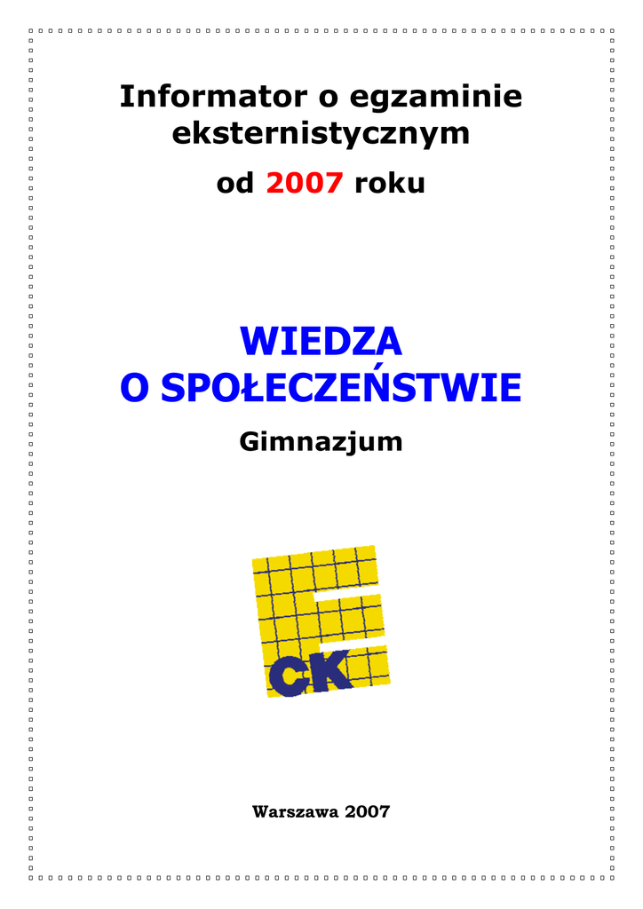 Informator o egzaminie eksternistycznym od 2007 roku WIEDZA O SPOŁECZEŃSTWIE Gimnazjum Warszawa 2007 Opracowano w Centralnej Komisji Egzaminacyjnej we współpracy z Okręgową Komisją Egzaminacyjną w Łomży SPIS TREŚCI I. Informacje ogólne ..................................................................................... 5 II. Standardy wymagań egzaminacyjnych ........................................................ 7 III. Opis egzaminu...................................................................................... 11 IV. Przykładowy arkusz egzaminacyjny.......................................................... 15 3 I. INFORMACJE OGÓLNE Podstawy prawne Egzaminy eksternistyczne, jako sposób uzyskiwania świadectwa ukończenia szkoły, zostały ograniczone do zakresu szkół ogólnokształcących, tj. sześcioletniej szkoły podstawowej, gimnazjum i liceum ogólnokształcącego. Zgodnie z art. 9a ust. 2 i 9c ust. 2 Ustawy z dnia 7 września 1991 r. o systemie oświaty (DzU z 2004 r., nr 256, poz. 2572, z późn. zm.) przygotowanie i przeprowadzanie egzaminów eksternistycznych zostało powierzone Centralnej Komisji Egzaminacyjnej (CKE) i okręgowym komisjom egzaminacyjnym (OKE). Sposób przygotowania i przeprowadzania egzaminów eksternistycznych reguluje Rozporządzenie Ministra Edukacji Narodowej z dnia 18 września 2007 r. w sprawie egzaminów eksternistycznych. Na podstawie tego rozporządzenia CKE i OKE opracowały Procedury organizowania i przeprowadzania egzaminów eksternistycznych z zakresu sześcioletniej szkoły podstawowej dla dorosłych, gimnazjum dla dorosłych, liceum ogólnokształcącego dla dorosłych. Zakres sprawdzanych wiadomości i umiejętności określają standardy wymagań będące podstawą przeprowadzania egzaminów eksternistycznych z zakresu gimnazjum dla dorosłych, które są załącznikiem nr 2 do Rozporządzenia Ministra Edukacji Narodowej z dnia 27 września 2007 r. w sprawie standardów wymagań będących podstawą przeprowadzania egzaminów eksternistycznych. Warunki przystąpienia do egzaminów eksternistycznych Do egzaminów eksternistycznych z zakresu gimnazjum dla dorosłych może przystąpić osoba, która: • ukończyła sześcioletnią szkołę podstawową albo klasę VI lub VII ośmioletniej szkoły podstawowej • ukończyła 18 lat • nie jest uczniem gimnazjum. Osoba, która chce zdawać egzaminy eksternistyczne i spełnia wyżej wymienione warunki, powinna na dwa miesiące przed sesją jesienną lub zimową złożyć w OKE właściwej swemu miejscu zamieszkania: • świadectwo ukończenia odpowiedniej szkoły (sześcioletniej szkoły podstawowej albo klasy VI lub VII ośmioletniej szkoły podstawowej) lub indeks zawierający wpis potwierdzający uzyskanie promocji do klasy VII lub VIII ośmioletniej szkoły podstawowej dla dorosłych 5 • oświadczenie, że nie jest uczniem (słuchaczem) gimnazjum • kserokopię stron dowodu osobistego zawierających datę urodzenia i numer ewidencyjny PESEL • wniosek o dopuszczenie do egzaminu eksternistycznego. Formularz wniosku znajduje się na stronach internetowych CKE i OKE w formie załącznika do procedur. Miesiąc przed rozpoczęciem sesji egzaminacyjnej osoba dopuszczona do egzaminu składa w OKE deklarację, w której wskazuje, z jakich przedmiotów chce zdawać egzaminy w danej sesji i przedkłada dowód opłaty za te egzaminy. Informacji o kosztach egzaminu udziela OKE. 6 II. STANDARDY WYMAGAŃ EGZAMINACYJNYCH Wychowanie obywatelskie I. WIADOMOŚCI Zdający zna podstawowe pojęcia, zjawiska, procesy i wydarzenia z zakresu trzech obszarów tematycznych: 1) społeczeństwo: a) człowiek jako istota społeczna, b) grupa i więzi społeczne, c) normy i wartości jako jedna z podstaw więzi w demokracji, d) cechy narodu, tożsamość narodowa, e) etyka życia publicznego; 2) polityka: a) państwo: typy i funkcje, b) formy państw w Europie, c) obywatel a władza publiczna w systemach totalitarnych, autorytarnych i demokratycznych, d) normy i wartości obowiązujące w systemie totalitarnym i autorytarnym a normy i wartości demokratyczne, e) samorząd terytorialny a władza centralna, f) ustrój, zadania, instytucje i struktura władzy jednostek samorządu terytorialnego, g) służba cywilna i jej rola w utrwalaniu etosu służby publicznej, h) świadomość obywatelska i cnoty obywatelskie, i) stowarzyszenia, partie polityczne, związki zawodowe; 3) prawo: a) Konstytucja Rzeczypospolitej Polskiej jako podstawa ustroju politycznego i społecznego, b) instytucje Rzeczypospolitej Polskiej, c) prawa i obowiązki obywatela, d) reguły działalności publicznej zawarte w Konstytucji Rzeczypospolitej Polskiej i innych aktach prawnych, e) przykłady procedur obowiązujących przy załatwianiu spraw w urzędzie gminy, f) prawa człowieka, ich katalog i systemy ochrony, g) samorządność, procedury demokratyczne, regulacje prawne w życiu szkoły. 7 II. UMIEJĘTNOŚCI Zdający, korzystając z różnych źródeł informacji i posługując się właściwą terminologią, potrafi: 1) rozpoznawać własne prawa i obowiązki; 2) interpretować wydarzenia życia publicznego, wykorzystując wiedzę o zasadach ustroju Rzeczypospolitej Polskiej; 3) formułować własne poglądy; 4) bronić własnego stanowiska, biorąc pod uwagę argumenty strony przeciwnej; 5) rozpoznawać normy i wartości obowiązujące w życiu społecznym; 6) określać konsekwencje łamania procedur demokratycznych; 7) napisać podanie, życiorys, wypełnić proste druki urzędowe; 8) przedstawić najważniejsze etyczne zasady życia publicznego; 9) ocenić wydarzenia polityczne z punktu widzenia zasad życia publicznego obowiązujących w państwie demokratycznym. Wychowanie do aktywnego udziału w życiu gospodarczym I. WIADOMOŚCI Zdający zna podstawowe pojęcia, zjawiska i procesy z zakresu trzech obszarów tematycznych: 1) pieniądz: a) historia pieniądza i jego najważniejsze funkcje, b) zarządzanie własny