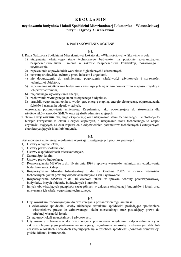 REGULAMIN użytkowania budynków i lokali Spółdzielni Mieszkaniowej Lokatorsko – Własnościowej przy ul. Ogrody 31 w Skawinie I. POSTANOWIENIA OGÓLNE § 1. 1. Rada Nadzorcza Spółdzielni Mieszkaniowej Lokatorsko –Własnościowej w Skawinie w celu: 1) utrzymania właściwego stanu technicznego budynków na poziomie gwarantującym bezpieczeństwo ludzi i mienia w zakresie bezpieczeństwa konstrukcji, pożarowego i użytkowania, 2) zapewnienia odpowiednich warunków higienicznych i zdrowotnych, 3) ochrony środowiska, ochrony przed hałasem i drganiami, 4) nie dopuszczenia do nadmiernego pogorszenia właściwości użytkowych i sprawności technicznej obiektów, 5) zapewnienia użytkowania budynków i znajdujących się w nim pomieszczeń w sposób zgodny z ich przeznaczeniem, 6) racjonalnego wykorzystania energii, 7) zachowania wymaganego stanu estetycznego budynków, 8) prawidłowego zaopatrzenia w wodę, gaz, energię cieplną, energię elektryczną, odprowadzenia ścieków i usuwania odpadów stałych, wprowadza postanowienia niniejszego Regulaminu, jako obowiązujące do stosowania dla użytkowników zasobów SMLW oraz jej służb administracyjnych. 2. Termin użytkowanie obejmuje eksploatację oraz utrzymanie stanu technicznego. Eksploatacja to bieżące korzystanie z lokalu i części wspólnych, a utrzymanie stanu technicznego to zespół czynności mających na celu zapewnienie odpowiednich parametrów technicznych i estetycznych charakteryzujących lokal lub budynek. § 2. Postanowienia niniejszego regulaminu wynikają z następujących podstaw prawnych: 1) Ustawy o najmie lokali, 2) Ustawy prawo spółdzielcze, 3) Ustawy o spółdzielniach mieszkaniowych, 4) Statutu Spółdzielni, 5) Ustawy prawo budowlane, 6) Rozporządzenia MSWiA z dn. 16 sierpnia 1999 r sprawie warunków technicznych użytkowania budynków mieszkalnych, 7) Rozporządzenie Ministra Infrastruktury z dn. 12 kwietnia 2002r w sprawie warunków technicznych, jakim powinny odpowiadać budynki i ich usytuowanie, 8) Rozporządzenia MSWiA z dn. 16 czerwca 2003r. w sprawie ochrony przeciwpożarowej budynków, innych obiektów budowlanych i terenów, 9) innych obowiązujących przepisów szczególnych w zakresie eksploatacji budynków i lokali oraz utrzymania ich właściwego stanu technicznego. § 3. 1. Użytkownikami zobowiązanymi do przestrzegania postanowień regulaminu są: 1) członkowie spółdzielni, osoby niebędące członkami spółdzielni posiadające spółdzielcze własnościowe prawo do zajmowanego lokalu mieszkalnego oraz posiadający prawo do odrębnej własności lokalu. 2) najemcy lokali mieszkalnych i użytkowych, 2. Użytkownicy zobowiązani do przestrzegania postanowień regulaminu odpowiedzialni są w zakresie obejmującym postanowienia niniejszego regulaminu za osoby przebywające stale lub czasowo w lokalach i obiektach znajdujących się w zasobach spółdzielni (pozostali domownicy, goście, klienci, kontrahenci). 1 II. ZASADY EKSPLOATACJI BUDYNKÓW, LOKALI MIESZKALNYCH I UŻYTKOWYCH ORAZ CZĘŚCI WSPÓLNYCH Rozdział 1. Ogólne warunki eksploatacji budynku § 4. Do obowiązków Spółdzielni, jako właściciela lub zarządcy obiektów należy: 1) przechowywanie i prowadzenie przez cały okres użytkowania obiektu dokumentacji użytkowania, a w szczególności: − dokumentacji odbioru budynku, − projektów budowlanych i powykonawczych przeprowadzonych robót budowlanych i remontowych wraz z protokołami odbioru tych robót, − inwentaryzacji, − książki obiektu, − protokołów okresowych kontroli stanu technicznego instalacji gazowej oraz przewodów kominowych, − protokołów badań i sprawdzeń instalacji elektrycznej (wewnętrznej instalacji zasilającej), instalacji piorunochronnej itp., − opinii i ekspertyz technicznych. 2) przeprowadzanie okresowych kontroli stanu technicznego obiektów, poszczególnych ich lokali lub elementów w zależności od potrzeb oraz zgodnie z obowiązującymi przepisami w tym zakresie, 3) zapewnienie odpowiednich parametrów technicznych i użytkowych czynników dostarczanych przez instalacje techniczne do lokali i części wspólnych, które powinny być zgodne z obowiązującymi normami i przepisami w tym zakresie co dotyczy w szczególności zaopatrzenia w energię cieplną gwarantującą zapewnienie wymaganych temperatur wewnątrz lokali oraz zaopatrzenia w zimną wodę użytkową, 4) zapewnienie użytkowania budynku i terenów przyległych zgodnie z warunkami ochrony przeciwpożarowej, 5) zabezpieczenie przed dostępem osób trzecich do pomieszczeń technicznych oraz piwnic i strychów lub ich części nie przewidzianych do ogólnego użytkowania. 6) utrzymanie czystości i estetycznego wyglądu zasobów wspólnych, 7) dbanie o tereny zewnętrzne w zakresie: − konserwacji i pielęgnacji zieleni, − utrzymanie czystości i przeprowadzanie konserwacji i napraw bieżących oraz utrzymanie zimowe chodników, dróg dojazdowych, terenów rekreacyjno sportowych, placów zabaw, − utrzymanie w odpowiednim stanie technicznym boksów śmietnikowych w tym zapewnienie odpowiednich zbiorników do składowania odpadków oraz zapewnienie ich opróżniania z zachowaniem wymagań sanitarno-porządkowych. Rozdział 2. Eksploatacja lokali mieszkalnych § 5. 1. Lokal mieszkalny to zespół pomieszczeń mieszkalnych (pokoje) i pomocniczych (kuchnia, łazienka, WC), mających odrębne wejście, wydzielony stałymi przegrodami budowlanymi, który spełnia niezbędne warunki do stałego pobytu ludzi i prowadzenia samodzielnego gospodarstwa domowego. 2. Zajmowany lokal mieszkalny może być eksploatowany wyłącznie w sposób zgodny z jego przeznaczeniem w sposób zapewniający: 1) zachowanie wymogów bezpieczeństwa, 2) utrzymanie wymaganego stanu higieniczno-sanitarnego oraz technicznego lokalu, 3) zachowanie warunków eksploatacji wynikających w dokumentacji technicznej budynku, 4) prawidłowe funkcjonowanie wspólnych dla całego budynku instalacji i u