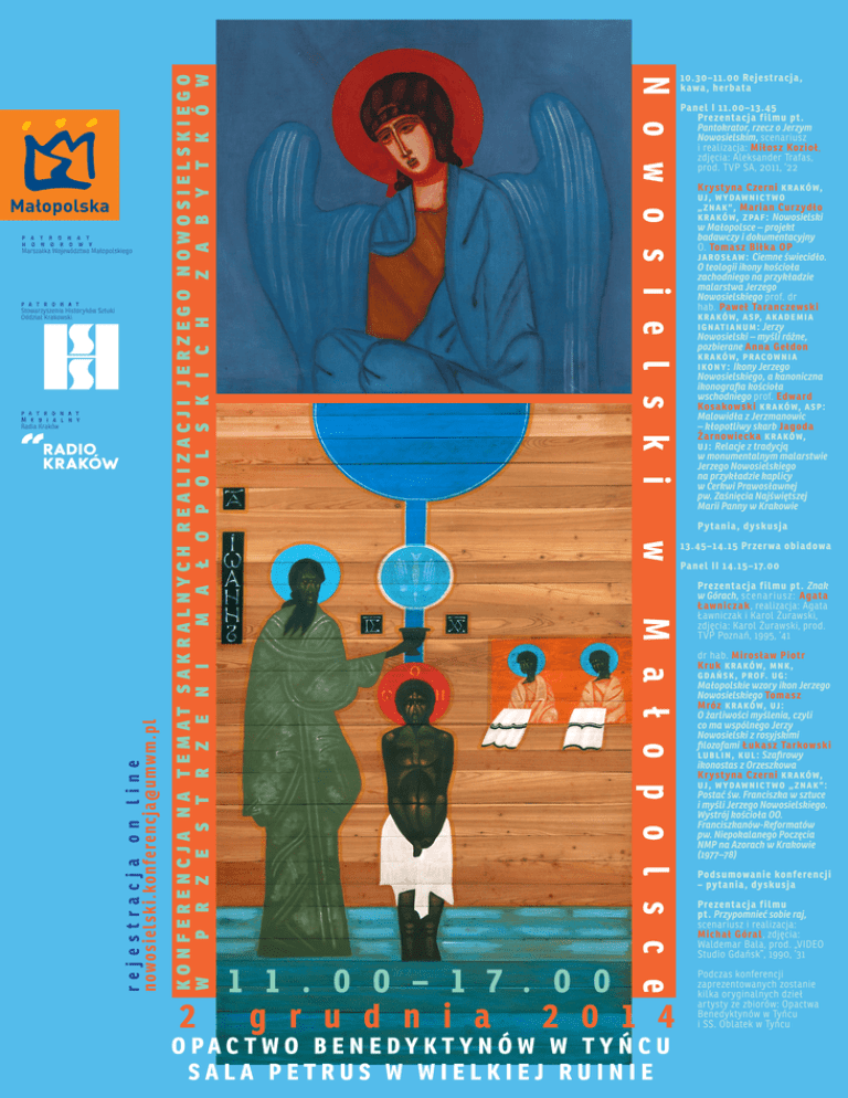 Panel I 1 1 .00–1 3.45 Prezentac ja fil m u pt. Pantokrator, rzecz o Jerzym Nowosielskim, scenariusz i realizacja: Mił osz Kozioł, zdjęcia: Aleksander Trafas, prod. TVP SA, 2011, ‘22 Kr ystyna Czerni krakó w, uj , wydawni c two „ znak”, Marian Cu rzydł o krakó w, zpaf: Nowosielski w Małopolsce – projekt badawczy i dokumentacyjny O. Tom asz Bił ka O P jaro s ław: Ciemne świecidło. O teologii ikony kościoła zachodniego na przykładzie malarstwa Jerzego Nowosielskiego prof. dr hab. Paweł Taranc zewski krakó w, as p, akademi a i gnati anum: Jerzy Nowosielski – myśli różne, pozbierane A nna Geł don krakó w, p raco wni a i ko ny: Ikony Jerzego Nowosielskiego, a kanoniczna ikonografia kościoła wschodniego prof. Edward Kosakowski krakó w, as p: Malowidła z Jerzmanowic – kłopotliwy skarb Jagoda Żarnowiec ka krakó w, uj: Relacje z tradycją w monumentalnym malarstwie Jerzego Nowosielskiego na przykładzie kaplicy w Cerkwi Prawosławnej pw. Zaśnięcia Najświętszej Marii Panny w Krakowie P ytania, dysku sja w M a ł o p o l s c e re j e s trac j a o n l i n e no wosielski.konferen cja@umwm .pl p a t r o n a t M e d i a l n y Radia Kraków konferencja na temat sakralnych realizacji jerzego nowosielskiego w p r z e s t r z e n i m a ł o p o l s k i c h z a b y t k ó w p a t r o n a t Stowarzyszenia Historyków Sztuki Oddział Krakowski N o w o s i e l s k i p a t r o n a t h o n o r o w y Marszałka Województwa Małopolskiego 10.30–1 1 .00 Rejestrac ja, kawa, herbata 1 1 . 0 0 – 1 7 . 0 0 2 g r u d n i a 2 0 1 4 o pac t w o b e n e dy k t y n ó w w t y ń c u sala petrus w wielkiej ruinie 1 3.45–1 4.1 5 Przer wa obiadowa Panel II 1 4.1 5–17.00 Prezentac ja fil m u pt. Znak w Górach, sc ena r iusz: Agata Ławnic zak, realizacja: Agata Ławniczak i Karol Żurawski, zdjęcia: Karol Żurawski, prod. TVP Poznań, 1995, ‘41 dr hab. Mirosł aw Piotr Kru k krakó w, mnk, gdańs k, p ro f. ug: Małopolskie wzory ikon Jerzego Nowosielskiego Tom asz Mróz krakó w, uj : O żarliwości myślenia, czyli co ma wspólnego Jerzy Nowosielski z rosyjskimi filozofami Łu kasz Tarkowski lubli n, kul: Szafirowy ikonostas z Orzeszkowa Kr ystyna Czerni krakó w, uj , wydawni c two „ znak”: Postać św. Franciszka w sztuce i myśli Jerzego Nowosielskiego. Wystrój kościoła OO. Franciszkanów-Reformatów pw. Niepokalanego Poczęcia NMP na Azorach w Krakowie (1977–78) Podsu m owanie konferenc ji – pytania, dysku sja Prezentac ja fil m u pt. Przypomnieć sobie raj, scenariusz i realizacja: Mic hał Góral, zdjęcia: Waldemar Bala, prod. „VIDEO Studio Gdańsk”, 1990, ‘31 Podczas konferencji zaprezentowanych zostanie kilka oryginalnych dzieł artysty ze zbiorów: Opactwa Benedyktynów w Tyńcu i SS. Oblatek w Tyńcu