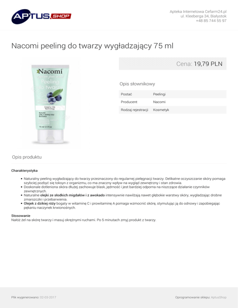 Apteka Internetowa Cefarm24.pl ul. Kleeberga 34, Białystok +48 85 744 55 97 Nacomi peeling do twarzy wygładzający 75 ml Cena: 19,79 PLN Opis słownikowy Postać Peelingi Producent Nacomi Rodzaj rejestracji Kosmetyk Opis produktu Charakterystyka Naturalny peeling wygładzający do twarzy przeznaczony do regularnej pielęgnacji twarzy. Delikatne oczyszczanie skóry pomaga szybciej pozbyć się toksyn z organizmu, co ma znaczny wpływ na wygląd zewnętrzny i stan zdrowia. Doskonale dotleniona skóra dłużej zachowuje blask, jędrność i jest bardziej odporna na niszczące działanie czynników zewnętrznych. Naturalne olejki ze słodkich migdałów i z awokado intensywnie nawilżają nawet głębokie warstwy skóry, wygładzając drobne zmarszczki i przebarwienia. Olejek z dzikiej róży bogaty w witaminę C i prowitaminę A pomaga wzmocnić skórę, stymulując ją do odnowy i zapobiegając pękaniu naczynek krwionośnych. Stosowanie Nałóż żel na skórę twarzy i masuj okrężnymi ruchami. Po 5 minutach zmyj produkt z twarzy. Plik wygenerowano: 02-03-2017 Powered by TCPDF (www.tcpdf.org) Oprogramowanie sklepu: AptusShop