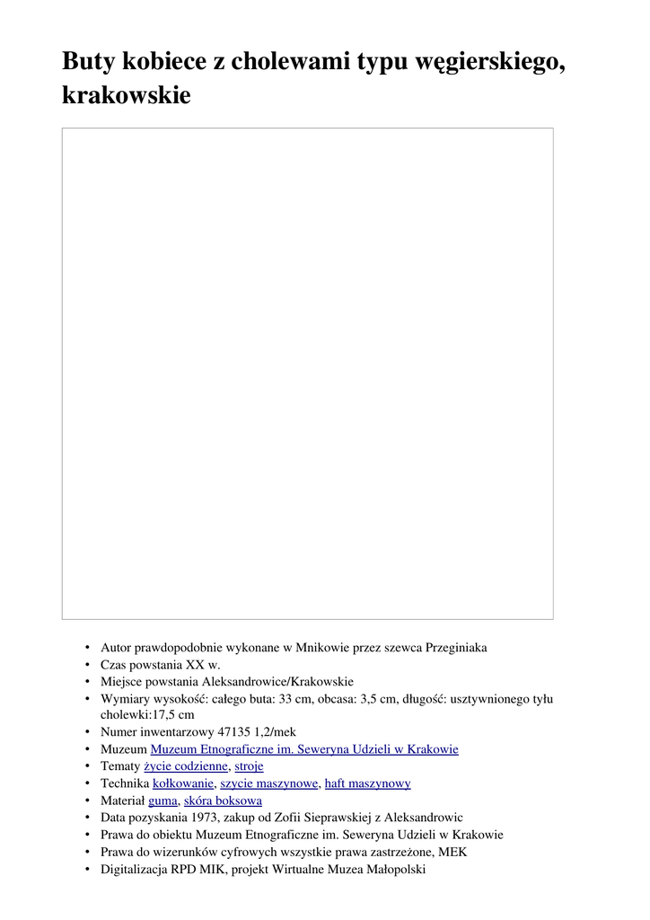 Buty kobiece z cholewami typu węgierskiego, krakowskie • • • • • • • • • • • • • Autor prawdopodobnie wykonane w Mnikowie przez szewca Przeginiaka Czas powstania XX w. Miejsce powstania Aleksandrowice/Krakowskie Wymiary wysokość: całego buta: 33 cm, obcasa: 3,5 cm, długość: usztywnionego tyłu cholewki:17,5 cm Numer inwentarzowy 47135 1,2/mek Muzeum Muzeum Etnograficzne im. Seweryna Udzieli w Krakowie Tematy życie codzienne, stroje Technika kołkowanie, szycie maszynowe, haft maszynowy Materiał guma, skóra boksowa Data pozyskania 1973, zakup od Zofii Sieprawskiej z Aleksandrowic Prawa do obiektu Muzeum Etnograficzne im. Seweryna Udzieli w Krakowie Prawa do wizerunków cyfrowych wszystkie prawa zastrzeżone, MEK Digitalizacja RPD MIK, projekt Wirtualne Muzea Małopolski • Tagi strój, Madziarzy, buty, 2D, strój ludowy Para butów kobiecych do stroju krakowskiego typu węgierskiego. Wykonane są z czarnej skóry boksowej, usztywnione wewnątrz jasną skórą bydlęcą. Buty posiadają cholewy dwuczęściowe zszywane po bokach, na górze usztywnione, na dole, przy kostkach skóra ułożona w harmonijkę zwaną „miechem”. Przednia część cholewy krojona jest razem z przyszwą, zaś tylna — z napiętkiem. U góry od środka naszyte są po bokach kawałki skóry zwane uszami, pomocne przy wkładaniu buta. Cholewy, przyszwy i napiętki są ozdobnie przeszyte na maszynie czarną nitką. Na cholewach, oprócz linii prostych i falistych tworzących szlaki wzdłuż szwów, stylizowane kwiaty tulipana, a w rogach kwiatki kielichowate. Górne brzegi cholewek obszyte pasem czerwonej skórki safianowej. Podeszwy butów skórzane, kołkowane. Obcasy półsłupkowe, podbite gumą. Na przedniej części podeszwy lewego buta znajduje się podbicie metalowe w kształcie półksiężyca. Buty przez wieki swej historii były obiektem pożądania i zazdrości. Szyte najczęściej ze skóry przez wykwalifikowanych szewców stanowiły jedną z najdroższych części ubioru. Na zakup obuwia mogli pozwolić sobie tylko nieliczni, zamożni mieszkańcy wsi polskiej. W okolicach Krakowa, w dzień powszedni ludność chodziła boso. Butów skórzanych, często bogato zdobionych, używano tylko idąc do kościoła, podczas różnych uroczystości oraz w zimie. Buty, podobnie jak inne części kosztownego stroju, były otaczane szczególną troską i przekazywane kolejnym pokoleniom. Chroniono je przed zniszczeniem, poprzez używanie prostych środków do konserwacji: czerniono czernidłem i smarowano tłuszczem, który czynił je odpornymi na wodę i rozciąganie. Czernidło do butów wykonywano z roztartego w słodkim mleku węgla ze spalonej słomy jęczmiennej, mazak zaś — z włosia krowiego. Przede wszystkim jednak starano się ich używać jak najrzadziej. Stąd, jak pisze Seweryn Udziela, „W lecie, idąc do kościoła albo do miasta, wystrojone Krakowianki niosą obuwie w rękach (…). Dopiero przed miastem, przed kościołem siadają przy drodze i wkładają obuwie”. By chronić podeszwę przed ścieraniem, często podbijano buty, najczęściej obcas, metalowymi blaszkami w kształcie podkowy. Niekiedy zabezpieczano cały obcas, okuwając go dookoła metalowa blaszką. W XIX wieku kobiety używały głównie butów z cholewami typu węgierskiego. Damski typ węgierski zbudowany jest z następujących części: cholewy, posiadającej dwa szwy po bokach, przyszwy stanowiącej część przednią buta, w której spoczywa stopa, części tylnej poniżej kostki, zwanej napiętkiem, z kolei na wysokości kostki skóra ułożona w jest harmonijkę zwaną „miechem” Górny brzeg cholewy posiada tak zwane uszy, pomocne przy zakładaniu butów. W okresie międzywojennym możemy zaobserwować coraz większą obecność butów, także na co dzień. Ogólne przemiany wsi związane z uprzemysłowieniem i częste kontakty miastem wpłynęły także na modę. Coraz częściej można było zobaczyć na wsi trzewiki z wysoką cholewą sznurowane lub zapinane na guziki, a w okresie letnim — półtrzewiki. Buty zazwyczaj nie były bogato zdobione, głównie w postaci przeszyć nicią w kolorze czarnym. Niekiedy spotykało się jako element dekoracyjny czerwony, safianowy pasek wzdłuż górnej części cholewy. Prezentowana para butów została wykonana prawdopodobnie przez szewca o nazwisku Przeginiak, pochodzącego z Mnikowa. Zakupione zostały od Zofii Sieprawskiej z Aleksandrowic w 1973 roku za wartość ówczesnych 520 zł. Nic bliżej nie wiadomo na temat właścicielki butów ani ich historii. Z pewnością były noszone na początku XX wieku, a z bardzo dobrego stanu zachowania możemy wnioskować, że nie używano ich często i dbano, by nie zniszczyły się za szybko. Opracowanie: Ewa Rossal (Muzeum Etnograficzne im. Seweryna Udzieli w Krakowie), © wszystkie prawa zastrzeżone Kobiecy strój krakowski z przełomu XIX i XX wieku Kobiecy strój krakowski był wyjątkowo zróżnicowany i trudno byłoby przeprowadzić na podstawie którejkolwiek z jego części, jak to ma miejsce w przypadku stroju męskiego, wyraźny podział na Krakowiaków zachodnich i wschodnich. Głównymi elementami różnicującymi stroju kobiecego były przede wszystkim zdobienia i krój gorsetów oraz sposób wiązania chust. Jednak i na tym poziomie możemy zauważyć istotne różnice występujące pomiędzy sąsiadującymi z sobą parafiami, a nawet wsiami. Najbogatsze stroje występowały w zamożnych wsiach na północnowschodnim i północnym obrzeżu XIXwiecznego Krakowa — w Mogile, Pleszowie, Bieńczycach, Branicach, Bronowicach, dzisiaj w większości znajdujących się w granicach miasta. Ponadto krój, zdobienia, kolorystyka oraz materiał, z którego szyte były gorsety, zmieniały się także z biegiem czasu. Ciekawy przykład stanowią tutaj typ starszy i nowszy gorsetu z Bronowic, które przez pewien czas na przełomie wieków współwystępowały na tym samym terenie. Preze