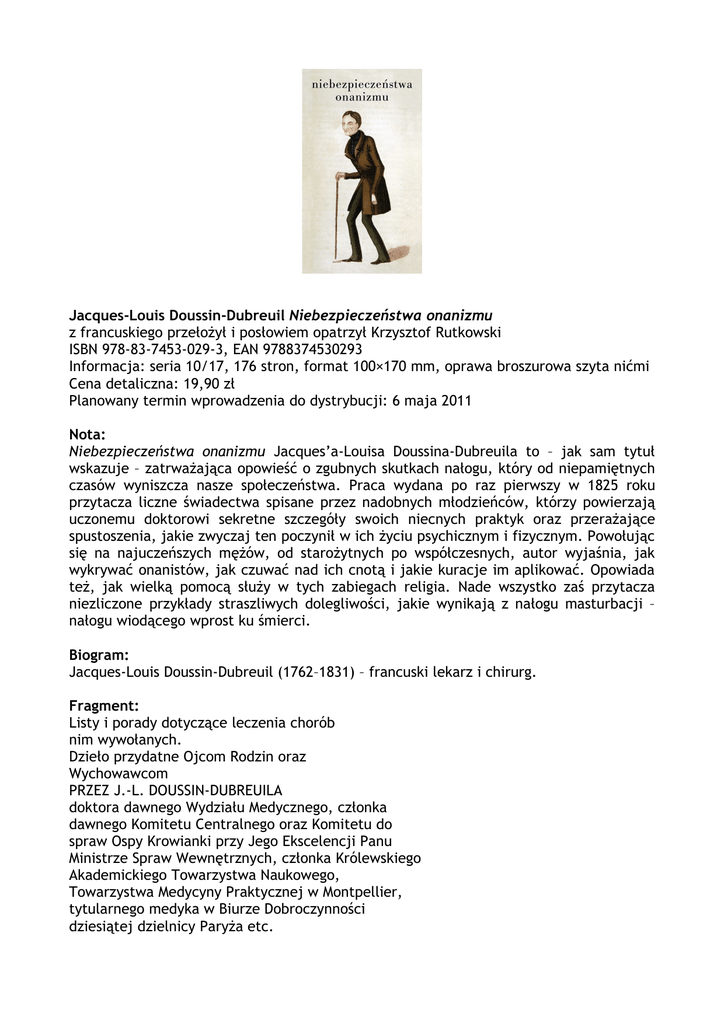 Jacques-Louis Doussin-Dubreuil Niebezpieczeństwa onanizmu z francuskiego przełożył i posłowiem opatrzył Krzysztof Rutkowski ISBN 978-83-7453-029-3, EAN 9788374530293 Informacja: seria 10/17, 176 stron, format 100×170 mm, oprawa broszurowa szyta nićmi Cena detaliczna: 19,90 zł Planowany termin wprowadzenia do dystrybucji: 6 maja 2011 Nota: Niebezpieczeństwa onanizmu Jacques’a-Louisa Doussina-Dubreuila to – jak sam tytuł wskazuje – zatrważająca opowieść o zgubnych skutkach nałogu, który od niepamiętnych czasów wyniszcza nasze społeczeństwa. Praca wydana po raz pierwszy w 1825 roku przytacza liczne świadectwa spisane przez nadobnych młodzieńców, którzy powierzają uczonemu doktorowi sekretne szczegóły swoich niecnych praktyk oraz przerażające spustoszenia, jakie zwyczaj ten poczynił w ich życiu psychicznym i fizycznym. Powołując się na najuczeńszych mężów, od starożytnych po współczesnych, autor wyjaśnia, jak wykrywać onanistów, jak czuwać nad ich cnotą i jakie kuracje im aplikować. Opowiada też, jak wielką pomocą służy w tych zabiegach religia. Nade wszystko zaś przytacza niezliczone przykłady straszliwych dolegliwości, jakie wynikają z nałogu masturbacji – nałogu wiodącego wprost ku śmierci. Biogram: Jacques-Louis Doussin-Dubreuil (1762–1831) – francuski lekarz i chirurg. Fragment: Listy i porady dotyczące leczenia chorób nim wywołanych. Dzieło przydatne Ojcom Rodzin oraz Wychowawcom PRZEZ J.-L. DOUSSIN-DUBREUILA doktora dawnego Wydziału Medycznego, członka dawnego Komitetu Centralnego oraz Komitetu do spraw Ospy Krowianki przy Jego Ekscelencji Panu Ministrze Spraw Wewnętrznych, członka Królewskiego Akademickiego Towarzystwa Naukowego, Towarzystwa Medycyny Praktycznej w Montpellier, tytularnego medyka w Biurze Dobroczynności dziesiątej dzielnicy Paryża etc. UWAGI WSTĘPNE Listy poniżej zamieszczone pisałem do młodzieńca, który medycynie poświęcić się zamierzał, ale uprawiał onanizm. Szczęśliwie rzecz mi całą wyznał w porę, by się z samogwałtu wydobyć. Długo się ociągałem z ich publikowaniem, bo przeczytawszy dzieła sławetnych ludzi, którzy nie zaniedbywali tej materii, odnalazłem w nich liczne świadectwa mocno podobne do tych, które w poniższych listach się znajdują. Wyznaję ponadto, że nie ośmieliłbym się pisać po Tissocie, Saltzmanie, Campem, Gottliebie Wogelu etc., gdybym nie zdawał sobie sprawy ze skutków równie przeraźliwych, jak porażających, każdego dnia wywoływanych przez występek masturbacji. Dziwić może, iż człowiek tak młody, jak wnosić wypada, niewiele ponad dwadzieścia lat liczący, na wyznania w materii jakże istotnej wobec mnie się odważył, i że uczynić nawet zdołałem z niego wspomożyciela jego własnych kamratów, wszak wiadomo przecie, iż młodzieńcy chętnie zwierzają się we własnym gronie, zatajając prawie zawsze swe czyny przed starszymi. Dodam, że leki, które mu zalecam, zbyt są lekkie, by zaszkodzić mogły, i powtarzam mu często, aby zachęcał innych chorych w ciężkim stanie do wizyt u lekarzy. Powtarzam, młodzi ludzie chętniej wyznają swe przywary samym sobie, z ogromnym zresztą wysileniem, i dopiero w śmiertelnym zagrożeniu mówią biegłym o prawdziwych źródłach swych dolegliwości. Tak zawsze się dzieje w przypadkach nieustannie ponawianego onanizmu. Wielu jest takich, którzy wolą umrzeć, niczego nie powiedziawszy, lub przyznają się zbyt późno, by ich od śmierci uratować. W tej właśnie chwili dowiedziałem się o zgonie syna jedynaka, lat piętnaście liczącego, którego dom znajdował się w pobliżu mojego. Nieszczęsny ten młodzian wyznał masturbację dopiero wtedy, gdy poczuł, iż żegna się z życiem. Od czasu drugiego wydania tej pracy miałem sposobność leczyć wielu młodych ludzi dotkniętych epilepsją lub gruźlicą płucną na skutek onanizmu. Przedstawiam, podług moich własnych obserwacji lub ustaleń autorów wcześniejszych, objawy pozwalające rozpoznać puszczalskich młodzieńców. Tuszę, iż młodzi koledzy lekarze, czytając niniejsze dziełko, znajdą w nim kilka dowodów i sformułowań, które sporządzić można jedynie po uważnych badaniach, oraz liczę, że będzie ono skwapliwie czytane przez ojców rodzin oraz osoby zajmujące się edukacją młodzieży. Spis treści: UWAGI WSTĘPNE 5 PIERWSZY LIST do Pana***, studenta z Bordeaux, w którym autor gratuluje korespondentowi wyrzeczenia się onanizmu i zachęca, by skłonił on swych młodych przyjaciół do zapoznania się z rozmaitymi ustępami wyjętymi z pamiętników nadesłanych autorowi przez niektórych chorych 9 Ustęp pierwszy 11 Ustęp drugi 12 Ustęp trzeci 13 Ustęp czwarty 14 Ustęp piąty 16 Ustęp szósty 17 Ustęp siódmy 18 Ustęp ósmy 20 Ustęp dziewiąty 22 Ustęp dziesiąty 24 Ustęp jedenasty 25 W ostatnim ustępie mowa o młodzieńcu, który pragnąc poniechać masturbacji, zdobył się na odwagę i przez cały rok spędzał wszystkie noce na krześle z obrożą na szyi i obiema rękami przywiązanymi sznurkiem do oparć. LIST DRUGI w którym autor cytuje liczne uwagi Celse’a, Almutha, Tissota, Van Swietena, Lomniusa i Campego (s. 35). Ten ostatni podaje wiele przykładów, znajdujących się odpowiednio: pierwszy (s. 44); drugi (s. 47); trzeci (s. 49); czwarty (s. 51); piąty (s. 54); szósty (s. 55); siódmy (s. 56); ósmy i ostatni (s. 57) 35 LIST TRZECI w którym przedstawiono znaki i objawy pozwalające rozpoznać osobnika uprawiającego masturbację 59 Ten sam list. Przypadłości wynikające z namiętnego onanizmu opisane przez doktora Gottlieba Wogela 60 Doktor Frank wzywa rządy do najściślejszego nadzorowania masturbantów, ponieważ postrzega ich nie tylko jako ciężar, ale też zagrożenie dla społeczności 61 Całkowity imbecylizm wywołany masturbacją 61 Religia należy do najskuteczniejszych środków obrony przed plagą onanizmu: przykłady i dowody 6