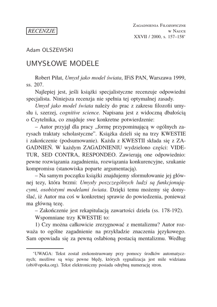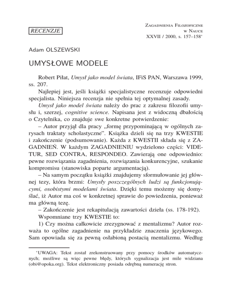 RECENZJE Zagadnienia Filozoficzne w Nauce XXVII / 2000, s. 157–158∗ Adam OLSZEWSKI UMYSŁOWE MODELE Robert Piłat, Umysł jako model świata, IFiS PAN, Warszawa 1999, ss. 207. Najlepiej jest, jeśli książki specjalistyczne recenzuje odpowiedni specjalista. Niniejsza recenzja nie spełnia tej optymalnej zasady. Umysł jako model świata należy do prac z zakresu filozofii umysłu i, szerzej, cognitive science. Napisana jest z widoczną dbałością o Czytelnika, co znajduje swe konkretne potwierdzenie: – Autor przyjął dla pracy „formę przypominającą w ogólnych zarysach traktaty scholastyczne”. Książka dzieli się na trzy KWESTIE i zakończenie (podsumowanie). Każda z KWESTII składa się z ZAGADNIEŃ. W każdym ZAGADNIENIU wydzielono części: VIDETUR, SED CONTRA, RESPONDEO. Zawierają one odpowiednio: pewne rozwiązania zagadnienia, rozwiązania konkurencyjne, szukanie kompromisu (stanowiska poparte argumentacją). – Na samym początku książki znajdujemy sformułowanie jej głównej tezy, która brzmi: Umysły poszczególnych ludzi są funkcjonującymi, osobistymi modelami świata. Dzięki temu możemy się domyślać, iż Autor ma coś w konkretnej sprawie do powiedzenia, ponieważ ma główną tezę. – Zakończenie jest rekapitulacją zawartości dzieła (ss. 178-192). Wspomniane trzy KWESTIE to: 1) Czy można całkowicie zrezygnować z mentalizmu? Autor rozważa to ogólne zagadnienie na przykładzie znaczenia językowego. Sam opowiada się za pewną osłabioną postacią mentalizmu. Według UWAGA: Tekst został zrekonstruowany przy pomocy środków automatycznych; możliwe są więc pewne błędy, których sygnalizacja jest mile widziana ([email protected]). Tekst elektroniczny posiada odrębną numerację stron. ∗ 2 Adam OLSZEWSKI niego, w oparciu o modelowanie umysłowe buduje się znaczenie językowe. 2) Czy „stany przekonaniowe” (propositional attitudes) da się wyjaśnić za pomocą stanów mózgu czy też stanów umysłu? Autor argumentuje za drugą możliwością, co prowadzi do uznania istnienia reprezentacji umysłowych w postaci modelów umysłowych. 3) Jakiego rodzaju reprezentacjami są modele umysłowe? Modele umysłowe zadają wartości parametrom dla uzyskania z nich symulacji umysłowych. Modele umysłowe, same będąc reprezentacjami świata, stają się bazą dla innych reprezentacji. Filozofia umysłu posługuje się, jak każda specjalność, specyficznym słownictwem. Słownictwo to składa się ze słów, które spotykamy w języku potocznym. Nabrały one jednak w filozofii umysłu nieco odmiennego, technicznego znaczenia. Dlatego brakuje mi w książce słownika terminów. Książkę oceniam wysoko również dlatego, że zgadzam się z preferencjami filozoficznymi R. Piłata (szczególnie w kwestii 1). Autor kompetentnie i merytorycznie podejmuje te trudne i subtelne zagadnienia. Książka nie jest tylko referatem zastanych koncepcji, ale zawiera również sformułowania własnych koncepcji (umysł = funkcjonujący, osobisty model świata). Czytając pracę odniosłem wrażenie, że wiele zagadnień należących obecnie do innych dziedzin np. do filozofii logiki, czy logiki samej, może zostać sformułowana na terenie cognitive science. Jest to nauka (czy też grupa nauk) o dużej przyszłości. Na jej gruncie należy się spodziewać wielu interesujących osiągnięć. Dotyczy to także tradycyjnych problemów filozoficznych np. problemu znaczenia, problemu prawdy, sporu realizm-idealizm (por. Kwestia 3.). Zarówno filozofia umysłu, jak i cognitive science wymagają mocnego wsparcia ze strony metodologii. Może to przynieść im sporo pożytku. Książka istotnie nawiązuje do jednego z głównych problemów, którymi zajmuje się Ośrodek Badań Interdyscyplinarnych (OBI) — UMYSŁOWE MODELE 3 problemu obrazów świata. Dlatego należy ją szczególnie polecić osobom związanym z tym kręgiem filozoficznym. Adam Olszewski