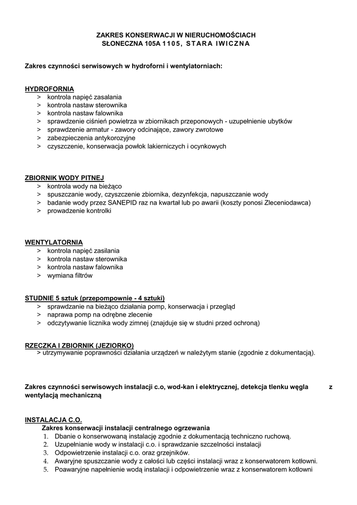 ZAKRES KONSERWACJI W NIERUCHOMOŚCIACH SŁONECZNA 105A 1 1 0 5 , S T A R A I W I C Z N A Zakres czynności serwisowych w hydroforni i wentylatorniach: HYDROFORNIA > kontrola napięć zasalania > kontrola nastaw sterownika > kontrola nastaw falownika > sprawdzenie ciśnień powietrza w zbiornikach przeponowych - uzupełnienie ubytków > sprawdzenie armatur - zawory odcinające, zawory zwrotowe > zabezpieczenia antykorozyjne > czyszczenie, konserwacja powłok lakierniczych i ocynkowych ZBIORNIK WODY PITNEJ > kontrola wody na bieżąco > spuszczanie wody, czyszczenie zbiornika, dezynfekcja, napuszczanie wody > badanie wody przez SANEPID raz na kwartał lub po awarii (koszty ponosi Zleceniodawca) > prowadzenie kontrolki WENTYLATORNIA > kontrola napięć zasilania > kontrola nastaw sterownika > kontrola nastaw falownika > wymiana filtrów STUDNIE 5 sztuk (przepompownie - 4 sztuki) > sprawdzanie na bieżąco działania pomp, konserwacja i przegląd > naprawa pomp na odrębne zlecenie > odczytywanie licznika wody zimnej (znajduje się w studni przed ochroną) RZECZKA I ZBIORNIK (JEZIORKO) > utrzymywanie poprawności działania urządzeń w należytym stanie (zgodnie z dokumentacją). Zakres czynności serwisowych instalacji c.o, wod-kan i elektrycznej, detekcja tlenku węgla wentylacją mechaniczną INSTALACJA C.O. Zakres konserwacji instalacji centralnego ogrzewania 1. Dbanie o konserwowaną instalację zgodnie z dokumentacją techniczno ruchową. 2. Uzupełnianie wody w instalacji c.o. i sprawdzanie szczelności instalacji 3. Odpowietrzenie instalacji c.o. oraz grzejników. 4. Awaryjne spuszczanie wody z całości lub części instalacji wraz z konserwatorem kotłowni. 5. Poawaryjne napełnienie wodą instalacji i odpowietrzenie wraz z konserwatorem kotłowni z 6. Zapewnienie odpowiedniej temperatury w lokalach mieszkalnych i użytkowych w sezonie grzewczym wraz z konserwatorem kotłowni. 7. Likwidowanie wszelkich nieszczelności, niedrożności i nieprawidłowości w działaniu całej instalacji do grzejników włącznie. 8. W okresie między sezonami grzewczymi utrzymanie instalacji w stanie nawodnionym. 9. Wymiana uszkodzonych rurociągów instalacji c.o. - poziomu do 1,5 mb łącznie z zabezpieczeniem antykorozyjnym. 10. Usuwanie przecieków zaworów grzejnikowych z ewentualna wymianą. 11. Usuwanie przecieków na połączeniach kołnierzowych zaworów z wymianą uszczelek. 12. Usuwanie przecieków na śrubunkach z ich ewentualną wymianą. 13. Likwidacja przecieków automatycznych odpowietrzników na pionach i ewentualną wymianą. 14. Likwidacja niedogrzewań spowodowanych lokalnym zapowietrzeniem grzejnika. 15. Likwidacja niedogrzewań spowodowanych lokalnym zapowietrzeniem się instalacji. 16. Likwidacja niedogrzewań spowodowanych zapchaniem się nastawy zaworu podpionowego. 17. Likwidacja niedogrzewań w wyniku zapchania się zaworu grzejnikowego. 18. Likwidacja niedogrzewań w wyniku miejscowego rozregulowania instalacji. 19. Odczytywanie parametrów pracy instalacji i przekazywanie Administracji informacji o ewentualnych nieprawidłowościach. 20. Uruchomienie instalacji C.O. na okres grzewczy wraz z jej odpowietrzeniem. 21. Regulacji grzejników w lokalach. 22. Usuwanie przecieków nie wymagających użycia materiałów zastępczych lub sprzętu specjalistycznego. 23. Wymiana odcinków rurociągów do 0,5 m, zaworów grzejnikowych, śrubunków i zaworów do 25mm łącznie z zabezpieczeniem antykorozyjnym i termicznym. 24. Kontrola stanu technicznego armatury zamontowanej na instalacji C.O. 25. Kontrolowanie uzupełnienie wody w instalacji. 26. Czuwanie nad drożnością całego układu oraz równomiernym rozdzielaniem ciepła. 27. Awaryjne spuszczanie wody z instalacji. 28. Poawaryjne napełnienie wodą instalacji i odpowietrzanie. 29. Likwidacja niedogrzewań > Spowodowanych lokalnym zapowietrzeniem grzejnika > Spowodowanych zapowietrzeniem się instalacji > Spowodowanym zapchaniem się kryzy grzejników > Powstałych w wyniku zapchania się zaworu grzejniczego > Powstałych w wyniku miejscowego rozregulowania instalacji 30. Wykonywanie innych drobnych czynności przekazanych do wykonywania przez administrację związanych z zakresem czynności. 31. Uczestnictwo w komisjach. INSTALACJA WOD-KAN I DESZCZOWA Zakres usług konserwacyjnych ciepłej i zimnej wody oraz instalacji kanalizacyjnej deszczowej: 1. Dbanie o konserwowaną instalację zgodnie z dokumentacją techniczno ruchową. 2. Zapewnienie ciągłości dostawy wody do punktów wodomierz bez odpowiedzialności za uszkodzenia i nieprawidłowości na odcinku sieci. 3. Likwidowanie wszelkich nieszczelności, nieprawidłowości w działaniu instalacji 4. W przypadkach koniecznych wymiana zaworów odcinających i odcinków instalacji do 1 mb. 4. Sprawdzenie prawidłowości działania zaworów podpionowych. 5. Likwidacja przecieków na złączach. 6. Uzupełnienie izolacji na poziomach do lm. 7. Awaryjne zakładanie cybantów. 8. Zakorkowanie instalacji. 9. Poawaryjne uruchomienie węzła. 10. Awaryjne spuszczenia i nawodnienia wody z jak najmniejszej części budynku. i 11. Doraźne zabezpieczenie miejsc awarii. 12. Spuszczanie wody z instalacji będących zagrożonych zamarznięciem wody w zimie. 13. Uszczelnianie armatury (baterie, zawory, itp.) w częściach wspólnych nieruchomości. 14. Udrażnianie instalacji kanalizacyjnej na pionach, poziomach do pierwszej studzienki przed budynkiem oraz instalacji kanalizacji deszczowej tylko w częściach wspólnych. 15. Udrażnianie kratek ściekowych w pomieszczeniach wspólnych. 16. Wymiana podejść odpływowych w pomieszczeniach wspólnych. 17. Czyszczenie i udrażnianie w miarę potrzeb studzienek rewizyjnych, ściekowych i drenażowych. 18. Naprawa, wymiana zaworów burzowych. 19. Udrażnianie wywie wek kanalizacyjnych ponad dachem. 20. Kontrola stanu technicznego armatur zamontowanej na instalacji wodnej. 21. Odczytywanie temperatur c.w.u. na urządzeniach pomiarowych w kotłow