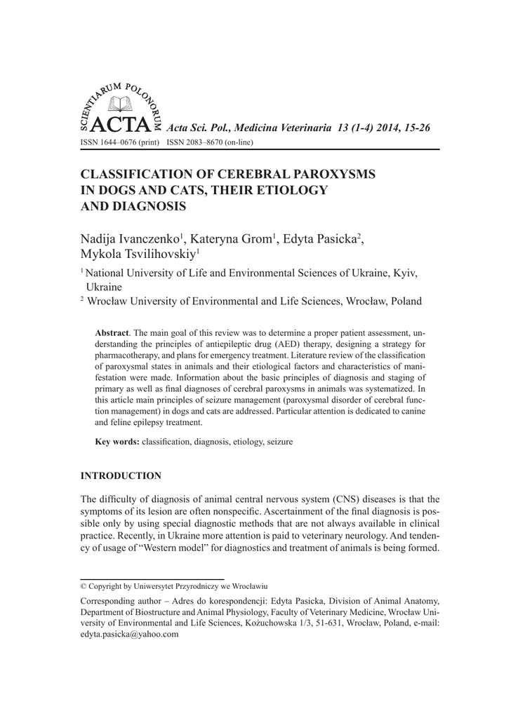 Acta Sci. Pol., Medicina Veterinaria 13 (1-4) 2014, 15-26 ISSN 1644–0676 (print) ISSN 2083–8670 (on-line) CLASSIFICATION OF CEREBRAL PAROXYSMS IN DOGS AND CATS, THEIR ETIOLOGY AND DIAGNOSIS1 Nadija Ivanczenko1, Kateryna Grom1, Edyta Pasicka2, Mykola Tsvilihovskiy1 National University of Life and Environmental Sciences of Ukraine, Kyiv, Ukraine 2 Wrocław University of Environmental and Life Sciences, Wrocław, Poland 1 Abstract. The main goal of this review was to determine a proper patient assessment, understanding the principles of antiepileptic drug (AED) therapy, designing a strategy for pharmacotherapy, and plans for emergency treatment. Literature review of the classification of paroxysmal states in animals and their etiological factors and characteristics of manifestation were made. Information about the basic principles of diagnosis and staging of primary as well as final diagnoses of cerebral paroxysms in animals was systematized. In this article main principles of seizure management (paroxysmal disorder of cerebral function management) in dogs and cats are addressed. Particular attention is dedicated to canine and feline epilepsy treatment. Key words: classification, diagnosis, etiology, seizure INTRODUCTION The difficulty of diagnosis of animal central nervous system (CNS) diseases is that the symptoms of its lesion are often nonspecific. Ascertainment of the final diagnosis is possible only by using special diagnostic methods that are not always available in clinical practice. Recently, in Ukraine more attention is paid to veterinary neurology. And tendency of usage of “Western model” for diagnostics and treatment of animals is being formed. © Copyright by Uniwersytet Przyrodniczy we Wrocławiu Corresponding author – Adres do korespondencji: Edyta Pasicka, Division of Animal Anatomy, Department of Biostructure and Animal Physiology, Faculty of Veterinary Medicine, Wrocław University of Environmental and Life Sciences, Kożuchowska 1/3, 51-631, Wrocław, Poland, e-mail: [email protected] 16 N. Ivanczenko et al. In our opinion the most confusion occurs in the diagnosis of seizures (Ss), including those that are characterized by the development of cramping syndrome. Ss are spontaneous stereotype abnormalities in animal behavior which are caused by brain (B) damage (hemorrhage) and malfunction (abnormal electrical activity). The term “convulsion” is used to indicate seizures with clonic generalized motor component. Clinical manifestations of Ss depend on the location of injured neurons, their quantity and peculiarities of passages of nervous impulses. In animals symptoms of Ss may include changes in physical activity, sensitive areas, behavior or level of consciousness as well as manifestation of the autonomic nervous system (ANS) (salivation, urination, defecation) [Oliver 1987]. Ss are always evidence of disturbance of function of the cerebrum or diencephalon. Also temporal lobe and related structures of the limbic system are often affected. Physiological basis of paroxysmal disorders is excessive synchronous depolarization of large groups of neurons that is the focus of paroxysmal activity. The activity of the focus spreads to other parts of the brain, which leads to generalized cerebral dysrhythmia (paroxysmal dysrhythmia), which by turn causes behavioral changes, known as Ss. All processes that can influence the activity or structure of B, disrupt the homeostasis of neurons and thus alter neural activity, can cause Ss [Lorenz and Kornegay 2004, Plat and Olby 2004]. Classification of paroxysmal states Etiologic factors that cause Ss, pursuant to anatomical classification, are conventionally divided into extracranial and intracranial. Also Ss can be classified into primary or idiopathic and secondary or symptomatic. Ss may be generalized or partial, depending on the part of the brain affected by abnormal electrical activity. Signs of partial seizures can be separated into three categories: motor signs, autonomic signs, and paroxysms or behavioral signs [Berendt et al. 2004]. Extracranial attacks include those which are caused by generalized metabolic disturbances (metabolism of glucose and oxygen, electrolyte disorders – hypo/hypercalcemia, hipo-/hipernatremia, hypomagnesemia, hypovitaminosises, disorders of neurotransmitters function), intoxications, diseases of the cardiovascular and respiratory systems, pathology of liver and kidneys. Intracranial attacks are those that are caused by congenital or acquired brain injuries (trauma, encephalitis, tumors, hydrocephalus, degenerative diseases, edema of B) and idiopathies. Generalized paroxysms (Table 1) [Oliver 1978] result from pathological processes that usually cover brain, cerebellum, thalamus and midbrain reticular formation. It is called primary generalized epilepsy if the cause of the Ss cannot be ascertained; the secondary generalized epilepsy (symptomatic epilepsy) – if any organic cause can be found [Gastant 1969]. Primary generalized epilepsy includes idiopathic generalized epilepsy, essential epilepsy, true epilepsy, genetic epilepsy and centrencephalic epilepsy [Holliday 1980]. Idiopathic epilepsy is a term used to denote the state of an organism which is characterized by recurrent neurological attacks for which it is not possible to find intra- or extracranial causes. The brain structure of these animals is within the anatomical norm, deviations are observed only in its functioning. Acta Sci. Pol. 17 Classification of cerebral paroxysms... Table 1. Classification of seizures: clinical signs Tabela 1. Klasyfikacja ataków padaczkowych: oznaki kliniczne Clinical manifestation Manifestacja kliniczna Etiology Etiologia Anatomic location Lokalizacja anatomiczna Generalized seizures, bilateral symmetric seizures, or seizures without local onset napady uogólnione, napady dwustronne symetryczne lub napady bez lokalnego początku Primary generalized, tonic-clonic (grand mal, major motor) Podstawowe uog