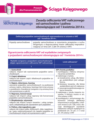 Prezent dla Prenumeratorów dwutygodnik MONITOR księgowego Ściąga Księgowego Zasady odliczania VAT naliczonego od samochodów i paliwa obowiązujące od 1 kwietnia 2014 r. Definicja pojazdów samochodowych wprowadzona w ustawie o VAT od 1 kwietnia 2014 r. Pojazdy samochodowe pojazdy samochodowe w rozumieniu przepisów o ruchu drogowym o dopuszczalnej masie całkowitej nieprzekraczającej 3,5 tony (art. 2 pkt 34 ustawy o VAT) Ograniczenia odliczenia VAT od wydatków związanych z pojazdami samochodowymi obowiązujące od 1 kwietnia 2014 r. Wydatki związane z pojazdami samochodowymi objęte ograniczeniem odliczenia VAT naliczonego Limit odliczenia* 1 2 1. Samochód nabycie, import lub wytworzenie pojazdów samochodowych 2. Części składowe nabycie lub import części składowych pojazdów samochodowych 3. Najem, dzierżawa, leasing używanie pojazdów samochodowych na podstawie umowy najmu, dzierżawy, leasingu lub innej umowy o podobnym charakterze związane z tą umową (inne niż wymienione w pkt 8) 4. Naprawa, konserwacja nabycie lub import usług naprawy lub konserwacji pojazdów samochodowych 5. Eksploatacja, używanie nabycie lub import innych towarów i usług związanych z eksploatacją lub używaniem tych pojazdów 6. Paliwo, olej napędowy, gaz nabycie lub import paliw silnikowych, oleju napędowego i gazu wykorzystywanych do napędu pojazdów samochodowych innych niż wymienione w pkt 7 50% kwoty podatku: 1) wynikającej z faktury otrzymanej przez podatnika; 2) należnego z tytułu: a) świadczenia usług, dla którego podatnikiem jest usługobiorca, b) dostawy towarów, dla której podatnikiem jest ich nabywca, c) wewnątrzwspólnotowego nabycia towarów; 3) należnego z tytułu importu towarów, o którym mowa w art. 33a ustawy o VAT; 4) wynikającej z otrzymanego dokumentu celnego, deklaracji importowej w przypadku, o którym mowa w art. 33b, oraz z decyzji określających wysokość należności celnych wydanych na podstawie art. 33 ust. 2 i 3 oraz art. 34 ustawy o VAT MOnITOR księgowego nr 7/2014 1 2 7. Paliwo, olej napędowy, gaz nabycie lub import paliw silnikowych, oleju napędowego i gazu wykorzystywanych do napędu: 1) samochodów osobowych; 2) innych niż samochody osobowe pojazdów samochodowych o dopuszczalnej masie całkowitej nieprzekraczającej 3,5 tony, w których liczba miejsc (siedzeń) łącznie z miejscem dla kierowcy wynosi: a) 1 – jeżeli dopuszczalna ładowność jest mniejsza niż 425 kg, b) 2 – jeżeli dopuszczalna ładowność jest mniejsza niż 493 kg, c) 3 lub więcej – jeżeli dopuszczalna ładowność jest mniejsza niż 500 kg. Do 30 czerwca 2015 r. – brak prawa do odliczenia VAT naliczonego Dopuszczalna ładowność pojazdu oraz liczba miejsc (siedzeń) są określane na podstawie dokumentów wydanych zgodnie z przepisami o ruchu drogowym. Pojazdy, które w wymienionych dokumentach nie mają określonej dopuszczalnej ładowności lub liczby miejsc, uznaje się również za samochody osobowe. 8. Najem, dzierżawa, leasing używanie pojazdów samochodowych na podstawie umowy najmu, dzierżawy, leasingu lub innej umowy o podobnym charakterze związane z tą umową Podatnik ma prawo odliczać 100% VAT naliczonego w przypadku umów najmu, dzierżawy, leasingu lub innej umowy o podobnym charakterze zawartych przed 1 kwietnia 2014 r.*, w stosunku do których na dzień poprzedzający dzień wejścia w życie ustawy kwotę podatku naliczonego stanowiła cała kwota podatku od towarów i usług wykazanego na fakturze, pod warunkiem że: a) pojazdy samochodowe będące przedmiotem tych umów zostały wydane podatnikowi przed 1 kwietnia 2014 r., b) umowa została zarejestrowana przez podatnika dokonującego odliczenia u właściwego dla niego naczelnika urzędu skarbowego najpóźniej w terminie 30 dni od dnia wejścia w życie niniejszej ustawy, czyli do 2 maja 2014 r. włącznie. * bez uwzględnienia zmian tych umów dokonywanych od dnia 1 kwietnia 2014 r. * Limity ograniczające prawo do odliczenia VAT naliczonego nie dotyczą pojazdów samochodowych, które są wykorzystywane przez podatnika wyłącznie do działalności gospodarczej. PODATKI NR 7 INDEKS 36990X ISBN 978-83-7440-321-4 MARZEC 2014 CENA 39,00 ZŁ (W TYM 5% VAT) SAMOCHÓD W FIRMIE – zmiany od 1 kwietnia 2014 r. Samochód „od zakupu do sprzedaży” - rozliczenie VAT i podatku dochodowego po zmianach Procedura rejestracji i zgłaszania samochodów do urzędu Optymalizacja kosztów floty samochodowej Wzory ewidencji i formularzy ISBN 978-83-7440-321-4 Partner merytoryczny Wszystkie zmiany dotyczące samochodów – w publikacji „SAMOCHÓD W FIRMIE – zmiany od 1 kwietnia 2014 r.” – zamów na www.sklep.infor.pl 100% odliczenia VAT naliczonego od wydatków związanych z pojazdami samochodowymi – od 1 kwietnia 2014 r. Prawo do 100% odliczenia VAT Warunki 100% odliczenia VAT obejmuje: 1 2 1) Pojazdy samochodo- Pojazdy samochodowe wykorzystywane wyłącznie w działalności gospowe wykorzystywane darczej to pojazdy samochodowe, których sposób wykorzystywania przez wyłącznie do działal- podatnika, zwłaszcza określony w ustalonych przez niego zasadach ich użyności gospodarczej wania, dodatkowo potwierdzony prowadzoną przez podatnika dla tych popodatnika jazdów ewidencją przebiegu pojazdu, wyklucza ich użycie do celów niezwiązanych z działalnością gospodarczą. Warunki uznania pojazdów za wykorzystywane wyłącznie w działalności to: – złożenie do us informacji VAT-26 o tych pojazdach w terminie 7 dni od dnia, w którym podatnik poniósł pierwszy wydatek związany z tymi pojazdami (w przypadku niezłożenia w terminie informacji VAT-26 uznaje się, że pojazd samochodowy jest wykorzystywany wyłącznie do działalności gospodarczej podatnika dopiero od dnia jej złożenia), – określenie zasad używania tych samochodów, – prowadzenie ewidencji przebiegu pojazdu. Wyłączenie obowiązku prowadzenia ewidencji i złożenia VAT-26 Obowiązek pro