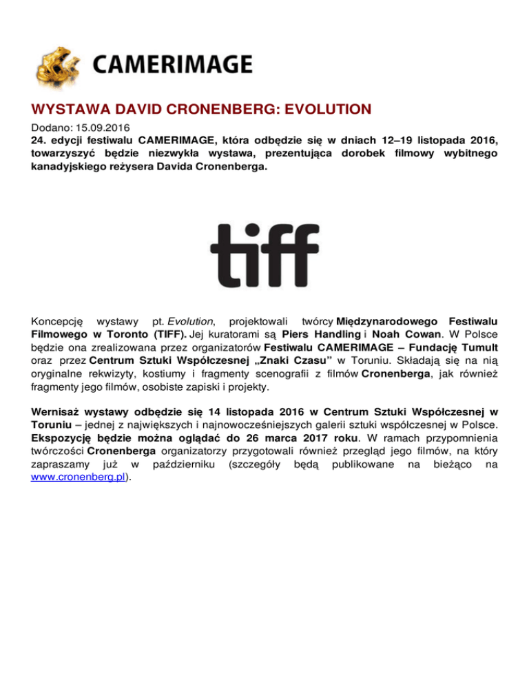 WYSTAWA DAVID CRONENBERG: EVOLUTION Dodano: 15.09.2016 24. edycji festiwalu CAMERIMAGE, która odbędzie się w dniach 12–19 listopada 2016, towarzyszyć będzie niezwykła wystawa, prezentująca dorobek filmowy wybitnego kanadyjskiego reżysera Davida Cronenberga. Koncepcję wystawy pt. Evolution, projektowali twórcy Międzynarodowego Festiwalu Filmowego w Toronto (TIFF). Jej kuratorami są Piers Handling i Noah Cowan. W Polsce będzie ona zrealizowana przez organizatorów Festiwalu CAMERIMAGE – Fundację Tumult oraz przez Centrum Sztuki Współczesnej „Znaki Czasu” w Toruniu. Składają się na nią oryginalne rekwizyty, kostiumy i fragmenty scenografii z filmów Cronenberga, jak również fragmenty jego filmów, osobiste zapiski i projekty. Wernisaż wystawy odbędzie się 14 listopada 2016 w Centrum Sztuki Współczesnej w Toruniu – jednej z największych i najnowocześniejszych galerii sztuki współczesnej w Polsce. Ekspozycję będzie można oglądać do 26 marca 2017 roku. W ramach przypomnienia twórczości Cronenberga organizatorzy przygotowali również przegląd jego filmów, na który zapraszamy już w październiku (szczegóły będą publikowane na bieżąco na www.cronenberg.pl). Wystawa zorganizowana we współpracy z TIFF. Kuratorzy: Piers Handling i Noah Cowan. Autorem plakatu jest Krzysztof Białowicz. David Cronenberg jest jednym z najwybitniejszych twórców filmowych na świecie. Jego twórczość także w Polsce zdobyła status kultowej. Filmy takie jak Dreszcze, Wściekłość, Nierozłączni, Fast Company, Pomiot, Skanerzy, Wideodrom, Mucha, Nagi Lunch, Crash Niebezpieczne pożądanie, eXistenZ, Martwa Strefa, M. Butterfly, Pająk, Historia przemocy, Wschodnie obietnice, Niebezpieczna metoda, Cosmopolis czy Mapy gwiazd wyróżniają się indywidualną, oryginalną formą i tematyką, wzbudzając przy tym wiele kontrowersji. Od wielu lat Cronenberg jest przez krytyków na całym świecie uznawany za jednego z najbardziej wpływowych współczesnych reżyserów. W roku 1999 przewodniczył jurorom festiwalu w Cannes, a w 2006 roku ten prestiżowy festiwal wyróżnił go nagrodą za całokształt twórczości. David Cronenberg, dzięki uprzejmości Caitlin Cronenberg Cronenberg angażuje się często w inne działania artystyczne – w 2006 roku współtworzył wystawę Andy Warhol / Supernova: Stars, Death and Disasters, 1962 – 1964. Był autorem ścieżki dźwiękowej ilustrującej tę wystawę, zawierającej m.in. komentarze współczesnych Warholowi artystów – Dennisa Hoopera, Amy Taubin czy Jamesa Rosenquista. W 2008 roku Cronenberg przygotował unikatową adaptację sceniczną swojego słynnego filmu Mucha, wystawianą następnie na deskach Théâtre du Châtelet i opery w Los Angeles. W 2014 roku wydał swoją pierwszą powieść, zatytułowaną Skonsumowana. Za swój dorobek artystyczny i dokonania na polu kultury i sztuki David Cronenberg otrzymał kilka prestiżowych odznaczeń, w tym m. in. Order Kanady (The Order of Canada, 2015), francuski Order Sztuki i Literatury (Ordre des Arts et des Lettres, 2009) oraz Legię Honorową (Legion d’honneur, 2009). Od 2011 roku jest również członkiem Brytyjskiego Instytutu Filmowego. David Cronenberg: Evolution, TIFF Bell Lightbox, 2013 zdj. Tom Arban David Cronenberg: Evolution, TIFF Bell Lightbox, 2013 zdj. Tom Arban Na tle współczesnej kultury dorobek filmowy Davida Cronenberga stanowi jedną z najbardziej intrygujących refleksji dotyczących ewolucji istoty ludzkiej. Wystawa David Cronenberg: Evolution została pomyślana w ten sposób, by poprzez prezentację oryginalnych rekwizytów, fragmentów dekoracji i scenografii z filmów zestawić widoczny w twórczości reżysera proces dojrzewania artystycznego z jego nieustającą refleksją o możliwościach ewolucji człowieka. Wystawa podzielona jest na trzy sekcje, które odpowiadają chronologicznemu i tematycznemu rozwojowi twórczości Cronenberga. Podział ten odzwierciedla widoczne w twórczości reżysera przejście od fascynacji wewnętrzną strefą ciała i umysłu, z ich dążeniami i niekontrolowanymi możliwościami, do obserwacji świata zewnętrznego, ukształtowanego przy pomocy tych sił. Wystawa David Cronenberg: Evolution jest hołdem dla wybitnego filmowca, ale także dla jednego z najbardziej wpływowych i prowokujących myślicieli naszych czasów. 14.11.2016 – 26.03.2017 Centrum Sztuki Współczesnej „Znaki Czasu” w Toruniu, Wały Gen. Sikorskiego 13 WYSTAWA Zorganizowana we współpracy z TIFF. Kuratorzy: Piers Handling i Noah Cowan. Zorganizowana w Polsce przez Fundację Tumult_Festiwal CAMERIMAGE i Centrum Sztuki Współczesnej „Znaki Czasu” w Toruniu, we współpracy z Fundacją Sztuki Świata. Producent: Marek Żydowicz Narzędzia chirurgiczne do zabiegów na mutantkach Rekwizyty z filmu Nierozłączni, 1988 Zbiory Davida Cronenberga, Biblioteka materiałów filmowych TIFF Makieta restauracji transsyberyjskiej z filmu Wschodnie obietnice, 2007 Dzięki uprzejmości Carola Spiera Accumicon – hełm firmy Spectacular Optometry International Rekwizyt z filmu Wideodrom, 1983 Zbiory Davida Cronenberga, Biblioteka materiałów filmowych TIFF