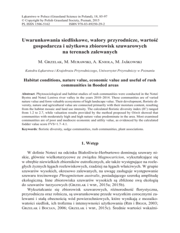Łąkarstwo w Polsce (Grassland Science in Poland), 18, 85-97 © Copyright by Polish Grassland Society, Poznań, 2015 PL ISSN 1506-5162 ISBN 978-83-89250-29-2 Uwarunkowania siedliskowe, walory przyrodnicze, wartość gospodarcza i użytkowa zbiorowisk szuwarowych na terenach zalewanych M. Grzelak, M. Murawski, A. Knioła, M. Jaśkowski Katedra Łąkarstwa i Krajobrazu Przyrodniczego, Uniwersytet Przyrodniczy w Poznaniu Habitat conditions, nature value, economic value and useful of rush communities in flooded areas Abstract. Phytosociological and habitat studies of rush communities were conducted in the Noteć Bystra and Noteć Leniwa river valley in the years 2010–2014. These communities are of varied nature value and form valuable ecosystems of high landscape value. Their development, floristic diversity, nature and agricultural value are connected primarily with their moisture content, resulting from the habitat mosaic and land use intensity. The calculated floristic diversity index (H’) ranged from 1.2 to 2.7, while valuation results provided by the method proposed by Oświt showed that communities with moderately high and high nature value predominate in the area. Most examined communities are of poor and mediocre economic and utility value, as evidenced by the calculated fodder value score FVS=1.7–4.1. Keywords: floristic diversity, sedge communities, rush communities, plant associations. 1. Wstęp W dolinie Noteci na odcinku Białośliwie-Herburtowo dominują szuwary niskie, głównie wielkoturzycowe ze związku Magnocaricion, wykształcające się w obrębie niewielkich zbiorników eutroficznych, ale także występujące na rozległych żyznych łęgach rozlewiskowych, rzadziej na łęgach właściwych. W grupie szuwarów wysokich, okresowo zalewanych, na uwagę zasługuje występowanie szuwaru trzcinowego Phragmitetum australis, posiadającego szeroką amplitudę ekologiczną. Inne zbiorowiska szuwarów wysokich są zbliżone swą ekologią do szuwarów turzycowych (Grzelak i wsp., 2015a; 2015b). Wykształcanie się zbiorowisk szuwarowych, różnorodność florystyczna, przyrodnicza oraz rolnicza, są uwarunkowane przede wszystkim corocznymi zalewami i stałą obecnością wód powierzchniowych, które wynikają z mozaikowatości siedlisk, ich trofizmu i intensywności użytkowania (Riis i Biggs, 2003; Grzelak i Bocian, 2006; Grzelak i wsp., 2015c). Średnie wartości wskaźni- 86 M. Grzelak, M. Murawski, A. Knioła, M. Jaśkowski ków Ellenberga i wsp. (1992) dla wyróżnionych zespołów, wykazały istotny wpływ wilgotności, odczynu gleby i zawartości azotu w glebie na warunki troficzne, skład gatunkowy flory, plon i wartość użytkową oraz różnorodność gatunkową zbiorowisk szuwarowych (Brzeg i Wojterska, 1996; Grzelak i Bocian, 2006). Ze względu na wysoki poziom wód gruntowych przez cały rok, a okresowo nawet całkowite zatapianie terenu, stanowią one niezwykle cenny, naturalny ekosystem różnorodnych i rzadkich gatunków roślin oraz miejsce bytowania wielu gatunków ptaków i zwierząt związanych właśnie z tego typu siedliskami (Ratajczak-Szczerba, 2013). Niektóre z nich należą do najważniejszych fitocenoz w dolinie Noteci, jak również w Polsce, zarówno pod względem przyrodniczym, jak i gospodarczym, stanowiąc cenny naturalny element systemu retencji poprzez zatrzymywanie wód roztopowych i opadowych (Grzelak i wsp., 2003; 2006). Wiele siedlisk przyrodniczych i siedlisk gatunków ma znaczenie europejskie, których ochronę ma zapewnić ekologiczna sieć Natura 2000 (Kałamucka, 2009; Grzelak i Murawski, 2013). Szczególnie istotna, z punktu widzenia Unii, jest utrata siedlisk naturalnych, co zagraża wyginięciem wielu gatunków roślin. Charakteryzują się one wysoką różnorodnością biologiczną. Wynika ona z tworzenia nowych nisz ekologicznych zasiedlanych przez kolejne gatunki zarówno rodzimego jak i obcego pochodzenia, zawleczone dawno temu i trwale zadomowione (archeofity). Wśród nich znajdują się gatunki rzadkie, mające specyficzne wymagania siedliskowe lub niską konkurencyjność w stosunku do innych (Grzelak i Bocian, 2006). Niestety, w ostatnich latach zbiorowiska szuwarowe na skutek działalności człowieka uległy degradacji (Kryszak i wsp., 2001), głównie wskutek stosowania melioracji odwadniających, a także niskiego poziomu wód gruntowych spowodowanych brakiem oraz niekorzystnym rozkładem opadów w sezonie wegetacyjnym notowanym w regionie Wielkopolski. Celem badań była ocena warunków siedliskowych, walorów przyrodniczych, wartości gospodarczej i użytkowej zbiorowisk szuwarowych w dolinie Noteci Leniwej i Bystrej. 2. Materiał i metody Badania geobotaniczne uwarunkowań siedliskowych, walorów przyrodniczych, wartości gospodarczej i użytkowej zbiorowisk szuwarowych na terenach zalewanych, prowadzone były w latach 2010–2014 w dolinie rzeki Noteci Leniwej i Bystrej, na odcinku Białośliwie-Herburtowo, na terenie województwa wielkopolskiego, w powiecie czarnkowsko-trzcianeckim. Przeanalizowano 115 zdjęć fitosocjologicznych wykonanych metodą Braun-Blanqueta (1954). Wyróżnio© PTŁ, Łąkarstwo w Polsce, 18, 2015 Uwarunkowania siedliskowe, walory przyrodnicze, wartość gospodarcza i użytkowa... 87 ne syntaksony zidentyfikowano i zaklasyfikowano do systemu fitosocjologicznego według Matuszkiewicza (2014). W badaniach uwzględniono ponadto: –– warunki siedliskowe, które określono metodą wskaźników ekologicznych – czynniki edaficzne według Ellenberga i wsp. (1992): – wilgotność (F), odczyn gleby (R) i zawartość azotu w glebie (N) oceniane w skali 9-cio i 12sto (obejmuje jedynie warunki wilgotnościowe – F) stopniowej, –– różnorodność florystyczną poprzez analizę składu gatunkowego, tj. struktury botanicznej (w %), ogólnej liczby gatunków występujących w zbiorowisku, średniej liczby gatunków w zdjęciu fitosocjologicznym oraz obliczeniu wskaźnika różnorodnoś