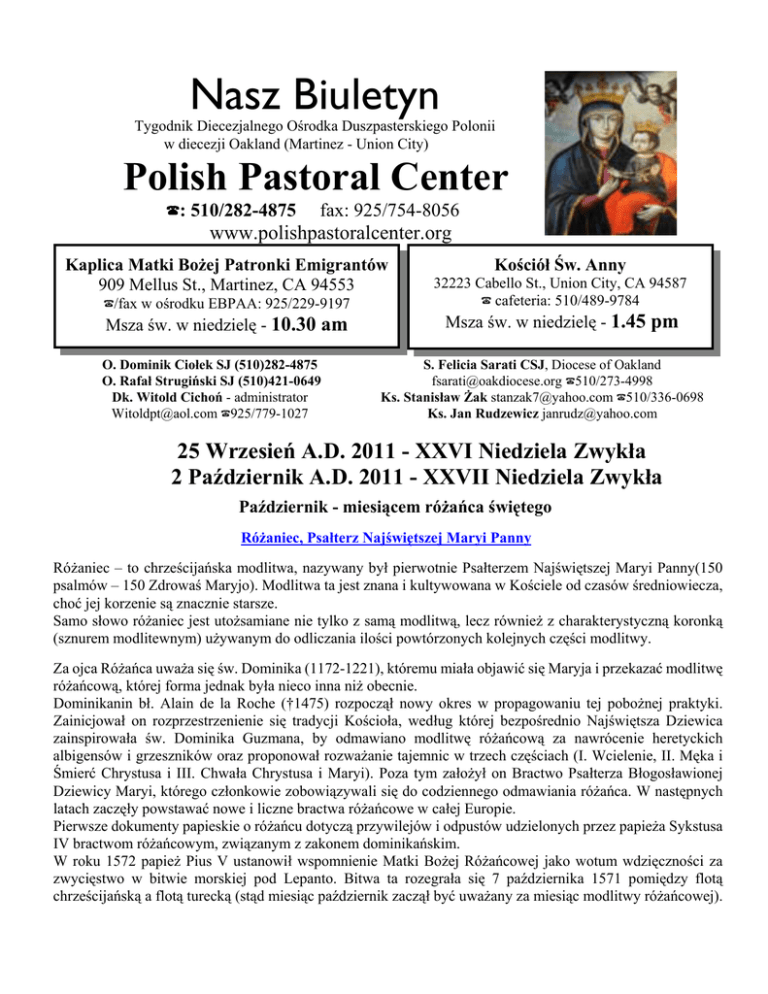 Nasz Biuletyn Tygodnik Diecezjalnego Ośrodka Duszpasterskiego Polonii w diecezji Oakland (Martinez - Union City) Polish Pastoral Center ?: 510/282-4875 fax: 925/754-8056 www.polishpastoralcenter.org Kaplica Matki Bożej Patronki Emigrantów 909 Mellus St., Martinez, CA 94553 ?/fax w ośrodku EBPAA: 925/229-9197 Msza św. w niedzielę - 10.30 am O. Dominik Ciołek SJ (510)282-4875 O. Rafał Strugiński SJ (510)421-0649 Dk. Witold Cichoń - administrator [email protected] ?925/779-1027 Kościół Św. Anny 32223 Cabello St., Union City, CA 94587 ? cafeteria: 510/489-9784 Msza św. w niedzielę - 1.45 pm S. Felicia Sarati CSJ, Diocese of Oakland [email protected] ?510/273-4998 Ks. Stanisław Żak [email protected] ?510/336-0698 Ks. Jan Rudzewicz [email protected] 25 Wrzesień A.D. 2011 - XXVI Niedziela Zwykła 2 Październik A.D. 2011 - XXVII Niedziela Zwykła Październik - miesiącem różańca świętego Różaniec, Psałterz Najświętszej Maryi Panny Różaniec – to chrześcijańska modlitwa, nazywany był pierwotnie Psałterzem Najświętszej Maryi Panny(150 psalmów – 150 Zdrowaś Maryjo). Modlitwa ta jest znana i kultywowana w Kościele od czasów średniowiecza, choć jej korzenie są znacznie starsze. Samo słowo różaniec jest utożsamiane nie tylko z samą modlitwą, lecz również z charakterystyczną koronką (sznurem modlitewnym) używanym do odliczania ilości powtórzonych kolejnych części modlitwy. Za ojca Różańca uważa się św. Dominika (1172-1221), któremu miała objawić się Maryja i przekazać modlitwę różańcową, której forma jednak była nieco inna niż obecnie. Dominikanin bł. Alain de la Roche (†1475) rozpoczął nowy okres w propagowaniu tej pobożnej praktyki. Zainicjował on rozprzestrzenienie się tradycji Kościoła, według której bezpośrednio Najświętsza Dziewica zainspirowała św. Dominika Guzmana, by odmawiano modlitwę różańcową za nawrócenie heretyckich albigensów i grzeszników oraz proponował rozważanie tajemnic w trzech częściach (I. Wcielenie, II. Męka i Śmierć Chrystusa i III. Chwała Chrystusa i Maryi). Poza tym założył on Bractwo Psałterza Błogosławionej Dziewicy Maryi, którego członkowie zobowiązywali się do codziennego odmawiania różańca. W następnych latach zaczęły powstawać nowe i liczne bractwa różańcowe w całej Europie. Pierwsze dokumenty papieskie o różańcu dotyczą przywilejów i odpustów udzielonych przez papieża Sykstusa IV bractwom różańcowym, związanym z zakonem dominikańskim. W roku 1572 papież Pius V ustanowił wspomnienie Matki Bożej Różańcowej jako wotum wdzięczności za zwycięstwo w bitwie morskiej pod Lepanto. Bitwa ta rozegrała się 7 października 1571 pomiędzy flotą chrześcijańską a flotą turecką (stąd miesiąc październik zaczął być uważany za miesiąc modlitwy różańcowej). Właściwe od początku istnienia tej modlitwy funkcjonowały trzy części różańca. Zmiany dokonał papież Jan Paweł II listem apostolskim Rosarium Virginis Mariae z 16 października 2002 roku, wprowadzając nową część różańca, czyli Tajemnice Światła. Teraz kilka słów o praktyce modlitwy różańcowej. Modlitwa ta rozpoczyna się znakiem Krzyża, krótszą wersją wyznania wiary, modlitwą Ojcze Nasz i trzykrotnie Zdrowaś Maryjo oraz raz Chwała Ojcu. Następnie odmawia się właściwe tajemnice. Każda grupa paciorków sygnalizuje odmawianie Zdrowaś Maryjo, poprzedzona jest samotnym koralikiem oznaczającym Ojcze Nasz i przerwa między grupą paciorków a kolejnym samotnym koralikiem odmawia się Chwała Ojcu. Następnie po Chwała Ojcu, jest zwykle dodawany akt strzelisty O Maryjo bez grzechu pierworodnego poczęta, lub: O mój Jezu, przebacz nam nasze grzechy. Na koniec, odmówieniu pięciu dziesiątek, jest odmawiana w intencjach papieża antyfona Pod Twoją Obronę lub Litania Loretańska. Modlitwa różańcowa nie polega jednak tylko na powtarzaniu poszczególnych modlitw. Modlitwy Ojcze nasz i Zdrowaś Maryjo mają być pomocą do rozważania tajemnic Ewangelii i to właśnie medytacja a tym samym spotkanie z żywym Jezusem Chrystusem i Jego Matką jest istotą modlitwy różańcowej. W Kościele katolickim za odmówienie różańca przed najświętszym sakramentem lub we wspólnocie (zgromadzenie, grupa formalna, rodzina) można uzyskać odpust zupełny lub cząstkowy pod zwykłymi warunkami. Różaniec – największy skarb Kościoła W wielu parafiach istnieją tzw. róże różańcowe, gdzie grupa ludzi jednoczy się, odmawiając codziennie określoną tajemnicę i wypraszając szczególne łaski dla całej wspólnoty. Rozważając tajemnice życia Jezusa i Maryi, człowiek ubogaca swoją duchowość. Różaniec jest modlitwą szczególną, która naprawdę może zdziałać cuda! Modlitwa różańcowa była szczególnie bliska papieżowi Janowi Pawłowi II. Poświęcił jej cały jeden list apostolski – „Rosarium Virginis Mariae.” Kiedyś nasz wielki rodak powiedział: „Jeśli pragniecie przez kilka chwil być bliscy sercu Papieża, łączmy się w modlitwie różańcowej, w której polecam was wszystkich Maryi Pannie; pragnąłbym, byście wy również mnie polecali Jej w ten sposób. " Papież Pius IX zapytany, jaki jest największy skarb Kościoła, wyciągnął z kieszeni różaniec i powiedział: „Oto jest największy skarb Kościoła!” Cuda modlitwy różańcowej Jednym z najbardziej znanych cudów modlitwy różańcowej jest cud w Hiroszimie. Na kilka miesięcy przed zrzuceniem bomby atomowej przez lotnictwo USA w mieście tym pojawiło się dwóch mężczyzn, głoszących konieczność nawrócenia, gdyż zbliża się nieuchronna katastrofa. Mówili także o konieczności codziennego odmawiania różańca. Po ataku nuklearnym okazało się, że w mieście pozostały nietknięte 2 budynki (wszystko inne było całkowicie zniszczone), w których przeżyli ludzie. Mówili oni, że w nocy przed atakiem ukazał im si
