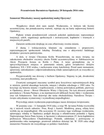 Przemówienie Burmistrza Opalenicy 20 listopada 2016 roku Szanowni Mieszkańcy naszej opalenickiej małej Ojczyzny! Wyjątkowy dzień dziś nam nastał. Wydarzenie, w którym tak licznie uczestniczymy, ma ponadczasową wartość, wpisuje się na karty najnowszej historii Opalenicy. Pięknie witam przedstawicieli czterech pokoleń opaleniczan; reprezentacje instytucji, szkół, organizacji społecznych i stowarzyszeń, kapłanów i wiernych z miejscowych parafii. Zarazem serdecznie dziękuję za czas ofiarowany swemu miastu. Z dumą i wdzięcznością kłaniam się sztandarom i proporcowi, reprezentującymi społeczność lokalną. Świadczą one o aktywności ludzkiego działania i poczuciu patriotyzmu. A dziś, w święto Chrystusa Króla Wszechświata, na mszy świętej, na zakończenie obchodów rocznicy chrztu Polski uczestniczyliśmy w Jubileuszowym Akcie Przyjęcia Jezusa za Króla i Pana. A teraz gromadzimy się w uprzywilejowanym miejscu w panoramie miasta, gdzie świadectwo dziejów Opalenicy XX i XXI wieku, i zachowania wiary katolickiej. Przed nami monument, sprawiony zatroskaniem i odpowiedzialnością władz samorządowych za wszystko co opalenickie. Przyprowadziły nas dzwony z herbem Opalenicy. Stajemy tu jak, dwukrotnie wcześniej, nasi przodkowie. Zwartymi szeregami otaczamy symbol przy krzyżówce najważniejszych dróg w mieście, pośród okazałego kościoła, ratusza i obiektu szkolnego z 1905 roku. Tu krzyżuje się historia miasta i współczesność, o której poświadcza pobliski, pierwszy w Opalenicy, skwer - Skwer Obrońców Wiary i Ojczyzny. Na tym skwerze pomnik powstańczy i Ściana Pamięci, a na marmurowych tablicach liczne fakty i wydarzenia oraz ich bohaterowie. Tam dziewięć dni temu obchodziliśmy Narodowe Święto święto odzyskania wymarzonej i wymodlonej niepodległości. Przywołuję zatem wydarzenia poprzedzające nasze dzisiejsze świętowanie. W jesienny czas - 11 listopada 1918 roku, a więc 98. lat temu Polska wyzwoliła się z niewoli trzech zaborów: Prus, Rosji i Austrii. Modlitwą, pracą, ofiarą krwi wybiła się na niepodległość. Dla uczczenia 10. rocznicy tego wielkiego wydarzenia, sprawujący władzę w Opalenicy podjęli decyzję o ufundowaniu pomnika z figurą Najświętszego Serca Pana Jezusa, w łączności z uhonorowaniem 25. lecia kapłaństwa proboszcza Mieczysława Chudzińskiego. Pomnik, odsłonięty i poświęcony w październiku roku następnego, przetrwał zaledwie dziesięć lat. W 1939 roku uległ nienawiści Niemców do wszystkiego co polskie i katolickie. W niezwykle trudnym, pierwszym powojennym roku, władze miejskie postanowiły ponownie powrócić do ciągłości historycznej i odbudować pomnik Serca Jezusowego. Uroczystość jego poświęcenia przez księdza Jana Kasiewicza miała miejsce w święto Chrystusa Króla - 28 listopada 1945 roku. W atmosferze wniosłości i uniesienia serc, z pomnika na tym samym miejscu, przemówiła Polska i Opalenica, dając moc przetrwania po doświadczeniach okrutnej drugiej wojny światowej. Trzynaście lat temu - 22 czerwca 2003 roku, na zakończenie obchodów 600lecia miasta i parafii, tak jak dziś, mieszkańcy grodu Opalińskich, gremialnie, ze swoimi władzami i duszpasterzami oddali się, zawierzyli Najświętszemu Sercu Pana Jezusa. Był to znak przeniesienia wartości chrześcijańskich w codzienną rzeczywistość. Dziś po raz trzeci, po 71 latach, odsłaniamy i święcimy dzieło miłe Bogu i ludziom. Wpatrujemy się w nowy cokół na fundamencie wiary katolickiej, z odnowioną pierwotną tablicą i odrestaurowanym kamiennym posągiem, ukazującym wyniosłą postać Jezusa z Jego Sercem. Pomnik był i jest, na nowo, wyrazem myśli i uczuć, odruchu serc i umysłów opaleniczan, serdecznym głosem uwielbienia i czci Bożego Serca. Jesteśmy tu z wdzięczności za niepodległą ojczyznę i za łaski Pana Boga dla każdego z nas i zbiorowość miejską. Manifestujemy dziś przywiązanie do wiary chrześcijańskiej, w imię poprzednich pokoleń, dla których słowa: Bóg-Honor-Ojczyzna, wyryte w sercach i na sztandarach, stanowiły podstawę życia, pracy i walki. Jezus ze swej wysokości patrzy na nas. Swoim Sercem obejmuje każdego z nas i błogosławi naszej małej ojczyźnie. Wspólnym wysiłkiem budujemy coraz piękniejsze oblicze miasta, kochajmy je zatem, bo dla wielu z nas nadal tu początek i miejsce ostatnie. Niech Opalenica będzie przyjaznym zakątkiem świata dla każdego, a wszystko co czynimy niech służy Bogu i Ojczyźnie, miastu i nam samym. Bądźmy dumni ze swoich dokonań. Powróćmy do swych domów radośni i szczęśliwi, bo Serce Jezusa otacza nas blaskiem swej dobroci. Dla Ciebie - Opalenico - odsłaniamy dzieło rąk ludzkich i serc naszych. Tym samym kontynuujemy pamięć i dziedzictwo ku chwale i sławie nas samych i kolejnych pokoleń. Burmistrz Opalenicy Tomasz Szulc