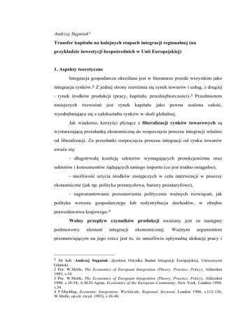 Andrzej Stępniak 1 Transfer kapitału na kolejnych etapach integracji regionalnej (na przykładzie inwestycji bezpośrednich w Unii Europejskiej) 1. Aspekty teoretyczne Integracja gospodarcza określana jest w literaturze przede wszystkim jako integracja rynków. 2 Z jednej strony rozróżnia się rynek towarów i usług, z drugiej - rynek środków produkcji (pracy, kapitału, przedsiębiorczości). 3 Przedmiotem niniejszych rozważań jest rynek kapitału jako pewna scalona całość, wyodrębniająca się z całokształtu rynków w skali globalnej. Jak wiadomo, korzyści płynące z liberalizacji rynków towarowych są wystarczającą przesłanką ekonomiczną do rozpoczęcia procesu integracji właśnie od liberalizacji. Za przesłanki rozpoczęcia procesu integracji od rynku towarów uważa się: - długotrwałą koalicję sektorów wymagających protekcjonizmu oraz sektorów i konsumentów żądających taniego importu (co jest trudno osiągalne), - możliwość użycia środków zastępczych w celu interwencji w procesy ekonomiczne (jak np. polityka przemysłowa, bariery pozataryfowe), - zagwarantowanie pozostawienia politycznie ważnych rozwiązań, jak polityka wzrostu gospodarczego lub redystrybucja dochodów, w obrębie prawodawstwa krajowego. 4 Wolny przepływ czynników produkcji uważany jest za następny podstawowy element integracji ekonomicznej. Ważnym argumentem przemawiającym na jego rzecz jest to, że umożliwia optymalną alokację pracy i 1 Dr hab. Andrzej Stępniak: dyrektor Ośrodka Badań Integracji Europejskiej, Uniwersytet Gdański. 2 Por. W.Molle, The Economics of European Integration (Theory, Practice, Policy), Aldershot 1993, s.10. 3 Por. W.Molle, The Economics of European Integration (Theory, Practice, Policy), Aldershot 1990, s.10-34; A.M.El-Agraa, Economics of the European Community, New York, London 1994, s.34. 4 F.Machlup, Economic Integration, Worldwide, Regional, Sectoral, London 1986, s.112-126; W.Molle, op.cit. (wyd. 1993), s.38-40. kapitału. Niekiedy brakuje środków produkcji tam, gdzie produkcja mogłaby być najbardziej ekonomicznie uzasadniona. W celu rozwiązania tego problemu przedsiębiorcy przesuwają kapitał z miejsc charakteryzujących się osiąganiem niskiego wskaźnika zwrotu poniesionych nakładów do miejsc, gdzie można uzyskiwać korzystniejsze wskaźniki. Powiększony rynek czynników produkcji stwarza też nowe możliwości wytwórcze, co z kolei sprzyja bardziej nowoczesnym i bardziej efektywnym sposobom wykorzystania tych czynników w postaci np. nowych form kredytowania, nowych zawodów itd. Wybór czynników wytwórczych jest ściśle związany z ich wolnym przepływem i wynika z korzyści ekonomicznych płynących z integracji. W warunkach integracji rynku kapitałowego kwestia bezpośredniego inwestowania wydaje się prosta - można mieć bowiem nadzieję na przyciągnięcie w ten sposób nowych zagranicznych inwestycji. Niemniej jednak istnieją poważne obawy przed pozbyciem się przez państwa kontroli nad tak czułymi instrumentami, jak np. instrumenty o charakterze makroekonomicznym. Następnym etapem integracji gospodarczej jest zbliżanie polityk ekonomicznych. Gdyby pozostawiono produkcję i dystrybucję całkowicie grze rynkowej, zniesienie barier przepływu towarów i czynników produkcji pomiędzy krajami wystarczyłoby do osiągnięcia kompletnej integracji ekonomicznej. Nie jest to jednak możliwe we współczesnych gospodarkach, mających w większości przypadków charakter mieszany i gdzie rząd często interweniuje w gospodarkę. Integracji w tym przypadku nie da się osiągnąć bez zharmonizowania polityk wewnętrznych, prowadzonych przez rządy poszczególnych państw. Jest to generalnie rzecz biorąc zagadnienie trudniejsze od integracji rynków towarów, usług i czynników wytwórczych. Politycy są jakby mniej skłonni do pozbywania się swego wpływu na gospodarkę, szczególnie w takich dziedzinach jak polityka zatrudnienia i polityka budżetowa (głównie w zakresie określania subsydiów, wydatków na szkolnictwo, jak również przychodów podatkowych). Widać to bardzo wyraźnie w obecnej Unii Europejskiej, gdy chodzi o tworzenie wspólnej waluty i wypracowywanie wspólnej polityki walutowej. 2 Nieprędko zatem dojrzeją warunki do wprowadzenia wspólnej waluty czy integracji walutowej. Stanowi to powód, dla którego tego typu integrację łączy się zwykle z ostatnim etapem integracji gospodarczej. Później przychodzi kolej już tylko na takie dziedziny, które dotykają samego „serca” suwerenności państwowej, zwłaszcza w dziedzinie wspólnej polityki obronnej i w zakresie wymiaru sprawiedliwości. W odniesieniu do nowoczesnych integrujących się gospodarek mieszanych (państwowo-prywatnych) 5 wyróżnia się integrację negatywną (tzn. eliminację barier) i pozytywną (tzn. tworzenie jednakowych warunków funkcjonowania zintegrowanych gałęzi gospodarki). Wymagania pierwszej z nich wobec polityki państwa są względnie proste (deregulacja, liberalizacja), druga natomiast wymaga bardziej złożonych form państwowej polityki gospodarczej (harmonizowanie, koordynowanie). Przyjrzyjmy się bliżej różnicom między nimi, gdyż jest to ważne także z punktu widzenia transferu kapitału. W literaturze rozróżnia się następujące etapy integracji regionalnej: strefę wolnego handlu (Free Trade Area - FTA), unię celną (Customs Union - CU), wspólny rynek (Common Market - CM), unię ekonomiczną (Economic Union EU), unię monetarną (Monetary Union - MU), unię ekonomiczną i monetarną (Economic and Monetary Union - EMU), pełną unię ekonomiczną (Full Economic Union - FEU). Przejścia od jednego do kolejnego stanu integracji mają charakter płynny. Nie przebiega to równolegle. Pierwsze stadia: FTA, CU i CM wydają się odnosić do integracji rynku w ramach klasycznej gospodarki bez interwencjonizmu państwowego, wyższe (EU, MU, FEU) - do integracji politycznej. W prakt