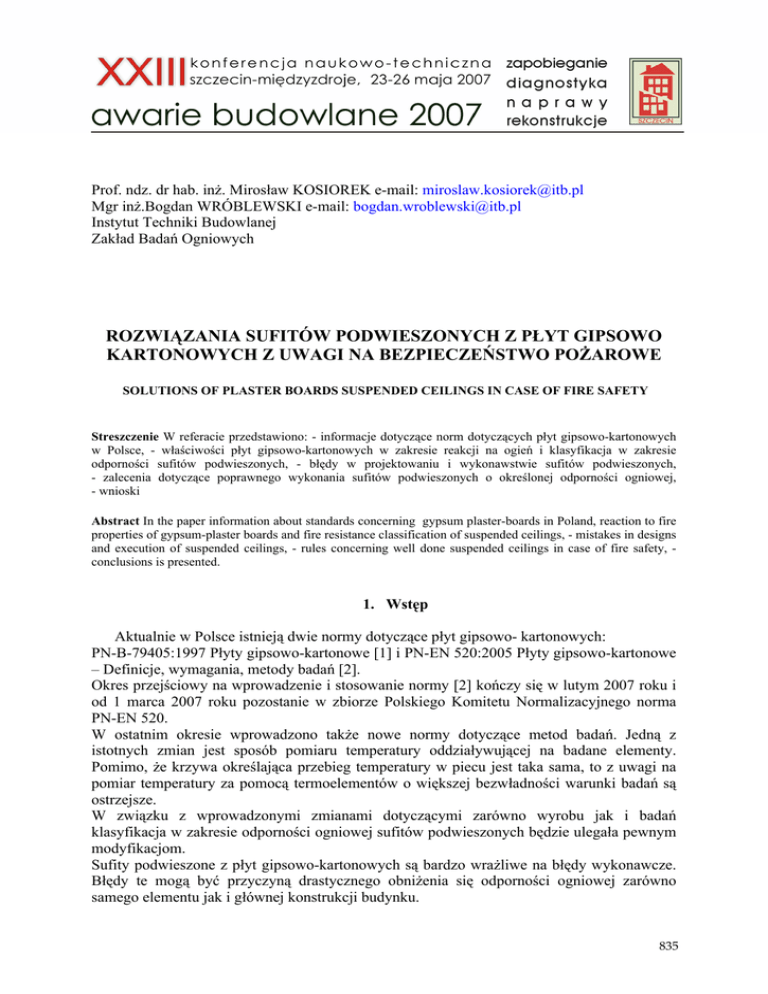Prof. ndz. dr hab. inŜ. Mirosław KOSIOREK e-mail: [email protected] Mgr inŜ.Bogdan WRÓBLEWSKI e-mail: [email protected] Instytut Techniki Budowlanej Zakład Badań Ogniowych ROZWIĄZANIA SUFITÓW PODWIESZONYCH Z PŁYT GIPSOWO KARTONOWYCH Z UWAGI NA BEZPIECZEŃSTWO POśAROWE SOLUTIONS OF PLASTER BOARDS SUSPENDED CEILINGS IN CASE OF FIRE SAFETY Streszczenie W referacie przedstawiono: - informacje dotyczące norm dotyczących płyt gipsowo-kartonowych w Polsce, - właściwości płyt gipsowo-kartonowych w zakresie reakcji na ogień i klasyfikacja w zakresie odporności sufitów podwieszonych, - błędy w projektowaniu i wykonawstwie sufitów podwieszonych, - zalecenia dotyczące poprawnego wykonania sufitów podwieszonych o określonej odporności ogniowej, - wnioski Abstract In the paper information about standards concerning gypsum plaster-boards in Poland, reaction to fire properties of gypsum-plaster boards and fire resistance classification of suspended ceilings, - mistakes in designs and execution of suspended ceilings, - rules concerning well done suspended ceilings in case of fire safety, conclusions is presented. 1. Wstęp Aktualnie w Polsce istnieją dwie normy dotyczące płyt gipsowo- kartonowych: PN-B-79405:1997 Płyty gipsowo-kartonowe [1] i PN-EN 520:2005 Płyty gipsowo-kartonowe – Definicje, wymagania, metody badań [2]. Okres przejściowy na wprowadzenie i stosowanie normy [2] kończy się w lutym 2007 roku i od 1 marca 2007 roku pozostanie w zbiorze Polskiego Komitetu Normalizacyjnego norma PN-EN 520. W ostatnim okresie wprowadzono takŜe nowe normy dotyczące metod badań. Jedną z istotnych zmian jest sposób pomiaru temperatury oddziaływującej na badane elementy. Pomimo, Ŝe krzywa określająca przebieg temperatury w piecu jest taka sama, to z uwagi na pomiar temperatury za pomocą termoelementów o większej bezwładności warunki badań są ostrzejsze. W związku z wprowadzonymi zmianami dotyczącymi zarówno wyrobu jak i badań klasyfikacja w zakresie odporności ogniowej sufitów podwieszonych będzie ulegała pewnym modyfikacjom. Sufity podwieszone z płyt gipsowo-kartonowych są bardzo wraŜliwe na błędy wykonawcze. Błędy te mogą być przyczyną drastycznego obniŜenia się odporności ogniowej zarówno samego elementu jak i głównej konstrukcji budynku. 835 Pomimo, Ŝe na rynku budowlanym w Polsce jest aktualnie duŜo katalogów technicznych, aprobat technicznych, instrukcji i wytycznych dotyczących projektowania i wykonywania systemów suchej zabudowy to jednak w dalszym ciągu popełniane są powaŜne błędy projektowe i wykonawcze. W artykule omówiono błędy spotykane na budowach i przy projektowaniu oraz podano zalecenia dotyczące poprawnego projektowania i wykonywania sufitów podwieszonych uwagi na bezpieczeństwo poŜarowe. 2.Właściwości ogniowe płyt gipsowo-kartonowych i klasyfikacje w zakresie odporności ogniowej Gips jest materiałem niepalnym. Wyroby gipsowe nie zawierające domieszek lub warstw organicznych są klasyfikowane (uznaniowo) jako niepalne. Klasyfikację w zakresie reakcji na ogień płyt gipsowo-kartonowych bez badań podano w tablicy 1 - klasy płyt gipsowokartonowych podano na podstawie decyzji Komisji Europejskiej nr 2003/593/EC z sierpnia 2003 roku. Tablica 1. Klasyfikacja płyt gipsowo kartonowych bez badań w zakresie reakcji na ogień Mechanizm działania większości wyrobów izolacyjnych charakteryzujących się niską przewodnością cieplną polega na tym, Ŝe pełnią one rolę izolacji opóźniającej wzrost temperatury przekroju lub powierzchni elementu konstrukcyjnego. Ogniochronne działanie gipsu polega na innym mechanizmie. Gips związany zawiera ok. 20% wody krystalicznej, tzn., Ŝe w 1 m² płyty gipsowej grubości 12,5 mm znajduje się ok. 2÷2,5 l wody. Wzrost temperatury wywołuje przemiany gipsu związane z odwodnieniem [3]. Uwalniana woda odparowuje, a na tę przemianę fazową potrzeba 5-krotnie więcej ciepła niŜ na ogrzanie wody od 20 do 100 ºC. Układ: strop Ŝelbetowy na belkach stalowych – sufit podwieszony z płyt gipsowokartonowych róŜnych systemów i technologii klasyfikowane są w Polsce wg [4 i 5] i występują w klasach odporności ogniowej: REI 30, REI 60, REI 90. Samodzielnie sufity podwieszone z płyt g-k klasyfikowane są w Polsce wg [4 i 5] i występują w klasach EI 30, EI 60 przy działaniu ognia od spodu lub od góry sufitu i EI 90 przy działaniu ognia od spodu. 836 3. Błędy projektowe i wykonawcze dotyczące sufitów podwieszonych z płyt g-k Najczęstsze błędy popełniane przy projektowaniu i wykonywaniu sufitów podwieszonych są następujące: - projektowanie i stosowanie wieszaków spręŜynowych – z uwagi na stosunkowo duŜy cięŜar sufitów podwieszonych z płyt g-k i bezpieczeństwo poŜarowe, powinny być stosowane wyłącznie stalowe wieszaki noniuszowe, - zastosowanie aluminiowych przetyczek lub nitów w wieszakach noniuszowych – z uwagi na parametry wytrzymałościowe i bezpieczeństwo poŜarowe naleŜy stosować przetyczki i nity wyłącznie stalowe, - projektowanie i stosowanie na ruszcie sufitu podwieszonego dodatkowego obciąŜenia w postaci zwiększonej ilości wełny mineralnej i kabli elektrycznych – w tym zakresie obowiązuje aprobata techniczna, która ogranicza ilości w/w materiałów, - zaprojektowanie w suficie podwieszonym włazów rewizyjnych o większych wymiarach niŜ to dopuszcza aprobata techniczna, - nieprawidłowo wykonane przepusty instalacyjne w suficie podwieszonym, - zaprojektowanie sufitu podwieszonego zbyt blisko belki stropowej – odległości te podane są w aprobacie technicznej lub klasyfikacji w zakresie odporności ogniowej. - zbyt duŜy rozstaw profili nośnych rusztu lub zbyt duŜy rozstaw wieszaków sufitu podwieszonego – naleŜy ściśle przestrzegać zasady podane w Aprobacie Technicznej, - niewłaściwe podwieszenie w stropie np. stosowanie kołków szybkiego montaŜu z koszulkami z tworzywa sztuczn