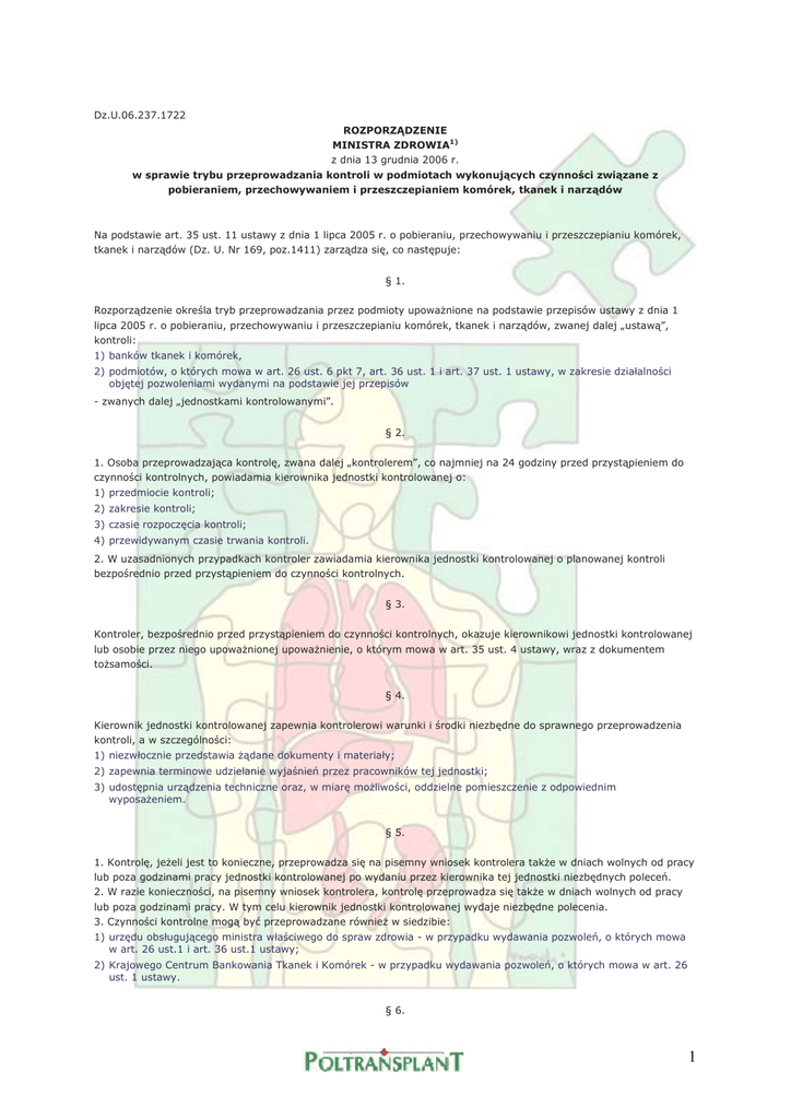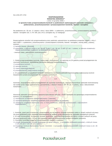 Dz.U.06.237.1722 ROZPORZĄDZENIE MINISTRA ZDROWIA1) z dnia 13 grudnia 2006 r. w sprawie trybu przeprowadzania kontroli w podmiotach wykonujących czynności związane z pobieraniem, przechowywaniem i przeszczepianiem komórek, tkanek i narządów Na podstawie art. 35 ust. 11 ustawy z dnia 1 lipca 2005 r. o pobieraniu, przechowywaniu i przeszczepianiu komórek, tkanek i narządów (Dz. U. Nr 169, poz.1411) zarządza się, co następuje: § 1. Rozporządzenie określa tryb przeprowadzania przez podmioty upoważnione na podstawie przepisów ustawy z dnia 1 lipca 2005 r. o pobieraniu, przechowywaniu i przeszczepianiu komórek, tkanek i narządów, zwanej dalej „ustawą”, kontroli: 1) banków tkanek i komórek, 2) podmiotów, o których mowa w art. 26 ust. 6 pkt 7, art. 36 ust. 1 i art. 37 ust. 1 ustawy, w zakresie działalności objętej pozwoleniami wydanymi na podstawie jej przepisów - zwanych dalej „jednostkami kontrolowanymi”. § 2. 1. Osoba przeprowadzająca kontrolę, zwana dalej „kontrolerem”, co najmniej na 24 godziny przed przystąpieniem do czynności kontrolnych, powiadamia kierownika jednostki kontrolowanej o: 1) przedmiocie kontroli; 2) zakresie kontroli; 3) czasie rozpoczęcia kontroli; 4) przewidywanym czasie trwania kontroli. 2. W uzasadnionych przypadkach kontroler zawiadamia kierownika jednostki kontrolowanej o planowanej kontroli bezpośrednio przed przystąpieniem do czynności kontrolnych. § 3. Kontroler, bezpośrednio przed przystąpieniem do czynności kontrolnych, okazuje kierownikowi jednostki kontrolowanej lub osobie przez niego upoważnionej upoważnienie, o którym mowa w art. 35 ust. 4 ustawy, wraz z dokumentem tożsamości. § 4. Kierownik jednostki kontrolowanej zapewnia kontrolerowi warunki i środki niezbędne do sprawnego przeprowadzenia kontroli, a w szczególności: 1) niezwłocznie przedstawia żądane dokumenty i materiały; 2) zapewnia terminowe udzielanie wyjaśnień przez pracowników tej jednostki; 3) udostępnia urządzenia techniczne oraz, w miarę możliwości, oddzielne pomieszczenie z odpowiednim wyposażeniem. § 5. 1. Kontrolę, jeżeli jest to konieczne, przeprowadza się na pisemny wniosek kontrolera także w dniach wolnych od pracy lub poza godzinami pracy jednostki kontrolowanej po wydaniu przez kierownika tej jednostki niezbędnych poleceń. 2. W razie konieczności, na pisemny wniosek kontrolera, kontrolę przeprowadza się także w dniach wolnych od pracy lub poza godzinami pracy. W tym celu kierownik jednostki kontrolowanej wydaje niezbędne polecenia. 3. Czynności kontrolne mogą być przeprowadzane również w siedzibie: 1) urzędu obsługującego ministra właściwego do spraw zdrowia - w przypadku wydawania pozwoleń, o których mowa w art. 26 ust.1 i art. 36 ust.1 ustawy; 2) Krajowego Centrum Bankowania Tkanek i Komórek - w przypadku wydawania pozwoleń, o których mowa w art. 26 ust. 1 ustawy. § 6. 1 1. Kontroler dokonuje ustaleń stanu faktycznego na podstawie zebranych w toku kontroli dowodów. 2. Zebrane w toku postępowania kontrolnego dowody kontroler odpowiednio zabezpiecza, w miarę potrzeby, przez: 1) oddanie na przechowanie kierownikowi jednostki kontrolowanej za pokwitowaniem; 2) przechowanie w jednostce kontrolowanej w oddzielnym, zamkniętym i opieczętowanym pomieszczeniu. 3. O zwolnieniu dowodów spod zabezpieczenia decyduje kontroler. 4. Kontroler może żądać od kierownika jednostki kontrolowanej sporządzenia, na jej koszt, niezbędnych do przeprowadzenia kontroli uwierzytelnionych kopii dokumentów, odpisów lub wyciągów z dokumentów, jak również zestawień i obliczeń dokonanych na podstawie dokumentów. 5. Kontroler może zabrać z jednostki kontrolowanej wyłącznie uwierzytelnione kopie, odpisy lub wyciągi z dokumentów. 6. Zgodność kopii, odpisów i wyciągów z oryginałami dokumentów oraz prawidłowość zestawień i obliczeń potwierdza kierownik komórki organizacyjnej jednostki kontrolowanej, której one dotyczą. § 7. 1. Jeżeli istnieje potrzeba ustalenia stanu obiektu, składników majątkowych, przedmiotów lub przebiegu określonych czynności kontroler może przeprowadzić oględziny. 2. Oględziny przeprowadza się w obecności kierownika jednostki kontrolowanej, a w razie jego nieobecności – osoby upoważnionej przez kierownika jednostki kontrolowanej. 3. Z przebiegu i wyniku oględzin sporządza się niezwłocznie protokół, który podpisuje kontroler i osoba wymieniona w ust. 2. § 8. 1. Każdy może złożyć kontrolerowi ustne lub pisemne oświadczenie dotyczące przedmiotu kontroli. 2. Kontroler nie może odmówić przyjęcia oświadczenia, jeżeli ma ono związek z przedmiotem kontroli. 3. Z ustnego oświadczenia kontroler sporządza protokół, który podpisuje kontroler i osoba składająca oświadczenie. § 9. 1. W szczególnie uzasadnionych okolicznościach kontroler może zgłosić wniosek o zwołanie w toku kontroli narady z pracownikami jednostki kontrolowanej w celu omówienia kwestii związanych z przeprowadzaną kontrolą. 2. Naradę zwołuje kierownik jednostki kontrolowanej lub upoważniona przez niego osoba. § 10. Kontroler w toku kontroli, w miarę potrzeby, informuje kierownika jednostki kontrolowanej o ustaleniach wskazujących na ujawnione nieprawidłowości i uchybienia w działalności tej jednostki. § 11. Kontroler może podczas przeprowadzania kontroli sporządzać dokumentację kontroli także w formie fotograficznej i filmowej. § 12. 1. Protokół kontroli sporządza się w dwóch jednobrzmiących egzemplarzach, z których jeden przekazuje się kierownikowi jednostki kontrolowanej. Odbiór egzemplarza protokołu kontroli kierownik jednostki kontrolowanej potwierdza na egzemplarzu kontrolera. 2. Protokół kontroli sporządza się niezwłocznie, nie później niż w terminie 14 dni od dnia zakończenia kontroli. 3. Protokół kontroli podpisują: kierownik jednostki kontrolowanej lub osoba przez niego upoważniona i kontroler. 4. K