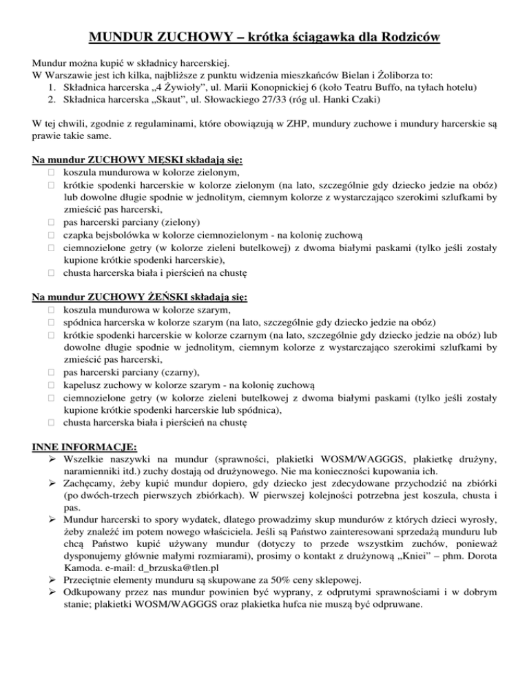 MUNDUR ZUCHOWY – krótka ściągawka dla Rodziców Mundur można kupić w składnicy harcerskiej. W Warszawie jest ich kilka, najbliższe z punktu widzenia mieszkańców Bielan i Żoliborza to: 1. Składnica harcerska „4 Żywioły”, ul. Marii Konopnickiej 6 (koło Teatru Buffo, na tyłach hotelu) 2. Składnica harcerska „Skaut”, ul. Słowackiego 27/33 (róg ul. Hanki Czaki) W tej chwili, zgodnie z regulaminami, które obowiązują w ZHP, mundury zuchowe i mundury harcerskie są prawie takie same. Na mundur ZUCHOWY MĘSKI składają się: koszula mundurowa w kolorze zielonym, krótkie spodenki harcerskie w kolorze zielonym (na lato, szczególnie gdy dziecko jedzie na obóz) lub dowolne długie spodnie w jednolitym, ciemnym kolorze z wystarczająco szerokimi szlufkami by zmieścić pas harcerski, pas harcerski parciany (zielony) czapka bejsbolówka w kolorze ciemnozielonym - na kolonię zuchową ciemnozielone getry (w kolorze zieleni butelkowej) z dwoma białymi paskami (tylko jeśli zostały kupione krótkie spodenki harcerskie), chusta harcerska biała i pierścień na chustę Na mundur ZUCHOWY ŻEŃSKI składają się: koszula mundurowa w kolorze szarym, spódnica harcerska w kolorze szarym (na lato, szczególnie gdy dziecko jedzie na obóz) krótkie spodenki harcerskie w kolorze czarnym (na lato, szczególnie gdy dziecko jedzie na obóz) lub dowolne długie spodnie w jednolitym, ciemnym kolorze z wystarczająco szerokimi szlufkami by zmieścić pas harcerski, pas harcerski parciany (czarny), kapelusz zuchowy w kolorze szarym - na kolonię zuchową ciemnozielone getry (w kolorze zieleni butelkowej z dwoma białymi paskami (tylko jeśli zostały kupione krótkie spodenki harcerskie lub spódnica), chusta harcerska biała i pierścień na chustę INNE INFORMACJE: Wszelkie naszywki na mundur (sprawności, plakietki WOSM/WAGGGS, plakietkę drużyny, naramienniki itd.) zuchy dostają od drużynowego. Nie ma konieczności kupowania ich. Zachęcamy, żeby kupić mundur dopiero, gdy dziecko jest zdecydowane przychodzić na zbiórki (po dwóch-trzech pierwszych zbiórkach). W pierwszej kolejności potrzebna jest koszula, chusta i pas. Mundur harcerski to spory wydatek, dlatego prowadzimy skup mundurów z których dzieci wyrosły, żeby znaleźć im potem nowego właściciela. Jeśli są Państwo zainteresowani sprzedażą munduru lub chcą Państwo kupić używany mundur (dotyczy to przede wszystkim zuchów, ponieważ dysponujemy głównie małymi rozmiarami), prosimy o kontakt z drużynową „Kniei” – phm. Dorota Kamoda. e-mail: [email protected] Przeciętnie elementy munduru są skupowane za 50% ceny sklepowej. Odkupowany przez nas mundur powinien być wyprany, z odprutymi sprawnościami i w dobrym stanie; plakietki WOSM/WAGGGS oraz plakietka hufca nie muszą być odpruwane.