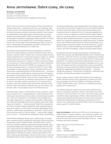 Anna Jermolaewa. Dobre czasy, złe czasy 28 lutego–10 maja 2015 wernisaż: 27 lutego 2015 kuratorka: Christiane Erharter współpraca ze strony Zachęty: Magdalena Komornicka Dobre czasy, złe czasy to tytuł pierwszej w Polsce indywidualnej wystawy austriacko-rosyjskiej artystki Anny Jermolaewej. Zapożyczony został z serii bezpretensjonalnych fotografii z 2007 roku, na których artystka uchwyciła zwyczajny obrazek z życia miasta: na wskazówkach ściennego zegara umieszczonego na szarej fasadzie przysiadły gołębie. Dzięki uszeregowaniu zdjęć widać, że dla gołębi szukających wygodnego miejsca godzina 14.45 jest o wiele lepsza niż na przykład 16.55. Tytuł wystawy nawiązuje również do niemieckiego serialu telewizyjnego Dobre czasy, złe czasy, nadawanego od poniedziałku do piątku w wieczornym paśmie prywatnej telewizji RTL od 1992 roku. Na wystawie prezentowane są prace pochodzące z ostatnich 15 lat oraz nowe produkcje o bardzo osobistej wymowie, jak np. Zakupy z rodziną z 2013. Znalazły się tu również projekty zainspirowane współczesnymi ruchami opozycyjnymi w Rosji, np. Metody społecznego oporu na przykładach rosyjskich z 2012 i prace o charakterze politycznym, związane z rodzinną historią artystki. Po raz pierwszy w Polsce wyświetlany jest film wideo Aleksandra Wysokińska/20 Jahre danach (2009): wzruszający portret Polki, która pomogła artystce w ucieczce do Austrii. W maju 1989 Jermolaewa musiała wyjechać z Rosji z powodów politycznych, była bowiem współzałożycielką Unii Demokratycznej — pierwszej partii opozycyjnej i współwydawcą wydawanej przez Unię gazety. Jermolaewa i jej ówczesny partner znaleźli się wówczas w Polsce. W Krakowie poznali kobietę, która nie tylko zorganizowała i sfinansowała ich ucieczkę, ale osobiście towarzyszyła im w drodze do Austrii i pomogła uzyskać azyl polityczny. Po upływie 20 lat artystka w poczuciu wdzięczności postanowiła odszukać Polkę, chociaż miała mało danych: wiedziała tylko, jak się nazywa, w jakim jest wieku i że pracowała w biurze architektonicznym. Instalacja wideo Zakupy z rodziną (2013) mówi o wzlotach i upadkach w naszym życiu, o niepowodzeniach i małych sukcesach. Bohaterką jest sama artystka, która czeka na chemioterapię i wybrała się z rodziną na zakup peruki. Jermolaewa zmienia wygląd, przymierzając kolejne peruki, a rodzina komentuje efekt. Slapstickowa forma tego genderowego performansu pozwala zapomnieć o jego tragicznym aspekcie — chorobie artystki. Akcja filmu rozgrywa się we wnętrzu przypominającym garderobę, gdzie gwiazdy przygotowują się do wyjścia na scenę. Tutaj rzeczywistą gwiazdą jest profesjonalna i utalentowana sprzedawczyni. Sprawnie i z dużym wyczuciem prezentuje peruki w różnych stylach — włosy krótkie i długie, jasne i ciemne — i przekonuje Jermolaewą do zakupu tej właściwej. Multimedialna instalacja Metody oporu społecznego na przykładach rosyjskich (2012) przedstawia imponujący zestaw twórczych metod oporu wobec rosyjskich władz. Na dużym stole, na poziomie oczu, artystka zrekonstruowała demonstrację zabawek, która rzeczywiście odbyła się w syberyjskim mieście Barnauł zimą 2012 roku. Organizatorom tej nielegalnej demonstracji udało się w dowcipny sposób podważyć sens zakazu demonstracji i zgromadzeń. Dopełnieniem instalacji jest wideo, w którym opozycjoniści z Moskwy i Petersburga opowiadają o różnych formach oporu i własnych doświadczeniach w walce z politycznym establishmentem w Rosji. Za sprawą instalacji Bez tytułu (Gułag) (2012) Jermolaewa zabiera nas w podróż w przeszłość. Podążamy za nią na kompletne odludzie, by odkryć historię jej rodziny, której część została wywłaszczona i zesłana do obozu w okolicach Permu. Im bardziej zagłębiamy się w ciemny i wciąż nie zakończony rozdział historii Związku Radzieckiego, tym wyraźniej widzimy, że kara więzienia dla przeciwników politycznych jako narzędzie zastraszania i opresji nie należy do przeszłości, lecz nadal jest stosowana we współczesnej Rosji. To właśnie w tym rejonie więziono Marię Alochinę, polityczną aktywistkę z punkowego zespołu Pussy Riot, dopóki nie została zwolniona w grudniu 2013 na mocy amnestii uchwalonej przed igrzyskami olimpijskimi w Soczi. Jak mówi Jermolaewa: „Gułag to koncept ponadczasowy”. W niektórych pracach artystki pochodzących z ostatnich dwudziestu lat kluczową rolę odgrywają zwierzęta, jak w instalacji Koty z Ermitażu z 2013. W 1745 roku na rozkaz rosyjskiej carycy Elżbiety sprowadzono z Kazania koty, które miały chronić Ermitaż przed gryzoniami. Po upływie ponad 250 lat petersburskie muzeum nadal zatrudnia całą armię kotów pełniących obowiązki straży muzealnej. Jermolaewa nie tylko przyznaje kotom status pracowników, ale tworzy też listę zasłużonych (Daśka Pachóta). Nawiązuje w ten sposób do niegdysiejszej socjalistycznej praktyki — nazwiska „bohaterów produkcji” umieszczano na tablicach w fabrykach jako przykład i zachętę dla pozostałych pracowników. Bardzo często punktem wyjścia dla projektów Jermolaewej są zwykłe, banalne sytuacje, które obserwuje w codziennym życiu, jak w przypadku prac Na bok (2008) czy Próbując przetrwać z 2000. Artystka mówi o nich: „Sceny te są metaforą procesów społecznych i politycznych”. Jermolaewa pokazuje również trzy nowe prace wykonane specjalnie na wystawę w Zachęcie. Także w nich pojawia się motyw zwierząt w roli pracowników; tym razem są to kozy biorące udział w produkcji oleju arganowego w Maroku. Dwie pozostałe prace nawiązują do eksperymentów Solomona Eliota Asha, amerykańskiego psychologa Gestalt, badającego zachowania konformistyczne, oraz radzieckiej psycholożki Walerii Muchiny analizującej wpływ sugestii na ludzkie wybory. Anna Jermolaewa urodziła się w 1970 roku w Petersburgu, od 1989 mieszka i pracuje w Wiedniu.