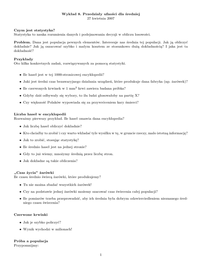 Wykład 8. Przedziały ufności dla średniej 27 kwietnia 2007 Czym