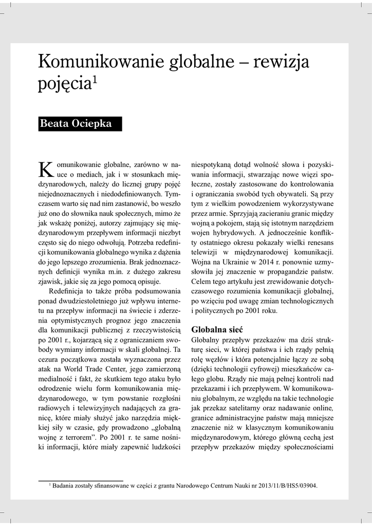 Komunikowanie globalne – rewizja pojęcia1 Beata Ociepka K omunikowanie globalne, zarówno w nauce o mediach, jak i w stosunkach międzynarodowych, należy do licznej grupy pojęć niejednoznacznych i niedodefiniowanych. Tymczasem warto się nad nim zastanowić, bo weszło już ono do słownika nauk społecznych, mimo że jak wskażę poniżej, autorzy zajmujący się międzynarodowym przepływem informacji niezbyt często się do niego odwołują. Potrzeba redefinicji komunikowania globalnego wynika z dążenia do jego lepszego zrozumienia. Brak jednoznacznych definicji wynika m.in. z dużego zakresu zjawisk, jakie się za jego pomocą opisuje. Redefinicja to także próba podsumowania ponad dwudziestoletniego już wpływu internetu na przepływ informacji na świecie i zderzenia optymistycznych prognoz jego znaczenia dla komunikacji publicznej z rzeczywistością po 2001 r., kojarzącą się z ograniczaniem swobody wymiany informacji w skali globalnej. Ta cezura początkowa została wyznaczona przez atak na World Trade Center, jego zamierzoną medialność i fakt, że skutkiem tego ataku było odrodzenie wielu form komunikowania międzynarodowego, w tym powstanie rozgłośni radiowych i telewizyjnych nadających za granicę, które miały służyć jako narzędzia miękkiej siły w czasie, gdy prowadzono „globalną wojnę z terrorem”. Po 2001 r. te same nośniki informacji, które miały zapewnić ludzkości 1 niespotykaną dotąd wolność słowa i pozyskiwania informacji, stwarzając nowe więzi społeczne, zostały zastosowane do kontrolowania i ograniczania swobód tych obywateli. Są przy tym z wielkim powodzeniem wykorzystywane przez armie. Sprzyjają zacieraniu granic między wojną a pokojem, stają się istotnym narzędziem wojen hybrydowych. A jednocześnie konflikty ostatniego okresu pokazały wielki renesans telewizji w międzynarodowej komunikacji. Wojna na Ukrainie w 2014 r. ponownie uzmysłowiła jej znaczenie w propagandzie państw. Celem tego artykułu jest zrewidowanie dotychczasowego rozumienia komunikacji globalnej, po wzięciu pod uwagę zmian technologicznych i politycznych po 2001 roku. Globalna sieć Globalny przepływ przekazów ma dziś strukturę sieci, w której państwa i ich rządy pełnią rolę węzłów i która potencjalnie łączy ze sobą (dzięki technologii cyfrowej) mieszkańców całego globu. Rządy nie mają pełnej kontroli nad przekazami i ich przepływem. W komunikowaniu globalnym, ze względu na takie technologie jak przekaz satelitarny oraz nadawanie online, granice administracyjne państw mają mniejsze znaczenie niż w klasycznym komunikowaniu międzynarodowym, którego główną cechą jest przepływ przekazów między społecznościami Badania zostały sfinansowane w części z grantu Narodowego Centrum Nauki nr 2013/11/B/HS5/03904. 12 podzielonymi tymi granicami. Komunikowanie globalne, mimo sieciowej struktury, nie eliminuje jednak nierówności, typowych także dla komunikowania międzynarodowego. Nadal wynikają one z nierównego rozwoju infrastruktury, który manifestuje się w małym dostępie do telewizji i internetu w wielu częściach świata; z analfabetyzmu; niskiego poziomu rozwoju gospodarczego, ale także z przyczyn politycznych związanych z międzynarodowymi rolami pełnionymi przez państwa – węzły – które prowadzą m.in. do politycznych ograniczeń swobody nadawania i odbioru przekazów. W komunikowaniu globalnym nadal dominują państwa Północy, ale jego cechą jest doprowadzenie do zmniejszenia tej dominacji. Obok państw i rządów aktorami komunikowania globalnego są koncerny medialne i media o światowym zasięgu, jak News Corporation, Time Warner, Facebook i Google, a także BBC World, CNN, Al Dżazira. Ich pozycja również może być związana z konkretnym państwem lub też mogą one być postrzegane jako reprezentanci bogatej Północy – oprócz Al Dżaziry – dzierżącej ciągle jeszcze władzę symboliczną w skali globalnej. W komunikowaniu globalnym zmienia się – w porównaniu z komunikowaniem międzynarodowym – pojęcie aktora komunikowania politycznego. W strukturze sieciowej państwa nie są bowiem wyłącznymi aktorami. Niezwykle istotne znaczenie ma komunikowanie za pomocą kultury popularnej, a dawni bierni odbiorcy propagandy zagranicznej stają się użytkownikami – jednocześnie nadawcami i odbiorcami przekazów – zgodnie z ideą mass self communication Manuela Castellsa2. Następuje więc zmiana modelu z transmisyjnego, dobrze oddającego hierarchiczną strukturę komunikowania międzynarodowego, na model sieciowy uwzględniający strukturę sieci i pojawienie się nowych aktorów – węzłów. 2 Beata Ociepka Mimo że media społecznościowe i nośniki mobilne dają podstawy do rozwoju sieciowej struktury komunikowania globalnego, nie oznacza to, że ta sieć jest powszechna. Procesy wykluczenia z komunikowania globalnego funkcjonują nadal. Biorąc pod uwagę te jednocześnie zachodzące zjawiska, można więc powiedzieć, że procesy typowe dla komunikowania międzynarodowego i globalnego odbywają się równolegle, w różnych częściach świata. Komunikowanie globalne można jednak w odniesieniu do państw wysoko rozwiniętych uznać za paradygmat następujący po komunikowaniu międzynarodowym, nawet przy założeniu, że nie jest ono geograficznie powszechne. Mimo sieciowego charakteru komunikowania globalnego narastają zjawiska „wyłączania” całych systemów narodowych z globalnej ekologii mediów: z przyczyn politycznych, za pomocą cenzury, z częstym uzasadnieniem opierającym się na zagrożeniu imperializmem kulturowym. Cezurą stał się także 11 września 2001 – „globalna wojna z terrorem” zakończyła erę idealistycznej swobody internetu. Ograniczenia dostępu, jak w Chinach, stały się narzędziem reżimów autorytarnych, wykluczającym obywateli wielu państw świata z globalnej sieci. Osobną kwestią stała się kontrola firm, j