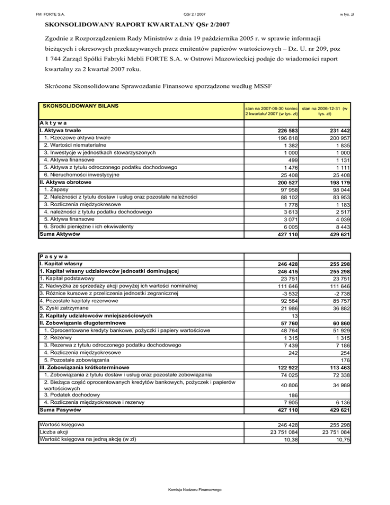 FM FORTE S.A. QSr 2 / 2007 w tys. zł SKONSOLIDOWANY RAPORT KWARTALNY QSr 2/2007 Zgodnie z Rozporządzeniem Rady Ministrów z dnia 19 października 2005 r. w sprawie informacji bieżących i okresowych przekazywanych przez emitentów papierów wartościowych – Dz. U. nr 209, poz 1 744 Zarząd Spółki Fabryki Mebli FORTE S.A. w Ostrowi Mazowieckiej podaje do wiadomości raport kwartalny za 2 kwartał 2007 roku. Skrócone Skonsolidowane Sprawozdanie Finansowe sporządzone według MSSF SKONSOLIDOWANY BILANS stan na 2007-06-30 koniec 2 kwartału/ 2007 (w tys. zł) Aktywa I. Aktywa trwałe 1. Rzeczowe aktywa trwałe 2. Wartości niematerialne 3. Inwestycje w jednostkach stowarzyszonych 4. Aktywa finansowe 5. Aktywa z tytułu odroczonego podatku dochodowego 6. Nieruchomości inwestycyjne II. Aktywa obrotowe 1. Zapasy 2. Należności z tytułu dostaw i usług oraz pozostałe należności 3. Rozliczenia międzyokresowe 4. należności z tytułu podatku dochodowego 5. Aktywa finansowe 6. Środki pieniężne i ich ekwiwalenty Suma Aktywów Pasywa I. Kapitał własny 1. Kapitał własny udziałowców jednostki dominującej 1. Kapitał podstawowy 2. Nadwyżka ze sprzedaży akcji powyżej ich wartości nominalnej 3. Różnice kursowe z przeliczenia jednostki zegranicznej 4. Pozostałe kapitały rezerwowe 5. Zyski zatrzymane 2. Kapitały udziałowców mniejszościowych II. Zobowiązania długoterminowe 1. Oprocentowane kredyty bankowe, pożyczki i papiery wartościowe 2. Rezerwy 3. Rezerwa z tytułu odroczonego podatku dochodowego 4. Rozliczenia międzyokresowe 5. Pozostałe zobowiązania III. Zobowiązania krótkoterminowe 1. Zobowiązania z tytułu dostaw i usług oraz pozostałe zobowiązania 2. Bieżąca część oprocentowanych kredytów bankowych, pożyczek i papierów wartościowych 3. Podatek dochodowy 4. Rozliczenia międzyokresowe i rezerwy Suma Pasywów Wartość księgowa Liczba akcji Wartość księgowa na jedną akcję (w zł) Komisja Nadzoru Finansowego stan na 2006-12-31 (w tys. zł) 226 583 196 818 1 382 1 000 499 1 476 25 408 200 527 97 958 88 102 1 778 3 613 3 071 6 005 427 110 231 442 200 957 1 835 1 000 1 131 1 111 25 408 198 179 98 044 83 953 1 183 2 517 4 039 8 443 429 621 246 428 246 415 23 751 111 646 -3 532 92 564 21 986 13 57 760 48 764 1 315 7 439 242 255 298 255 298 23 751 111 646 -2 738 85 757 36 882 122 922 74 025 60 860 51 929 1 315 7 186 254 176 113 463 72 338 40 806 34 989 186 7 905 427 110 6 136 429 621 246 428 23 751 084 10,38 255 298 23 751 084 10,75 FM FORTE S.A. SKONSOLIDOWANY RACHUNEK ZYSKÓW I STRAT DZIAŁALNOŚĆ KONTYNUOWANA I. Przychody ze sprzedaży w tym: 1. Przychody netto ze sprzedaży produktów, towarów i materiałów 2. Przychody netto ze sprzedaży usług QSr 2 / 2007 w tys. zł 2 kwartał 2007 okres 2 kwartały / 2007 okres 2 kwartał 2006 okres 2 kwartały / 2006 okres od 2007-04-01 do 2007- od 2007-01-01 do 2007- od 2006-04-01 do 2006- od 2006-01-01 do 200606-30 06-30 06-30 06-30 114 035 235 335 95 094 202 153 112 401 231 948 91 982 197 470 1 634 3 387 3 112 4 683 85 880 28 155 1 314 19 511 11 156 4 445 (5 643) 2 997 177 052 58 283 1 535 38 953 20 539 6 604 (6 278) 6 925 70 319 24 775 1 361 18 340 12 696 1 471 (6 371) 1 141 147 672 54 481 1 755 35 247 23 617 3 079 (5 707) 1 963 (513) 178 152 152 1 713 1 713 39 (1 193) 69 75 86 2 951 4 965 914 1 725 1 282 1 244 38 2 439 2 391 38 3 272 963 79 4 109 1 712 79 265 265 2 053 2 053 (8 502) 257 608 (351) (7 853) 801 1 249 (448) (8 759) (8 654) (2 141) (10) (8 759) (8 654) (0,09) (0,37) (0,36) II. Koszt własny sprzedaży III. Zysk (strata) brutto ze sprzedaży 1. Pozostałe przychody operacyjne 2. Koszty sprzedaży 3. Koszty ogólnego zarządu 4. Pozostałe koszty operacyjne IV. Zysk (strata) z działalności operacyjnej V. Przychody finansowe 1. Dywidendy od jednostek powiązanych nie objętych konsolidacją 2. Zysk ze zbycia aktywów finansowych 3. Aktualizacja wartości aktywów finansowych 4. Odsetki 5. Instrumenty finansowe ( kontrakty forward ) 6. Dodatnie różnice kursowe od aktywów i zobowiązań finansowych VI. Koszty finansowe 1. Odsetki od kredytów i pożyczek 2. Prowizje od kredytów 3. Ujemne różnice kursowe od aktywów i zobowiązań finansowych 4. Instrumenty finansowe ( kontrakty forward ) 5. Pozostałe koszty finansowe IX. Zysk (strata) brutto X. Podatek dochodowy a) część bieżąca b) część odroczona XVI. Zysk (strata) netto akcjonariuszy mniejszościowych XV. Zysk (strata) netto 0 (3 928) (205) 37 (242) 10 (3 733) 10 (1 792) 349 738 (389) 10 (2 151) Przypadający: - akcjonariuszom jednostki dominującej - akcjonariuszom mniejszościowym (3 723) (10) Zysk (strata) netto na jedną akcję: - podstawowy/rozwodniony z wyniku za okres (0,16) Komisja Nadzoru Finansowego FM FORTE S.A. QSr 2 / 2007 w tys. zł SKONSOLIDOWANE ZESTAWIENIE ZMIAN W KAPITALE WŁASNYM za okres 6 miesięcy zakończony dnia 30 czerwca 2007 roku Kapitał Podstawowy Na dzień 1 stycznia 2007 roku 23 751 Nadwyżka ze sprzedaży akcji powyżej ich wartości nominalnej 111 646 Różnice kursowe z Zyski przeliczenia zatrzymane/stra jednostki ty niepokryte zagranicznej -2 738 Pozostałe kapitały rezerwowe 36 882 85 757 2. Odpis wyniku lat ubiegłych na kapitał rezerwowy -6 807 6 807 3. Wypłata dywidendy -5 938 4. Wynik finansowy okresu -2 151 Kapitał udziałowców Kapitał własny mniejszościow ogółem ych 255 298 1. Emisja akcji 5. Różnice kursowe z przeszacowania -5 938 13 -794 Na dzień 30 czerwca 2007 roku 23 751 111 646 -3 532 -2 138 -794 21 986 92 564 13 246 428 SKONSOLIDOWANE ZESTAWIENIE ZMIAN W KAPITALE WŁASNYM za okres 6 miesięcy zakończony dnia 30 czerwca 2006 roku Kapitał Podstawowy Na dzień 1 stycznia 2006 roku 1. Emisja akcji Nadwyżka ze sprzedaży akcji powyżej ich wartości nominalnej 23 683 111 041 65 578 Różnice kursowe z Zyski przeliczenia zatrzymane/stra jednostki ty niepokryte zagranicznej -1 718 37 461 Pozostałe kapitały rezerwowe 77 791 Kapitał udziałowców Kapitał wła