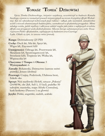 Tomasz "Tomek" Dzikowski Ojciec Tomka Dzikowskiego, inżynier wojskowy, uczestniczył w budowie Kanału Sueskiego, a potem w rozmaitych pracach inżynieryjnych na terenie brytyjskiej Afryki Wschodniej. Syn nie odziedziczył technicznych pasji rodzica – odkąd, jako nastolatek, samodzielnie uciekł z niewoli zbuntowanych Sudańczyków, zasmakował w afrykańskiej przygodzie. Mimo młodego wieku, polski myśliwy i odkrywca zdobył rozgłos jako jeden z najlepszych strzelców Afryki oraz przyjaciel wielu dzikich plemion. Obecnie kieruje założonym przez siebie Towarzystwem Polsko-Afrykańskim, zajmującym się badaniem serca Czarnego Lądu. Chlubi się tym, że zawsze mówi prawdę. Ranga: Doświadczony (25 PD) Cechy: Duch k6, Siła k6, Spryt k6, Wigor k8, Zręczność k10 Umiejętności: Odwaga k6, Przetrwanie k8, Skradanie k4, Spostrzegawczość k6, Strzelanie k10, Tropienie k4, Walka k6, Wspinaczka k4 Charyzma: 0 Tempo: 6 Obrona: 5 Wytrzymałość: 6 Zawady: Bohaterski, Dziwactwo (zawsze mówi prawdę), Jonasz (drobna) Przewagi: Czujny, Podróżnik, Ulubiona broń, Sokole oko Sprzęt: Nóż myśliwski (Si+k4), sztucer „Polonia” (24/48/96, obr 2k8, SzS 1, 15 kul), pudełko 50 nabojów, manierka, mapa Afryki Centralnej, kask korkowy (Pancerz 1 na głowie) Języki: Polski, angielski, suahili, arabski Eleonore "Nelly" Allen Córka brytyjskiego egiptologa i młodzieńcza miłość Tomka. W dzieciństwie oboje znaleźli się w niewoli zbuntowanych Beduinów, z której uciekli przeżywając mnóstwo niezwykłych przygód. Ukończyła historię na uniwersytecie Cambridge, okazała się zbyt niezależna na akademika – zamiast kontynuować prace ojca w Dolinie Królów, wyjechała do Afryki Wschodniej, by poszukiwać śladów tajemniczej krainy Punt i innych zaginionych cywilizacji. Regularnie współpracuje z Towarzystwem Polsko-Afrykańskim, wspólnie organizując wyprawy badawcze, zwalczając przemytników starożytności i kłusowników, polujących na słonie. Słynie z brawury. Ranga: Doświadczony (25 PD) Cechy: Duch k8, Siła k6, Spryt k6, Wigor k6, Zręczność k8 Umiejętności: Odwaga k6, Przekonywanie k4, Przetrwanie k4, Skradanie k6, Spostrzegawczość k6, Strzelanie k8, Walka k6, Wiedza (Historia starożytna) k6, Wspinaczka k6, Wyśmiewanie k6 Charyzma: 0; Tempo: 6; Obrona: 5; Wytrzymałość: 5 Zawady: Chojrak, Uparciuch, Zobowiązanie (ratować słonie) Przewagi: Akrobatka, Oburęczna, Podwójne uderzenie, Unik, Opanowana Sprzęt: Rewolwer MAS Mle (10/20/40, obr. 2k6, SzS1, 6 naboi), rewolwer Nagant (12/24/48, Obr. 2k6+1, SzS 1, 7 naboi), 50 naboi do każdego, dwa noże sprężynowe (Si+k4), latarka. Języki: Polski, angielski, suahili, arabski Simba Syn wodza plemienia Wahima, w dzieciństwie uprowadzony przez handlarzy niewolnikami i sprzedany Beduinom, którzy porwali Tomka i Nelly. Cała trójka wspólnie uciekła z niewoli i wielokrotnie ratowała sobie życie. Jako najbliższy przyjaciel Tomka stanowi afrykański komponent Towarzystwa. Choć bystry umysł i ciekawość świata nie pozwalają mu osiąść na dobre w rodzinnej wiosce, nie przyjął zwyczajów białych ludzi, które fascynują go podobnie, jak zwyczaje czarnoskórych Afrykanów – Tomka. Znakomicie posługuje się włócznią, doskonale tropi i podochodzi zwierzynę, a w wolnych chwilach duma, czy nie wyjechać do zimnej, północnej Europy na wyprawę badawczą. Na miejscu trzyma go jednak świadomość, że pewnego dnia musi wrócić do rodzinnego plemienia i objąć nad nim władzę. Ranga: Doświadczony (25 PD) Cechy: Duch k6, Siła k6, Spryt k8, Wigor k8, Zręczność k6 Umiejętności: Przetrwanie k8, Rzucanie k6, Skradanie k6, Spostrzegawczość k8, Tropienie k8, Walka k6, Wiedza (Strategia) k6 Charyzma: -2; Tempo: 6; Obrona: 5; Wytrzymałość: 7 Zawady: Zobowiązanie (wobec plemienia Wahimów), Analfabeta, Odszczepieniec (Murzyn w kolonialnej Afryce) Przewagi: Krzepki, Baczność!, Tropiciel, Nie przejdą!, Nerwy ze stali Sprzęt: Włócznia zuluska (Si+k6), tarcza (+2 do Obrony, +2 przeciw atakom zasięgowym), naszyjnik z kości. Języki: Suahili, polski, angielski, arabski, francuski Ksenia Drohomirecka Córka polskiego powstańca i greckiej bojowniczki o wolność, urodzona w Samarkandzie, jest z ducha rewolucjonistką, zaangażowaną bez reszty w każdą formę walki z uciskiem. Poszukiwana w carskiej Rosji, wydalona z osmańskiej Turcji i uznana za persona non grata w Niemczech, przybyła na Czarny Ląd, by walczyć z kolonialnym ciemięzcą. Uchodzi za najpiękniejszą kobietę brytyjskiej Afryki Wschodniej – jej egzotycznej urodzie dorównuje diaboliczny spryt oraz aura tajemniczości prawdziwej femme fatale. Tomek i Simba nie zawsze pochwalają jej metody, ale nawet oni nie umieją oprzeć się jej urokowi. Ranga: Doświadczony (25 PD) Cechy: Duch k6, Siła k4, Spryt k6, Wigor k6, Zręczność k8 Umiejętności: Odwaga k6, Przekonywanie k6, Reperowanie k6, Rzucanie k6, Skradanie k8, Spostrzegawczość k6, Strzelanie k4, Wiedza (Materiały wybuchowe) k6, Włamywanie k6, Wspinaczka k6, Wypytywanie k6, Wyszukiwanie k6, Zastraszanie k6 Charyzma: +4, Tempo: 6, Obrona: 2; Wytrzymałość: 5 Zawady: Mściwa (poważna), Poszukiwana (drobna), Lojalna Przewagi: Szósty zmysł, Śliczna, Złodziej Sprzęt: Pistolet Bergmann Simplex (10/20/40, obr. 2k6, SzS1, 8 naboi, dublet), 24 naboje, 12 lasek dynamitu (4/8/16, 2k6 za laskę, Średni Wzornik Wybuchu +1 cal za każdą dodatkową laskę), wbrew rozsądkowi – strój na każdą okazję. Języki: Polski, rosyjski, niemiecki, francuski ojciec Franciszek Gall Ojciec Franciszek jest jednocześnie żarliwym katolikiem i pozytywistą, przekonanym o tym, że świat jest całkowicie poznawalny. Do Afryki przyjechał jako misjonarz, zamiast kościoła wybudował jednak szpital, który w jego opinii znacznie bardziej przydaje się potrzebującym. Żywi niezachwiane przekonanie, że Bóg działa poprzez naturę, uprawia teologię racjonalną i nie ma cier