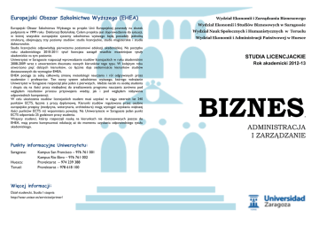 Europejski Obszar Szkolnictwa Wyższego (EHEA) Europejski Obszar Szkolnictwa Wyższego to projekt Unii Europejskiej powstały na skutek podpisania w 1999 roku Deklaracji Bolońskiej. Celem projektu jest doprowadzenie do sytuacji, w której wszystkie europejskie systemy szkolnictwa wyższego będą posiadały jednolitą strukturę, obejmującą trzy poziomy studiów: studia licencjackie, studia magisterskie i studia doktoranckie. Studia licencjackie odpowiadają pierwszemu poziomowi edukacji akademickiej. Na początku roku akademickiego 2010-2011 tytuł licencjata zastąpił wszelkie wcześniejsze tytuły akademickie na tym poziomie. Uniwersytet w Saragossie rozpoczął wprowadzanie studiów licencjackich w roku akademickim 2008-2009 wraz z utworzeniem dwunastu nowych kierunków tego typu. W kolejnym roku otworzono pięć dalszych kierunków, co łącznie daje siedemnaście kierunków studiów dostosowanych do wymogów EHEA. EHEA pociąga za sobą całkowitą zmianę metodologii nauczania i ról odgrywanych przez studentów i profesorów. Ten nowy system szkolnictwa wyższego, którego wdrażanie Uniwersytet w Saragossie rozpoczął jako jeden z pierwszych, kładzie nacisk na osobę studenta i skupia się na ilości pracy niezbędnej do zrealizowania programu nauczania zarówno pod względem rezultatów procesu przyswajania wiedzy, jak i pod względem nabywania odpowiednich kompetencji. W celu ukończenia studiów licencjackich student musi uzyskać w ciągu czterech lat 240 punktów ECTS, łącznie z pracą dyplomową. Kierunki studiów regulowane przez osobne europejskie przepisy (medycyna, weterynaria, architektura) mogą wymagać uzyskania większej ilości punktów ECTS niż wspomniana powyżej. Na Uniwersytecie w Saragossie jeden punkt ECTS odpowiada 25 godzinom pracy studenta. Wszyscy studenci, którzy rozpoczęli naukę na kierunkach nie dostosowanych jeszcze do EHEA, mają prawo kontynuować edukację aż do momentu uzyskania odpowiedniego tytułu akademickiego. Punkty informacyjne Uniwersytetu: Saragossa: Huesca: Teruel: Kampus San Francisco – 976 761 001 Kampus Río Ebro – 976 761 002 Prorektorat – 974 239 388 Prorektorat – 978 618 100 Więcej informacji: Dział studencki, Studia I stopnia http://wzar.unizar.es/servicios/primer/ Wydział Ekonomii i Zarządzania Biznesowego Wydział Ekonomii i Studiów Biznesowych w Saragossie Wydział Nauk Społecznych i Humanistycznych w Teruelu Wydział Ekonomii i Administracji Państwowej w Huesce STUDIA LICENCJACKIE Rok akademicki 2012-13 BIZNES , ADMINISTRACJA I ZARZĄDZANIE 1 1 1 1 2 2 2 2 2 3 3 3 3 3 4 S1 S1 S1 S1 S1 S1 S1 S1 S1 S1 S1 S1 S1 S1 S1 Perspektywy zawodowe Absolwenci kierunku Biznes, administracja i zarządzanie posiadają kwalifikacje odpowiednie do wykonywania zawodu ekonomisty. Kierunek ten pozwala pracować zarówno w sektorze publicznym jak i prywatnym. W sektorze publicznym przyszli ekonomiści będą mogli znaleźć zatrudnienie w administracji w międzynarodowej, państwowej, regionalnej lub lokalnej, np. jako inspektorzy podatkowi, inspektorzy Skarbu Państwa, ekonomiści państwowi, ekonomiści administracji regionalnej lub lokalnej, administratorzy, inspektorzy banku centralnego, inspektorzy pracy, inspektorzy socjalni itp. Kierunek pozwala również na aktywność zawodową związaną z nauczeniem o biznesie. W sektorze prywatnym można natomiast wskazać dwie możliwości: prowadzenie własnej działalności gospodarczej lub pracę w ramach innej firmy. Kontakt Biuro Sekretariatu Wydziału Ekonomii i Zarządzania biznesowego ......................... 976 76 1000 Ext. 46 01 Biuro Sekretariatu Wydział Ekonomii i Studiów Biznesowych w Saragossie........... 976 762 747 Biuro Sekretariatu Wydział Nauk Społecznych i Humanistycznych w Teruelu....... 978 618 137 Biuro Sekretariatu Wydziału Ekonomii i Administracji Państwowej w Huesce....... 974 239 373 Więcej informacji http://www.unizar.es/centros/fccee/ http://eueez.unizar.es/ 6 6 6 6 6 6 6 6 6 6 6 6 6 6 6 1 1 1 1 2 2 2 2 2 3 3 3 3 3 4 S2 S2 S2 S2 S2 S2 S2 S2 S2 S2 S2 S2 S2 S2 S2 Historia i ekonomia/ Historia ekonomii i gospodarki światowej Biznes / Rachunkowośd i finanse II Ekonomia /Mikroekonomia I Matematyka /Matematyka II Statystyka /Statystyka I Analiza i ocena operacji finansowych Gospodarka hiszpaoska Sprawozdania finansowe Wprowadzenie do badao rynkowych Makroekonomia II Zarządzanie księgowością Zarządzanie produkcją Zarządzanie zasobami ludzkimi Zarządzanie ryzykiem finansowym Polityka firmy Praca dyplomowa ECTS Kategoria Rok Semestr ECTS S2 4 4 4 4 4 S1 S1 S1 S1 S1 4 S1 4 S1 4 4 4 4 4 4 S1 S1 S1 S1 S1 S1 4 S1 Fb 6 Fb Fb Fb Fb Ob Ob Ob Ob Ob Ob Ob Ob Ob Ob Tg Metody ekonometryczne w biznesie Księgowośd w sektorze publicznym Decyzje biznesowe Prawo handlowe Zarządzanie podmiotami ekonomii społecznej Zarządzanie firmami międzynarodowymi Innowacja i zmiany technologiczne Przekształcenia w firmie Badania operacyjne Logistyka i łaocuchy zaopatrzenia Rynki finansowe Zarządzanie kontrolą Technologie ICT w biznesie Biznesowy język obcy (angielski, francuski lub niemiecki) Praktyki w firmie I Op Op Op Op Op 6 6 6 6 6 6 6 6 6 6 6 6 6 6 6 ECTS Przedmiot Kategoria Przedmiot Rok Praca dyplomowa: Suma punktów kredytowych: max. 12 ECTS (łącznie z opcyjnymi) 6 240 Rok Praktyki zewnętrzne: 1 PRZEDMIOTY OPCYJNE Semestr 60 128 46 6 Przedmiot Poziom B1 wybranego języka obcego (angielski, Ob 2 francuski lub niemiecki) Kategorie przedmiotów zawartych w programie nauczania i odpowiadające im punkty ECTS: Przedmioty podstawowe (Fb) Obowiązkowe (Ob); Opcyjne (Op); Kategoria Biznes / Podstawy biznesu, Fb Administracja i zarządzanie Biznes /Rachunkowośd i finanse Fb Matematyka / Matematyka I Fb Biznes /Wprowadzenie do marketingu Fb Prawo /Wprowadzenie do prawa Fb Statystyka II Ob Rozliczenia podatkowe firm Ob Makroekonomia I Ob Mikroekonomia II Ob Zarządzanie wewnętrzne i organizacyjne Ob Analiza rynków finansowych Ob Zarządzanie biznesow