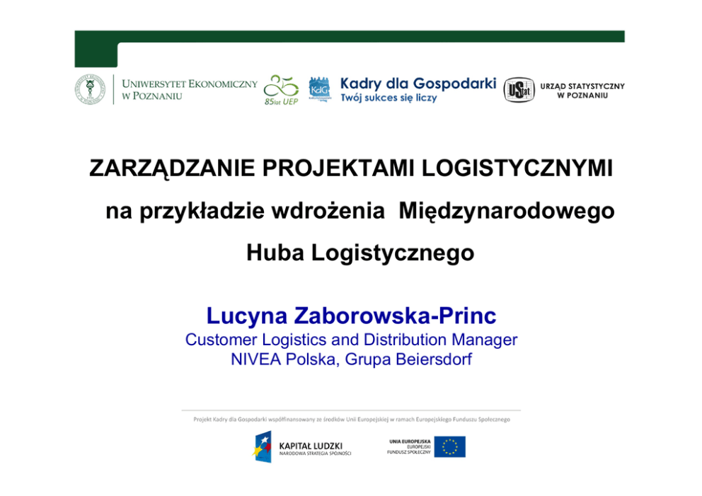 ZARZĄDZANIE PROJEKTAMI LOGISTYCZNYMI na przykładzie wdrożenia Międzynarodowego Huba Logistycznego Lucyna Zaborowska-Princ Customer Logistics and Distribution Manager NIVEA Polska, Grupa Beiersdorf 2 Agenda Organizacja logistyki w Beiersdorf Czym jest projekt? Wdrożenie międzynarodowego centrum logistycznego w 10 krokach Jak to działa w praktyce? Najważniejsze doświadczenia projektowe Strategia logistyczna Beiersdorf Miejsce logistyki SCOPE – projekt zmiany Supply Chain Wdrożenie HUBów 4 Organizacja logistyki w Beiersdorf Podstawowy element struktury logistyki – międzynarodowe centra logistyczne (HUBy) Przygotowane do obsługi różnych funkcji logistycznych na określony region m.in.: Konsolidacja zapotrzebowania na dany rynek Magazynowanie, zarządzanie zapasem Kompletacja i dystrybucja Usługi dodatkowe (np. przepakowywanie, pakowanie promocji, pakowanie pod specjalne wymagania Klientów) Lokalizacja HUBów – optymalna ze względu na określone kryteria, np. możliwości wykonania procesu ilości przepływów logistycznych koszty operacji Przed wdrożeniem … PRODUKCJA Dostawca surowców MAGAZYNOWANIE i USŁUGI DODATKOWE PC A Lokalny magazyn PC B Lokalny magazyn Lokalny magazyn 3rd Dostawca usług dodatkowych DOSTAWY Klient – kraj A Klient – kraj B Klient – kraj C Po wdrożeniu … PRODUKCJA Dostawca surowców MAGAZYNOWANIE i USŁUGI DODATKOWE PC A PC B 3rds DOSTAWY Klient – kraj A HUB outsoursowany Dostawca usług dodatkowych Klient – kraj B Klient – kraj C HUB NEE (North Eastern Europe) Lokalizacja: Polska, Gądki k. Poznania Obsługiwane kraje / projekty wdrożeniowe: Polska (Lut 2007) -> dostawy bezpośrednie Rosja, Ukraina (Lip 2007) -> zaopatrzenie lokalnych magazynów Inne kraje CIS (Lip 2007) -> eksport do lokalnych dystrybutorów Czechy i Słowacja (Maj 2008) -> dostawy bezpośrednie Węgry (Lip 2008) -> dostawy bezpośrednie Kraje Bałtyckie (obecnie wdrażane) -> magazyn satelita Definicja projektu PROJEKT Tymczasowa działalność podejmowana w celu wytworzenia unikalnego wyrobu, dostarczenia unikalnej usługi lub osiągnięcia unikalnego rezultatu PROJEKT LOGISTYCZNY Dotyczy zmian w procesach logistycznych Przydatne nastawienie: 1. Proces 2. Jakość 3. Koszty 9 Zarządzanie projektami według PMI CIA CYKL ŻY U: PROJEKT zęcie 1. Rozpoc anie 2. Planow cja 3. Realiza zenie 4. Zakońc OBSZAR Y ZARZĄD ZA PROJEK NIA TAMI: • Integra lność pro jektu • Zakres • Czas • Koszty • Jakość • Zasob y lu • Komun dzkie ika • Ryzyko cja • Zaopa trzenie NARZĘDZIA: • WBS • Wykresy Gantta • Diagramy sieciowe •… Krok 1: Cel i wymagania projektu OKREŚLENIE CELU: Przeniesienie funkcji logistycznych z lokalnych centrów logistycznych w Czechach i Słowacji do HUBa NEE w Polsce Poznań Poznań Prague Prague Brno Brno Bratislava Bratislava 11 Krok 2: Struktura i Plan Projektu Struktura projektu: Sponsor, Kierownik Projektu, Komitet sterujący Powołanie i odpowiednie umocowanie Kierownika Projektu odpowiedzialnego za dostarczenie wyniku projektu Plan Projektu: formalny zbiór dokumentów zatwierdzający pracę projektową TWORZENIE PLANU PROJEKTU Karta projektu WB Harmonogram Zespół projektowy Plan zarządzania komunikacji Plan zarządzania ryzykiem … 12 Krok 3: Ograniczenia i największe wyzwania Tajność projektu Duży zakres zmian Dla niektórych jednostek organizacyjnych krytyczne zmiany Kultura korporacyjna Znaczenie różnic kulturowych Istotność wymagań Klientów Ograniczenia prawne Rozwiązania IT Krok 4: Zakres projektu (WBS) Zakres projektu: suma wszystkich wyrobów oraz usług wytwarzanych lub dostarczanych w projekcie Wstępnie zakres opisany jest przez wymagania projektu, po rozpoczęciu projektu należy dookreślić szczegóły WBS (Work Breakdown Structure) – dekompozycja produktu końcowego projektu, dzieli pracę na mniejsze, łatwiejsze w zarządzaniu fragmenty prac TWORZENIE WBSa Zdefiniuj produkt końcowy projektu Zdekomponuj produkt końcowy projektu na mniejsze fragmenty prac (pierwszy poziom WBSa) Zdekomponuj pierwszy poziom na kolejne poziomy mniejszych fragmentów prac (poziom podziału zależy od poziomu, jakim zarządza Kierownik Projektu) Krok 4: Zakres projektu (WBS) Zaopatrzenie w produkty gotowe Centrum Produkcyjne Centrum Produkcyjne Dostawy Hub NEE Beiersdorf CZECHY Magazynowanie Klienci Centrum Produkcyjne Podwykonawcy Inni Dostawcy Dostawcy komponentów Usługi VAS Beiersdorf SŁOWACJA Klienci Zwroty i reklamacje OKREŚLENIE WBS: Poszczególne funkcje logistyczne Krok 4: Zakres projektu (WBS) Warehouse Building Racking system Supply NART Forklifts Products System Forecast system Employees Supply system Contract BDF-Whs operator Employees PL stock transfer VAS Deliveries Standard labelling Order Handling Multipacks = Metropacks Transport Promotions After Delivery Structures Contract DC - HUB Assortment cartoms Test delivery WYMAGANIA WYMAGANIA ZAKRES ZAKRES (WBS) (WBS) AS CZ KO SZ TY Krok 4: Zakres projektu (WBS) 17 Krok 5: Harmonogram projektu WBS definiuje pracę do zrobienia Przygotowanie harmonogramu wymaga, aby praca ta została opisana i skwantyfikowana Harmonogram powinien być oparty na WBSie TWORZENIE HARMONOGRAMU 1. Przygotuj listę elementów projektu (na podstawie WBS) 2. Oceń każdy element: • • • Jak długo potrzebujemy na jego wykonanie? Kto i co jest potrzebne do wykonania? Za ile zostanie wykonane? 3. Oceń zależności: • • Poprzednicy / następcy Inne zależności / ograniczenia CZAS TRWANIA ZASOBY KOSZTY 18 Krok 5: Harmonogram projektu Wizualizacja: diagramy sieciowe, wykresy Gantta, wykresy kamieni milowych 19 Krok 6: Interesariusze i zarządzanie komunikacją Analiza interesariuszy: Sponsor Kto otrzymuje rezultaty? Kto dostarcza danych, materiałów? Członkowie zespołu Kto nadzoruje? Projekt Kto jest decyzyjny? Kto ma inne obowiązki? Klient Pracownicy … Oczekiwania interesariuszy: Są podstawą satysfakcji odbiorcy projektu Powinny być monitorowane i 