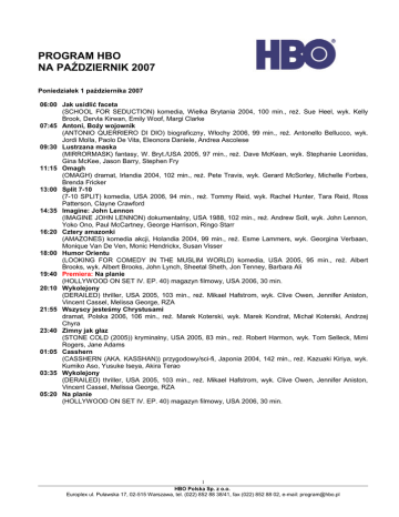 PROGRAM HBO NA PAŹDZIERNIK 2007 Poniedziałek 1 października 2007 06:00 Jak usidlić faceta (SCHOOL FOR SEDUCTION) komedia, Wielka Brytania 2004, 100 min., reż. Sue Heel, wyk. Kelly Brook, Dervla Kirwan, Emily Woof, Margi Clarke 07:45 Antoni, Boży wojownik (ANTONIO QUERRIERO DI DIO) biograficzny, Włochy 2006, 99 min., reż. Antonello Bellucco, wyk. Jordi Molla, Paolo De Vita, Eleonora Daniele, Andrea Ascolese 09:30 Lustrzana maska (MIRRORMASK) fantasy, W. Bryt./USA 2005, 97 min., reż. Dave McKean, wyk. Stephanie Leonidas, Gina McKee, Jason Barry, Stephen Fry 11:15 Omagh (OMAGH) dramat, Irlandia 2004, 102 min., reż. Pete Travis, wyk. Gerard McSorley, Michelle Forbes, Brenda Fricker 13:00 Split 7-10 (7-10 SPLIT) komedia, USA 2006, 94 min., reż. Tommy Reid, wyk. Rachel Hunter, Tara Reid, Ross Patterson, Clayne Crawford 14:35 Imagine: John Lennon (IMAGINE JOHN LENNON) dokumentalny, USA 1988, 102 min., reż. Andrew Solt, wyk. John Lennon, Yoko Ono, Paul McCartney, George Harrison, Ringo Starr 16:20 Cztery amazonki (AMAZONES) komedia akcji, Holandia 2004, 99 min., reż. Esme Lammers, wyk. Georgina Verbaan, Monique Van De Ven, Monic Hendrickx, Susan Visser 18:00 Humor Orientu (LOOKING FOR COMEDY IN THE MUSLIM WORLD) komedia, USA 2005, 95 min., reż. Albert Brooks, wyk. Albert Brooks, John Lynch, Sheetal Sheth, Jon Tenney, Barbara Ali 19:40 Premiera: Na planie (HOLLYWOOD ON SET IV. EP. 40) magazyn filmowy, USA 2006, 30 min. 20:10 Wykolejony (DERAILED) thriller, USA 2005, 103 min., reż. Mikael Hafstrom, wyk. Clive Owen, Jennifer Aniston, Vincent Cassel, Melissa George, RZA 21:55 Wszyscy jesteśmy Chrystusami dramat, Polska 2006, 106 min., reż. Marek Koterski, wyk. Marek Kondrat, Michał Koterski, Andrzej Chyra 23:40 Zimny jak głaz (STONE COLD (2005)) kryminalny, USA 2005, 83 min., reż. Robert Harmon, wyk. Tom Selleck, Mimi Rogers, Jane Adams 01:05 Casshern (CASSHERN (AKA. KASSHAN)) przygodowy/sci-fi, Japonia 2004, 142 min., reż. Kazuaki Kiriya, wyk. Kumiko Aso, Yusuke Iseya, Akira Terao 03:35 Wykolejony (DERAILED) thriller, USA 2005, 103 min., reż. Mikael Hafstrom, wyk. Clive Owen, Jennifer Aniston, Vincent Cassel, Melissa George, RZA 05:20 Na planie (HOLLYWOOD ON SET IV. EP. 40) magazyn filmowy, USA 2006, 30 min. 1 HBO Polska Sp. z o.o. Europlex ul. Puławska 17, 02-515 Warszawa, tel. (022) 852 88 38/41, fax (022) 852 88 02, e-mail: [email protected] Wtorek 2 października 2007 06:00 Split 7-10 (7-10 SPLIT) komedia, USA 2006, 94 min., reż. Tommy Reid, wyk. Rachel Hunter, Tara Reid, Ross Patterson, Clayne Crawford 07:35 Imagine: John Lennon (IMAGINE JOHN LENNON) dokumentalny, USA 1988, 102 min., reż. Andrew Solt, wyk. John Lennon, Yoko Ono, Paul McCartney, George Harrison, Ringo Starr 09:20 Cztery amazonki (AMAZONES) komedia akcji, Holandia 2004, 99 min., reż. Esme Lammers, wyk. Georgina Verbaan, Monique Van De Ven, Monic Hendrickx, Susan Visser 11:00 Humor Orientu (LOOKING FOR COMEDY IN THE MUSLIM WORLD) komedia, USA 2005, 95 min., reż. Albert Brooks, wyk. Albert Brooks, John Lynch, Sheetal Sheth, Jon Tenney, Barbara Ali 12:35 Świąteczna girlanda (DECK THE HALLS) familijny, Kanada 2005, 84 min., reż. George Mendeluk, wyk. Ken Pogue, Gabrielle Carteris, Steve Bacic 14:00 Zabójcza blondynka (ELVIS HAS LEFT THE BUILDING) komedia romantyczna, USA 2004, 87 min., reż. Joel Zwick, wyk. John Corbett, Kim Basinger, Denise Richards, Sean Astin 15:30 Świąteczna rubryka (HIS AND HER CHRISTMAS) komedia romantyczna, USA 2005, 86 min., reż. Farhad Mann, wyk. April Telek, Paula Devicq, Dina Meyer 16:55 Żona mojego partnera (L' AMOUR AUX TROUSSES (AKA. MY PARTNER'S WIFE)) komedia kryminalna, Francja 2005, 89 min., reż. Philippe De Chauveron, wyk. Jean Dujardin, Pascal Elbe, Caterina Murino 18:25 Odwaga miłości (LE COURAGE D'AIMER) obyczajowy, Francja 2005, 101 min., reż. Claude Lelouch, wyk. Mathilde Seigner, Maiwenn Le Besco, Massimo Ranieri 20:10 Premiera: Nie-ostry dyżur (INTERN ACADEMY) komedia, Kanada 2004, 95 min., reż. Dave Thomas, wyk. Viv Leacock, Peter Oldring, Pat Kelly, Dan Aykroyd 21:45 Król rzeki (THE RIVER KING) thriller, Kanada 2005, 96 min., reż. Nick Willing, wyk. Jamie King, Edward Burns, Jennifer Ehle, John Kapelos, Sean Mccann 23:25 Dwie prawdy (SEPARATE LIES) dramat obyczajowy, Wielka Brytania 2005, 82 min., reż. Julian Fellowes, wyk. Emily Watson, Tom Wilkinson, Rupert Everett, Linda Bassett, David Harewood 00:50 Nie-ostry dyżur (INTERN ACADEMY) komedia, Kanada 2004, 95 min., reż. Dave Thomas, wyk. Viv Leacock, Peter Oldring, Pat Kelly, Dan Aykroyd 02:25 Król rzeki (THE RIVER KING) thriller, Kanada 2005, 96 min., reż. Nick Willing, wyk. Jamie King, Edward Burns, Jennifer Ehle, John Kapelos, Sean Mccann 04:05 Dwie prawdy (SEPARATE LIES) dramat obyczajowy, Wielka Brytania 2005, 82 min., reż. Julian Fellowes, wyk. Emily Watson, Tom Wilkinson, Rupert Everett, Linda Bassett, David Harewood 05:25 Na planie (HOLLYWOOD ON SET IV. EP. 40) magazyn filmowy, USA 2006, 30 min. 2 HBO Polska Sp. z o.o. Europlex ul. Puławska 17, 02-515 Warszawa, tel. (022) 852 88 38/41, fax (022) 852 88 02, e-mail: [email protected] Środa 3 października 2007 06:00 Świąteczna girlanda (DECK THE HALLS) familijny, Kanada 2005, 84 min., reż. George Mendeluk, wyk. Ken Pogue, Gabrielle Carteris, Steve Bacic 07:25 Zabójcza blondynka (ELVIS HAS LEFT THE BUILDING) komedia romantyczna, USA 2004, 87 min., reż. Joel Zwick, wyk. John Corbett, Kim Basinger, Denise Richards, Sean Astin 08:55 Świąteczna rubryka (HIS AND HER CHRISTMAS) komedia romantyczna, USA 2005, 86 min., reż. Farhad Mann, wyk. April Telek, Paula Devicq, Dina Meyer 10:25 Odwaga miłości (LE COURAGE D'AIMER) obyczajowy, Francja 2005, 101 min., reż. Claude Lelouch, wyk. Mathilde Seigner, Maiwenn Le Besco, Massimo Ranieri 12:10 Głowa do góry (HOUSE OF D) obyczajowy, USA 2004, 93 min., reż. David Duchovny, wyk. Anton Yelchin, David Duchovny, Tea Leoni, Robin Williams, Erykah Badu 13:45 Elvis (THIS IS ELVIS) biografic