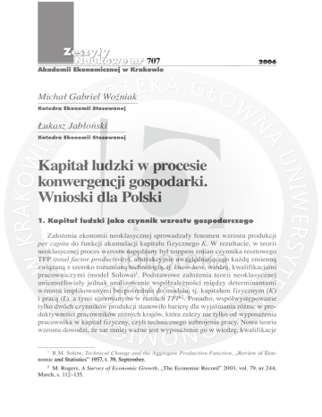 Zeszyty Naukowe nr 707 Akademii Ekonomicznej w Krakowie 2006 Michał Gabriel Woźniak Katedra Ekonomii Stosowanej Łukasz Jabłoński Katedra Ekonomii Stosowanej Kapitał ludzki w procesie konwergencji gospodarki. Wnioski dla Polski 1. Kapitał ludzki jako czynnik wzrostu gospodarczego Założenia ekonomii neoklasycznej sprowadzały fenomen wzrostu produkcji per capita do funkcji akumulacji kapitału fizycznego K. W rezultacie, w teorii neoklasycznej proces wzrostu napędzany był tempem zmian czynnika resztowego TFP (total factor productivity), abstrakcyjnie uwzględniającego każdą zmienną związaną z szeroko rozumianą technologią, tj. know-how, wiedzą, kwalifikacjami pracowniczymi (model Solowa). Podstawowe założenia teorii neoklasycznej uniemożliwiały jednak analizowanie współzależności między determinantami wzrostu implikowanymi bezpośrednio do modelu, tj. kapitałem fizycznym (K) i pracą (L), a tymi ujmowanymi w ramach TFP . Ponadto, współwystępowanie tylko dwóch czynników produkcji stanowiło barierę dla wyjaśniania różnic w produktywności pracowników różnych krajów, która zależy nie tylko od wyposażenia pracownika w kapitał fizyczny, czyli technicznego uzbrojenia pracy. Nowa teoria wzrostu dowodzi, że nie mniej ważne jest wyposażenie go w wiedzę, kwalifikacje R.M. Solow, Technical Change and the Aggregate Production Function, „Review of Eco���� nomic���������������������������������������� and Statistics” 1957, t. 39, September. M. Rogers, A Survey of Economic Growth, „The Economic Record” 2003, vol. 79, nr 244, March, s. 112–135. Michał Gabriel Woźniak, Łukasz Jabłoński 26 i umiejętności. Ten komplementarny czynnik decydujący o poziomie produktywności kapitału fizycznego był jednak pomijany w dwuczynnikowej funkcji produkcji opartej na założeniach ekonomii neoklasycznej. Dopiero uwzględnienie ograniczonej substytucji między zasobami pracy i kapitału fizycznego umożliwiło wyodrębnienie reszty Solowa, determinowanej w długim okresie zmianami technologii. Stąd wyłoniło się pytanie o zmierzenie wkładu wiedzy do stopy wzrostu gospodarczego i wyodrębnienie głównej siły napędowej technologii w modelach neoklasycznych. W poszukiwaniach odpowiedzi na te pytania szczególną wagę przykładano do kapitału ludzkiego H, wchodzącego albo bezpośrednio do funkcji produkcji, obok kapitału rzeczowego K i pracy fizycznej L, albo pozostającego w silnych zależnościach korelacyjnych z ogólnospołeczną technologią i wiedzą oraz kapitałem fizycznym. Tabela 1. Rola kapitału ludzkiego w przedsiębiorstwie i gospodarce poziom mikro Rola kapitału ludzkiego 1) Kształcenie na poziomie szkolnym determinuje poziom uzyskiwanych dochodów oraz status obywateli na rynku pracy – każdy dodatkowy rok kształcenia zwiększa poziom wynagrodzeń w krajach UE o ok. 6,5%. 2) Szkolenia zawodowe pozytywnie wpływają na poziom wynagrodzeń – każdy dodatkowy rok szkoleń zawodowych zwiększa poziom wynagrodzeń o ok. 5%. 3) Wiedza uosobiona w pracownikach zwiększa produktywność przedsiębiorstw, gdyż stanowi źródło dla innowacji oraz konkurencyjności firm w długim okresie. 4) Kwalifikacje pracownicze istotnie wpływają na poziom wynagrodzeń szczególnie w warunkach wysokiego tempa postępu technicznego. 5) Wykwalifikowany pracownik stanowi częściowy substytut dla zasobów materialnych firmy. poziom makro 1) Kapitał ludzki pozytywnie wpływa na tempo wzrostu gospodarczego. 2) Kapitał ludzki pozytywnie wpływa na wzrost produktywności – każdy dodatkowy rok kształcenia zwiększa produktywność o ok. 5%. 3) Kapitał ludzki przyspiesza tempo zmian i dyfuzji technologii. 4) Kapitał ludzki może być częściowym substytutem kapitału rzeczowego. 5) Polityka wspierająca akumulację kapitału ludzkiego sprzyja spójności społecznej. 6) Akumulacja kapitału ludzkiego ogranicza nierówności dochodowe. Źródło: opracowanie własne na podstawie: A. de la Fuente, A. Ciccione, Human Capital in a Glo bal and Knowledge-Based Economy, Final Report, Instituto de Analisis Economico (CSIC), Universitat Pompeu Fabra, May 2002, s. 4–10. Różnorodna optyka analizy sprzężeń między kapitałem ludzkim a wzrostem gospodarczym w skali makro oraz kapitałem ludzkim a wartością rynkową Kapitał ludzki w procesie konwergencji gospodarki… 27 i konkurencyjnością firm w skali mikroekonomicznej skutkuje odmiennym jego definiowaniem (tabela 1). Przegląd najbardziej reprezentatywnych definicji kapitału ludzkiego pozwala rozpatrywać go w wąskim i szerokim ujęciu. W wąskim ujęciu kapitał ludzki wiąże się z wiedzą, poziomem wykształcenia oraz indywidualnymi kompetencjami obywateli w osiąganiu założonych zadań i celów społecznych. Szerokie ujęcie kapitału ludzkiego pozwala analizować zasoby wiedzy, umiejętności, poziom zdrowia i energii witalnej zawarte w poszczególnych osobach, społeczeństwie lub narodzie jako całości. Współcześnie w ramach tej kategorii ekonomicznej uwzględnia się także sferę B+R. Definiowanie kapitału ludzkiego na potrzeby rozważań teoretycznych i empirycznych wymaga stałego rozszerzania jego znaczenia. Choć kapitał ludzki tym różni się od abstrakcyjnej wiedzy, że jest wyłączalny, tzn. istnieje możliwość niedopuszczenia innych do korzystania z niego, to jednak często odnosi się wrażenie, iż pojęcia te się pokrywają. Wynika to z faktu, że kapitał ludzki jest wieloaspektowym przejawem inwestowania w ludzi, a przez to może być rozpatrywany w ramach kilku komponentów, tj.: – umiejętności ogólnych, przejawiających się znajomością pisania i czytania, czyli odzwierciedlających zdolność przetwarzania informacji i wykorzystywania ich do rozwiązywania problemów oraz nauki, – umiejętności specjalistycznych, związanych z zastosowaniem określonych 