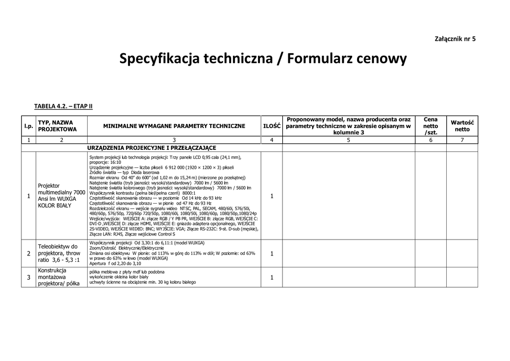 Załącznik nr 5 Specyfikacja techniczna / Formularz cenowy TABELA 4.2. – ETAP II l.p. 1 TYP, NAZWA PROJEKTOWA 2 MINIMALNE WYMAGANE PARAMETRY TECHNICZNE 3 URZĄDZENIA PROJEKCYJNE I PRZEŁĄCZAJĄCE Proponowany model, nazwa producenta oraz ILOŚĆ parametry techniczne w zakresie opisanym w kolumnie 3 4 5 1 Projektor multimedialny 7000 Ansi lm WUXGA KOLOR BIAŁY System projekcji lub technologia projekcji: Trzy panele LCD 0,95 cala (24,1 mm), proporcje: 16:10 Urządzenie projekcyjne — liczba pikseli 6 912 000 (1920 × 1200 × 3) pikseli Źródło światła — typ Dioda laserowa Rozmiar ekranu Od 40” do 600” (od 1,02 m do 15,24 m) (mierzone po przekątnej) Natężenie światła (tryb jasności: wysoki/standardowy) 7000 lm / 5600 lm Natężenie światła kolorowego (tryb jasności: wysoki/standardowy) 7000 lm / 5600 lm Współczynnik kontrastu (pełna biel/pełna czerń) 8000:1 Częstotliwość skanowania obrazu — w poziomie Od 14 kHz do 93 kHz Częstotliwość skanowania obrazu — w pionie od 47 Hz do 93 Hz Rozdzielczość ekranu — wejście sygnału wideo NTSC, PAL, SECAM, 480/60i, 576/50i, 480/60p, 576/50p, 720/60p 720/50p, 1080/60i, 1080/50i, 1080/60p, 1080/50p,1080/24p Wejście/wyjścia: WEJŚCIE A: złącze RGB / Y PB PR, WEJŚCIE B: złącze RGB, WEJŚCIE C: DVI-D ,WEJŚCIE D: złącze HDMI, WEJŚCIE E: gniazdo adaptera opcjonalnego, WEJŚCIE 2S-VIDEO, WEJŚCIE WIDEO: BNC; WYJŚCIE: VGA; Złącze RS-232C: 9-st. D-sub (męskie), Złącze LAN: RJ45, Złącze wejściowe Control S 1 2 Teleobiektyw do projektora, throw ratio 3,6 - 5,3 :1 Współczynnik projekcji Od 3,30:1 do 6,11:1 (model WUXGA) Zoom/Ostrość Elektrycznie/Elektrycznie Zmiana osi obiektywu W pionie: od 113% w górę do 113% w dół; W poziomie: od 63% w prawo do 63% w lewo (model WUXGA) Apertura f od 2,20 do 3,10 1 3 Konstrukcja montażowa projektora/ półka półka meblowa z płyty mdf lub podobna wykończenie okleina kolor biały uchwyty ścienne na obciążenie min. 30 kg koloru białego 1 Cena netto /szt. 6 Wartość netto 7 4 5 6 Ekran elektryczny szer. 450 cm rodzaj: elektryczny minimalny rozmiar: 450cm x 338cm materiał: Matt White (MWP) – tkanina pokryta dwustronnie winy lem, spodnia strona w kolorze czarnym, wierzchnia strona (projekcyjna) w kolorze białym, dedykowana do współpracy z projektorami w technologii DLP i LCD. grubość materiału: 0,7mm współczynnik odbicia światła: 1,0 kąt oglądalności: 150 stopni silnik: moc 230W, możliwość regulacji ustawień krańcowych. kaseta wykonana z profilu aluminiowego malowanego na kolor biały. Możliwość pomalowania kasety w innym kolorze z palety RAL. Wyprowadzenie przewodu zasilania z lewej strony (patrząc na ekran). wysów materiału z przodu kasety wymiar kasety: 461cm x 19,5cm x 20,2cm waga: ok. 80 kg 1 Odtwarzacz bluray Uniwersalny transport Blu-ray Disc, odtwarzający także DVD, CD, Super Audio CD i DVD-Audio Funkcje sieciowe, dostarcza bogactwo treści online: ciesz się YouTube i usługami Netflix bez pośrednictwa komputera PC / ciesz się muzyką, zdjęciami i wideo zapisanymi na podłączonym do sieci urządzeniu, takim jak PC lub NAS. Wsparcie HDMI z 3D, Deep Colour, "x.v.Color", High-Bit-Rate Audio oraz HDMI CEC Port USB z przodu Szybkie ładowanie płyty i odtwarzanie Odtwarzane formaty: BD Video- 3D-BD-Video (wersia 3D); odtwarzanie nośników standardowych DVD-Video/CD-audio, DVD - Audio, SACD Super Audio CDStereo / Wielokanałowe CD-R / RW, DVD-R / RW, DVD+R / RW, BD-R / RE (BDMV-format); Złącze USB: BD-Live, Audio, Picture, Video (MP3, WMA, AAC, WAV, JPEG, MPEG1, MPEG2, MPEG4, WMV9); Złącze sieciowe dla: DLNA, Audio, Zdjęć, Video, YouTube-Streaming (MP3, WMA, AAC, WAV, FLAC HD 192/24, JPEG, MPEG1, MPEG2, MPEG4, WMV9) DivX Video-Playback (nowy format kompresii video),- DivX (R) Certified 1 Procesor wizyjny ze skalerem i funkcją PIP, wejścia 2xRGB, 3xHDMI, AUDIO IN, VARIABLE OUT WEJŚCIA WIDEO/AUDIO: 2x RGBHV, RGBS, RGsB, RGBcvS; component video; S-video; composite video; 3 x HDMI digital video (HDCP compliant); 5 x audio stereo, balanced/unbalanced, 3 x stereo- de-embedded z HDMI (LPCM only) Poziom sygnałów analogowych Minimum/maximum: 0.0 V to 1.0 Vp-p bez offsetu Ipedancja wejść 75 ohms Częstotliwości: Horizontal 15 kHz to 100 kHz, Vertical 24 Hz to 120 Hz Zakres rozdzielczości: 640x480 to 1920x1200, NTSC, PAL, SECAM, 480i, 576i, 480p, 576p, 720p, 1080i, 1080p, 2k Procesor video: decoder 12 bit digital (3D-adaptive comb filter), próbkowanie analog. 12 bits na kolor; 13.5 MHz standard (video) 170 MHz standard (RGB); głębia danych cyfrowych 8, 10, lub 12 bits na kanał; 3 kanały dla HDMI WYJŚCIE WIDEO/AUDIO: 1 skalowane RGBHV, RGBS, RGsB, lub component video (YUVp/HDTV) oraz 1 HDMI digital video (HDCP compliant); 1 x analog audio, 1 S/PDIF cyfrowe audio (LPCM-2Ch, Dolby Digital, lub DTS), 1 x HDMI embedded, regulowane audio Rozdzielczość skalowania od 640x480 do 1920x1200, HDTV 480p do 2048x1080 STEROWANIE: 1 x port dwukierunkowy RS-232, 1 x mini USB B na przednim panelu ver.2.0, 1 x RJ-45 dla Ethernet 10/100Base-T, half/full duplex z autodetekcją 1 1 7 8 9 10 Matryca HDMI 4x8 Przełącznik matrycowy 4 wejść na 8 wyjść typu HDMI Typ sygnału TMDS cyfrowy RGB HDMI and single-link DVI digital video: do 6.75 Gbps, głębia kolorów 12-bit, 3D, HD lossless audio RGB cyfrowy sygnał wideo: (DVI and HDMI standards) lub Y, Cr, Cb cyfrowy component video (HDMI), od 640x480 @ 60 Hz do 1600x1200 @ 60 Hz computer video and HDTV 480p, 720p, 1080i, 1080p Wsparcie EDID i DDC dla DVI i HDMI standardów, HDCP, HPD Maximum data rate 6.75 Gbps (2.25 Gbps per color), Maximum pixel clock 225 MHz Prędkość przełączania 200 ns, max. Port komunikacji 2 x RS-232: 9-pin F DSUB oraz z przodu 2.5 mm mini stereo jack, 1 x RJ-45 złącze dla Ethernet (10/100Base-T, half/full duplex z autodetekcją) 1 Transmiter HDMI + AUDIO -> DTP Wejście –gniazdo HDMI żeńskie Maksymalny współczynnik danych 10.2 GHz (3,4 GHz na ko