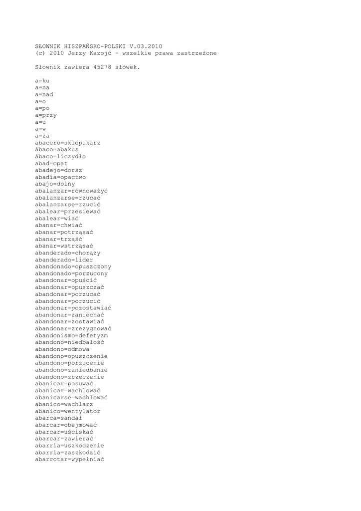 SŁOWNIK HISZPAŃSKO-POLSKI V.03.2010 (c) 2010 Jerzy Kazojć - wszelkie prawa zastrzeżone Słownik zawiera 45278 słówek. a=ku a=na a=nad a=o a=po a=przy a=u a=w a=za abacero=sklepikarz ábaco=abakus ábaco=liczydło abad=opat abadejo=dorsz abadía=opactwo abajo=dolny abalanzar=równoważyć abalanzarse=rzucać abalanzarse=rzucić abalear=przesiewać abalear=wiać abanar=chwiać abanar=potrząsać abanar=trząść abanar=wstrząsać abanderado=chorąży abanderado=lider abandonado=opuszczony abandonado=porzucony abandonar=opuścić abandonar=opuszczać abandonar=porzucać abandonar=porzucić abandonar=pozostawiać abandonar=zaniechać abandonar=zostawiać abandonar=zrezygnować abandonismo=defetyzm abandono=niedbałość abandono=odmowa abandono=opuszczenie abandono=porzucenie abandono=zaniedbanie abandono=zrzeczenie abanicar=posuwać abanicar=wachlować abanicarse=wachlować abanico=wachlarz abanico=wentylator abarca=sandał abarcar=obejmować abarcar=uściskać abarcar=zawierać abarría=uszkodzenie abarría=zaszkodzić abarrotar=wypełniać abastado=oddalony abastar=odpierać abastar=usunąć abastar=usunięcie abastar=usuwać abastecedor=dostawca abastecer=zaopatrywać abastecimiento=zaopatrywanie abastecimiento=zaopatrzenie abasto=zaopatrzenie abatimiento=przygnębienie abatimiento=zniechęcenie abatir=poniżać abatir=poniżyć abdicación=abdykacja abdicación=zrzeczenie abdicar=abdykować abdomen=brzuch abdomen=podbrzusze abdominal=brzuszny abducción=porwanie abducción=uprowadzenie abecé=abecadło abecé=alfabet abecedario=abecadło abecedario=alfabet abedul=brzoza abeja=macica abeja=pszczoła abejar=pasieka abejarrón=trzmiel abejón=truteń abejorro=trzmiel ABERRAÇÃO=aberracja ABERRAÇÃO=zboczenie aberración=aberracja aberración=spaczenie aberración=zboczenie aberración=zniekształcenie abertura=apertura abertura=dziura abertura=dziurka abertura=jama abertura=otwarcie abertura=otwór abertura=szczelina abertura=wyłom abeto=choinka abeto=jodła abeto=świerk abiertamente=otwarcie abierto=szczery abigarrado=pstry abigarrado=różnobarwny abigarramiento=pstrokacizna abigarrar=upstrzyć abisal=głębinowy abismarse=upaść abismo=czeluść abismo=głębia abismo=otchłań abismo=przepaść abismo=wir abjuración=odwołanie abjurar=wyrzekać abjurar=zaprzeć ablandar=łagodzić ablandar=miękczyć ablandar=mięknąć ablandar=zmiękczać ablandar=zmiękczyć ablativo=narzędnik ablución=ablucja ablución=obmycie abnegación=abnegacja abnegación=wyrzeczenie abnegado=ofiarny abocado=delikatny abocado=przyjemny abocar=podstawić abocar=przystawić abochornar=zawstydzać abogacía=adwokatura abogado=adwokat abogado=obrońca abogado=pełnomocnik abogado=prawnik abogado=prokurator abogar=bronić abolengo=pochodzenie abolengo=ród abolengo=rodowód abolición=skasowanie abolición=uchylenie abolición=zniesienie abolicionismo=abolicjonizm abolicionista=abolicjonista abolir=anulować abolir=kasować abolir=obalić abolir=skasować abolir=uchylać abolir=usunąć abolir=usuwać abolir=znieść abolir=znosić abolladura=wgniecenie abollar=wgniatać abollonar=uwypuklać abollonar=wytłaczać abombado=mówca abombado=wypukły abombar=wystawić abominable=obrzydliwy abominable=ohydny abominable=okropny abominable=szkaradny abominable=wstrętny abominación=awersja abominación=obrzydzenie abominación=odraza abominación=okropność abominación=przerażenie abominación=wstręt abominación=zgroza abominar=brzydzić abominar=nienawidzić abominar=przeklinać abominar=wyklinać abonado=abonent abonado=dostojny abonado=godny abonado=pewny abonado=prenumerator abonador=gwarant abonador=poręczyciel abonar=nawozić abonarse=prenumerować abonarse=zaabonować abonarse=zaprenumerować abono=abonament abono=nawóz abono=poręka abono=prenumerata abono=zapis abordable=dostępny abordable=przystępny abordable=towarzyski abordar=atakować abordar=nacierać abordar=napadać aborigen=lokalny aborigen=miejscowy aborigen=pierwotny aborigen=tubylczy aborigen=tubylec aborrecer=brzydzić aborrecer=dokuczać aborrecer=nienawidzić aborrecer=nudzić aborrecer=zanudzać aborrecido=dokuczliwy aborrecido=nudny aborrecido=nużący aborrecimiento=obrzydzenie aborrecimiento=wstręt abortar=poronić aborto=aborcja aborto=owoc aborto=płód aborto=poronienie aborto=skrobanka abotonar=zapinać abra=zatoczka abracadabra=zaklęcie abracadabra=zaklinanie abracar=obejmować abracar=objąć abracar=ogarniać abracar=ściskać abracar=uściskać abracar=zawierać abrasar=palić abrasar=parzyć abrasar=piec abrasar=prażyć abrasar=rozpalać abrasar=spalać abrasar=zapalać abrasarse=palić abrasarse=parzyć abrasarse=płonąć abrasarse=przypalić abrasarse=spalać abrasarse=sparzyć abrasivo=ścierny abrasivo=szorstki abrazadera=obręcz abrazar=obejmować abrazar=objąć abrazar=ogarniać abrazar=ściskać abrazar=tulić abrazar=uściskać abrazar=zawierać abrazarse=obejmować abrazarse=uściskać abrazo=uścisk abrelatas=otwieracz abrevadero=wodopój abrevar=poić abrevar=polewać abreviación=skrócenie abreviación=skrót abreviado=krótki abreviado=zwięzły abreviar=ograniczać abreviar=skracać abreviar=skrócić abreviar=streszczać abreviatura=skrócenie abreviatura=skrót abrigar=chronić abrigar=ochraniać abrigar=osłaniać abrigar=zmuszać abrigo=azyl abrigo=budka abrigo=marynarka abrigo=palto abrigo=płaszcz abrigo=portowy abrigo=powłoka abrigo=przystań abrigo=schron abrigo=schronienie abril=poeta abril=wiosna abrillantar=szlifować abrillantar=wypolerować abrir=odemknąć abrir=otwierać abrir=otworzyć abrochar=spinać abrochar=zapiąć abrochar=zapinać abrogación=zniesienie abrogar=odwołać abrogar=odwoływać abrogar=znieść abrogar=znosić abrojo=oset abrumar=przygniatać abrupto=nagły abrupto=niespodziewany abrupto=raptowny abrupto=stromy abrupto=szorstki abrupto=urwisty abrutado=brutalny absceso=ropień absceso=wrzód abscisa=odcięta absentismo=absencja absento=absynt ábside=apsyd