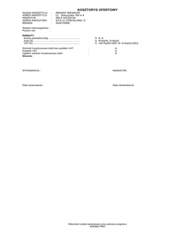 KOSZTORYS OFERTOWY NAZWA INWESTYCJI ADRES INWESTYCJI INWESTOR ADRES INWESTORA BRANśA : : : : : REMONT MIESZKAŃ UL . Stołczyńska 169 m 9 ZBiLK SZCZECIN SZ-N UL KOŚCIELNNA 12 SANITARNE Stawka roboczogodziny : Poziom cen : NARZUTY Koszty pośrednie [Kp] ............................................ Zysk [Z] .................................................................. VAT [V] .................................................................. Wartość kosztorysowa robót bez podatku VAT Podatek VAT Ogółem wartość kosztorysowa robót Słownie: % R, S % R+Kp(R), S+Kp(S) % Σ(R+Kp(R)+Z(R), M, S+Kp(S)+Z(S)) : : : zł zł zł WYKONAWCA : INWESTOR : Data opracowania Data zatwierdzenia Dokument został opracowany przy pomocy programu NORMA PRO Kosztorys sanit stołczyńska 169 9 Lp. Podstawa Opis jm Norma Nakłady Cena R M S remont mieszkań ul.Stołczyńska 169 9 1 KNR-W 4- Wymiana zlewozmywaka Ŝeliwnego ze ścianką i wspornikami 02 0219-03 obmiar = 1szt. R:robocizna r-g 3.550000 3.5500 M:Zlewozmyw.1-kom.blasz szt 1.000000 1.0000 M:konstrukcja wsporcza szt 1.000000 1.0000 M:materiały pomocnicze % 1.000000 Razem koszty bezpośrednie: Jednostkowe koszty bezpośrednie: 2 KNR 4-02 Wymiana syfonu o śr. 50 mm - analogia syfon PVC 0213-01 obmiar = 1szt. R:robocizna r-g 0.590000 0.5900 M:syfony PVC zlewowe szt. 1.000000 1.0000 M:materiały pomocnicze % 4.000000 Razem koszty bezpośrednie: Jednostkowe koszty bezpośrednie: 3 KNR-W 4- DemontaŜ podejścia odpływowego z rur stalowych o śr. 50 mm 02 0232-02 obmiar = 1szt. R:robocizna r-g 0.320000 0.3200 Razem koszty bezpośrednie: Jednostkowe koszty bezpośrednie: 4 KNR 2-15 Dodatek za wykonanie podejść odpływowych z rur i kształtek z nieplastyfikowanego PCW o śr. 50 mm 0208-03 obmiar = 1szt. R:robocizna r-g 0.611200 0.6112 M:kształtki kanalizacyjne z PCW 50 mm szt. 3.000000 3.0000 M:uchwyty do rur PCW wykonane z blachy stalowej o śr. 50 szt. 1.000000 1.0000 mm M:uszczelki gumowe pierścieniowe do rur PCW 50 mm szt. 4.000000 4.0000 M:materiały pomocnicze % 0.200000 S:samochód dostawczy 0.9 t m-g 0.010000 0.0100 Razem koszty bezpośrednie: Jednostkowe koszty bezpośrednie: 5 KNR-W 4- Wymiana podejścia dopływowego do zaworu czerpalnego, hydrantu lub baterii - połączenie sztywne o śr. 15 mm 02 0111-01 obmiar = 1szt. R:robocizna r-g 0.530000 0.5300 M:łączniki z Ŝeliwa ciągliwego ocynkowane szt. 4.000000 4.0000 M:materiały pomocnicze % 1.500000 Razem koszty bezpośrednie: Jednostkowe koszty bezpośrednie: 6 KNR-W 4- Wymiana baterii umywalkowej lub zmywakowej - bateria zlewozmywakowa stojąca, bateria wannowa 02 0132-01 obmiar = 1szt. R:robocizna r-g 1.080000 1.0800 M:bateria zlewozmywakowa szt 1.000000 1.0000 M:węzyki w oplocie stalowym 90, 2.000000 2.0000 00 M:materiały pomocnicze % 1.500000 Razem koszty bezpośrednie: Jednostkowe koszty bezpośrednie: 7 KNR 2-15 Dodatkowe nakłady na wykonanie obustronnych podejść o śr. 15 mm do wodomierzy skrzydelkowych 0108-01 obmiar = 1kpl. R:robocizna r-g 1.394300 1.3943 M:wsporniki z blachy i stali kształtowej do rur o śr. 15 mm szt. 2.000000 2.0000 M:rury stalowe instalacyjne z/s typ S średnie S czarne z koń- m 0.420000 0.4200 cami gwint. 15 mm M:łącznik z Ŝeliwa ciągliwego ocynkowany 15 mm szt. 4.120000 4.1200 M:materiały pomocnicze % 1.400000 S:samochód dostawczy 0.9 t m-g 0.010000 0.0100 Razem koszty bezpośrednie: Jednostkowe koszty bezpośrednie: 8 KNR-W 2- Wodomierze skrzydełkowe domowe o śr. nominalnej 15 mm WRAZ Z PLOMBOWANIEM 15 0140-01 obmiar = 1kpl. R:robocizna r-g 0.840000 0.8400 M:wodomierze skrzydełkowe o śr. nominalnej 15 mm szt. 1.000000 1.0000 M:zawory kulowe o śr. nominalnej 15 mm' szt. 2.000000 2.0000 M:łączniki redukcyjne o śr. nominalnej 15 mm szt. 2.000000 2.0000 M:PLOMBY NA PÓŁŚRUBUNKI kpl 1.000000 1.0000 M:materiały pomocnicze % 1.500000 S:samochód dostawczy 0.9 t m-g 0.010000 0.0100 Razem koszty bezpośrednie: Jednostkowe koszty bezpośrednie: 9 KNR INS- Filtr osadnikowy siatkowy o śr.nom 15 mm TAL 0111- obmiar = 1szt. 01 R:robocizna r-g 0.940000 0.9400 M:filtry osadnikowe siatkowe skośne mosięŜne o śr.nom 15 szt. 1.000000 1.0000 mm M:dwuzłączki przejściowe mosięŜne szt. 2.000000 2.0000 -2- Norma PRO Wersja 4.18a Licencja: 13843 dla Rejon2 Kosztorys sanit stołczyńska 169 9 Lp. Podstawa Opis jm Norma Nakłady Cena R M S M:uchwyty stalowe z wkładką elastyczną do rur miedzianych szt. 1.000000 1.0000 M:materiały pomocnicze % 3.000000 S:samochód dostawczy 0.9 t m-g 0.010000 0.0100 Razem koszty bezpośrednie: Jednostkowe koszty bezpośrednie: 10 KNR 4-02 DemontaŜ rurociągu stalowego ocynkowanego o śr. 15-20 mm - zlewozmywak , pomieszczenie W C 0114-01 obmiar = 1m R:robocizna r-g 0.160000 0.1600 M:materiały pomocnicze % 10.000000 Razem koszty bezpośrednie: Jednostkowe koszty bezpośrednie: 11 KNR-W 2- Rurociągi stalowe ocynkowane o śr. nominalnej 15 mm o połączeniach gwintowanych, na ścianach w budynkach 15 0106-01 niemieszkalnych obmiar = 1.5m R:robocizna r-g 0.307000 0.4605 M:rury stalowe ze szwem przewodowe gwintowane ocynkom 1.030000 1.5450 wane o śr. nominalnej 15 mm M:łączniki z Ŝeliwa ciągliwego ocynkowane o śr. nominalnej szt. 0.540000 0.8100 15 mm M:uchwyty do rur o śr. nominalnej 15 mm szt. 0.700000 1.0500 M:materiały pomocnicze % 1.500000 S:samochód dostawczy 0.9 t m-g 0.006600 0.0099 Razem koszty bezpośrednie: Jednostkowe koszty bezpośrednie: 12 KNR 0-34 Izolacja rurociągów śr.12-22 mm otulinami Thermaflex FRZ - jednowarstwowymi gr.9 mm (E) 0101-03 obmiar = 1m R:robocizna r-g 0.155300 0.1553 M:otuliny Thermaflex FRZ gr. 9 mm m 1.100000 1.1000 M:klej Thermaflex 474 dm 0.008200 0.0082 3 M:taśma Thermatape FR 3x50 mm m 0.060000 0.0600 M:klipsy montaŜowe Thermaclips szt. 6.000000 6.0000 M:materiały pomocnicze % 3.000000 S:samochód dostawczy 0.9 t m-g 0.000900 0.0009 Razem koszty bezpośrednie: Jednostkowe koszty bezpośrednie: 13 KNR 4-01 Wykucie bruzd pochyłych 1x1/2 ceg. w ścianach z