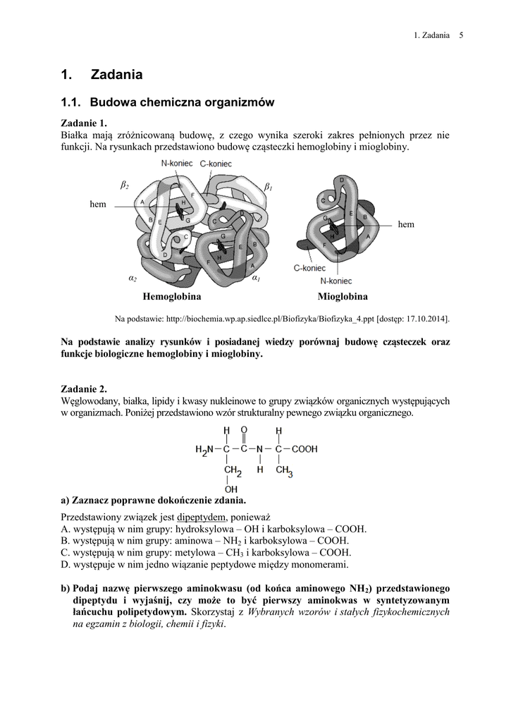 1. Zadania 1. Zadania 1.1. Budowa chemiczna organizmów Zadanie 1. Białka mają zróżnicowaną budowę, z czego wynika szeroki zakres pełnionych przez nie funkcji. Na rysunkach przedstawiono budowę cząsteczki hemoglobiny i mioglobiny. β2 β1 hem hem α1 α2 Hemoglobina Mioglobina Na podstawie: http://biochemia.wp.ap.siedlce.pl/Biofizyka/Biofizyka_4.ppt [dostęp: 17.10.2014]. Na podstawie analizy rysunków i posiadanej wiedzy porównaj budowę cząsteczek oraz funkcje biologiczne hemoglobiny i mioglobiny. Zadanie 2. Węglowodany, białka, lipidy i kwasy nukleinowe to grupy związków organicznych występujących w organizmach. Poniżej przedstawiono wzór strukturalny pewnego związku organicznego. a) Zaznacz poprawne dokończenie zdania. Przedstawiony związek jest dipeptydem, ponieważ A. występują w nim grupy: hydroksylowa – OH i karboksylowa – COOH. B. występują w nim grupy: aminowa – NH2 i karboksylowa – COOH. C. występują w nim grupy: metylowa – CH3 i karboksylowa – COOH. D. występuje w nim jedno wiązanie peptydowe między monomerami. b) Podaj nazwę pierwszego aminokwasu (od końca aminowego NH2) przedstawionego dipeptydu i wyjaśnij, czy może to być pierwszy aminokwas w syntetyzowanym łańcuchu polipetydowym. Skorzystaj z Wybranych wzorów i stałych fizykochemicznych na egzamin z biologii, chemii i fizyki. 5 6 Egzamin maturalny. Biologia. Poziom rozszerzony. Zbiór zadań c) Zakładając, że przedstawiony dipeptyd jest końcowym fragmentem powstającego podczas translacji łańcucha polipeptydowego, podaj do którego końca przedstawionego dipeptydu zostanie przyłączony kolejny aminokwas, np. lizyna. Odpowiedź uzasadnij. d) Korzystając z Wybranych wzorów i stałych fizykochemicznych na egzamin z biologii, chemii i fizyki, podaj, jaki antykodon może mieć tRNA transportujący do rybosomu lizynę. Zadanie 3. Aminokwasy, podobnie jak większość związków organicznych, można łatwo rozpoznać po charakterystycznych grupach funkcyjnych. Z aminokwasów zbudowane są białka – związki o skomplikowanej strukturze przestrzennej. Na schematach przedstawiono budowę dwóch aminokwasów. glicyna cysteina Źródło: Wybrane wzory i stałe fizykochemiczne na egzamin maturalny z biologii, chemii i fizyki. a) Na wzorze strukturalnym cysteiny otocz kółkiem dwie grupy funkcyjne, charakterystyczne dla wszystkich aminokwasów. Oznacz je cyframi 1 i 2 oraz podaj ich nazwy. b) Zapisz wzór strukturalny dipeptydu powstałego z połączenia glicyny i cysteiny (Gly-Cys) oraz otocz linią lub zaznacz strzałką wiązanie peptydowe. c) Wyjaśnij, jakie znaczenie w tworzeniu struktury III-rzędowej białka ma cysteina. Zadanie 4. Na schemacie przedstawiono klasyfikację związków organicznych budujących organizmy. 1. Zadania Poniżej przedstawiono listę nazw wybranych związków i grup związków organicznych (1–8) budujących organizm człowieka: 5 metaloproteiny 1 albuminy 6 sacharoza 2 fruktoza 7 skrobia 3 glikogen 8 steroidy 4 glukoza a) Uzupełnij schemat – wpisz w puste ramki po jednym właściwym oznaczeniu cyfrowym związku lub grup związków wchodzących w skład organizmu człowieka. b) Z listy związków organicznych oraz ze schematu wybierz i zapisz nazwy dwóch związków, które gromadzone są w tkankach człowieka jako rezerwa energetyczna. Obok każdego związku podaj po jednym miejscu jego magazynowania w organizmie. Zadanie 5. Na rysunkach A–D w przypadkowej kolejności zobrazowano I-, II-, III- i IV-rzędową strukturę białek. Na podstawie: Biologia, red. A. Czubaj, Warszawa 1999, s. 349. a) Podaj oznaczenia literowe rysunków w takim porządku, żeby odzwierciedlały kolejno I-, II-, III- i IV-rzędową strukturę białek. b) Określ funkcję, jaką w kształtowaniu struktury białek pełnią wymienione w legendzie (do rysunków) rodzaje wiązań chemicznych. Zadanie 6. Na rysunkach przedstawiono fragment cząsteczki kolagenu. Na podstawie: http://biochemia.wp.ap.siedlce.pl/Biofizyka/Biofizyka_4.ppt [dostęp: 17.10.2014]. 7 8 Egzamin maturalny. Biologia. Poziom rozszerzony. Zbiór zadań Korzystając z rysunku, wykaż związek między strukturą kolagenu a jego funkcją biologiczną w organizmie człowieka. Zadanie 7. Woda jest aktywnym związkiem nieorganicznym, którego polarne cząsteczki łączą się ze sobą za pomocą wiązań wodorowych. Cząsteczki wody mają zdolność do adhezji, czyli przylegania do innych substancji, oraz wzajemnego przyciągania się, czyli tzw. kohezji (spójności). Wiązania wodorowe ulegają zerwaniu pod wpływem energii cieplnej cząsteczek. Na schemacie przedstawiono wiązania wodorowe powstałe między cząsteczkami wody. H O wiązanie wodorowe H H O H Na podstawie: Biologia. Jedność i różnorodność, praca zbiorowa, Warszawa 2008, s. 28. a) Określ, w którym zdaniu – A czy B – prawidłowo opisano rolę sił kohezji w transporcie wody w roślinie. Odpowiedź uzasadnij. A. Zapobiegają przerwaniu się słupa wody w naczyniach i cewkach ksylemu między korzeniem a liściem. B. Zapobiegają odrywaniu się nitek wody przewodzonej w ksylemie od ścian komórkowych naczyń. b) Wyjaśnij związek budowy cząsteczki wody z jej wysokim ciepłem parowania. Zadanie 8. Wśród węglowodanów, w zależności od ich budowy, wyróżnia się monosacharydy – pojedyncze monomery, które mogą tworzyć większe cząsteczki: oligosacharydy (2–10 monomerów), oraz polisacharydy, zbudowane z więcej niż 10 monomerów. Na schemacie I przedstawiono reakcję kondensacji dwóch cząsteczek glukozy (monomeru), w wyniku której powstaje disacharyd, a na schemacie II – dwa disacharydy, z których każdy zbudowany z dwóch różnych monomerów. 1. Zadania I II Na podstawie: B.D. Hames, N.M. Hooper, Biochemia. Krótkie wykłady, Warszawa 2002, s. 310. a) Podpisz powyższe wzory disacharydów w miejscach oznaczonych literami A–C. Ich nazwy wybierz spośród wymienionych. Nazwy disacharydów: sacharoza, celob