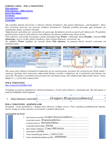 FORMULARZE – POLA TEKSTOWE Pole tekstowe Pole tekstowe – kilka wierszy Karta Developer Formanty Formant i pole tekstowe Ćwiczenia Jak wypełnić danymi utworzony w edytorze tekstów formularz? Jak wpisać informacje „nad kropkami”, które ktoś wcześniej utworzył, nie niszcząc struktury formularza? Podobny problem powstaje, gdy formularz do wypełnienia mamy w postaci obrazka. Najprostszym sposobem jest wstawienie do gotowego formularza przeźroczystych pól tekstowych. W podobny sposób można wstawić pola tekstowe nad wklejony do edytora zeskanowany obraz strony. Pole tekstowe wstawiamy korzystają z paska narzędziowego Wstaw, wybierając ikonę Kształty i znaczek Pola tekstowego. Jest to zwykły obiekt rysunkowy, który można skalować, przesuwać, itp. Na zakładce Wstaw znajduje się również ikona Pole tekstowe, za pomocą której również wstawimy na formularz pole. Aby nasze pole tekstowe formularza nadawało się do zastosowania, powinno być przeźroczyste (brak ramki i wnętrza), powinno mieć ustawiony odpowiedni format czcionki i znajdować się w położeniu nad tekstem (na wierzchu. Wysokość i szerokość pola powinna być tak dopasowana, aby obejmowała odpowiedni obszar i litery długie (l, j, y, f) nie były zamazywane. POLE TEKSTOWE http://youtu.be/LYkO0py7a8A Przygotuj za pomocą tabulatorów element formularza. Utwórz pole tekstowe i sformatuj tak, aby dół napisu w polu był dokładnie nad kropkami. POLA TEKSTOWE - KOPIOWANIE Przygotuj resztę formularza i skopiuj pola tekstowe według wzorca. Pola wypełnij przykładowymi danymi. Zwróć uwagę na różne sposoby wyrównania w polach tekstowych. wyrównanie do lewej wyrównanie do prawej wyrównanie do środka POLA TEKSTOWE – WIELOWIERSZOWE Jak sformatować pole tekstowe, aby obejmowało kilka wierszy i można było pisać jednym ciągiem? Pole powinno obejmować wszystkie wiersze. Pierwszy wiersz ustawiamy za pomocą wcięcia akapitu. Odstępy pomiędzy wierszami ustawiamy za pomocą interlinii. FORMANTY Nowe wersje edytora tekstów oferują nowe możliwości tworzenia formularzy. Pola tekstowe (i nie tylko) tworzymy za pomocą formantów. Prócz zwykłych pól tekstowych można wstawiać do formularzy: pola wyboru, selektory daty, listy rozwijane, pola obrazów i inne. Formanty dostępne są w Office 2007 na dodatkowej karcie Developer, która standardowo nie jest widoczna. KARTA DEVELOPER Przycisk pakietu Office Opcje programu Word zakładka Popularne zaznaczamy pole Pokaż kartę Developer na Wstążce Zakładka Developer zawiera Formanty, które posłużą do zbudowania formularza. FORMANTY http://youtu.be/xssi090ELvQ Formanty można formatować, jak każdy obiekt tekstowy. W szczególności można je kopiować, wyrównywać, i ustawiać za pomocą tabulatorów. Nie można ich jednak przesuwać, jak obiektów rysunkowych. Jeśli chcemy, aby wskazówka formantu była napisana jedną czcionką, a treść wpisywana do formantu inną, należy zwracać uwagę na kolejność formatowania. formant pole tekstowe wstaw format Tekst wybierz Tryb projektowania do formantu wpisz tekst: „wpisz nazwisko i imię” zaznacz formant ustaw parametry tekstu: 18, pogrubiony wyłącz Tryb projektowania ustaw kursor na za formantem i wciśnij ENTER wpisz nazwisko i imię formant pole tekstowe wstaw format Tekst wybierz Tryb projektowania do formantu wpisz tekst: „wpisz kod, miejscowość, ulicę, numer domu” zaznacz formant ustaw parametry tekstu: 10, pochylony wyłącz Tryb projektowania nowy wiersz wpisz kod, miejscowość, ulica, numer domu formant - kopiowanie zaznacz poprzedni formant skopiuj go i wklej w następnym wierszu zaznacz formant wybierz Tryb projektowania do formantu wpisz tekst: „wpisz telefon, e-mail, strona www” wyłącz Tryb projektowania nowy wiersz wpisz telefon, e-mail, strona www formant pole kombi wstaw format Pole kombi wybierz Tryb projektowania do formantu wpisz tekst Wybierz płeć wyłącz Tryb projektowania wybierz Właściwości w polu Właściwości listy rozwijanej zmień napis Wybierz element na Wybierz płeć (przycisk Modyfikuj) Przyciskiem Dodaj wstaw dwa dodatkowe elementy listy: Kobieta i Mężczyzna nowy wiersz wybierz płeć formant obraz wstaw format Pole kombi i wybierz Tryb projektowania zaznacz obszar obrazu i ustaw wymiary: 4cm x 3cm wyłącz Tryb projektowania teraz możesz kliknąć w każdy formant i wpisać informacje FORMANTY – POLA TEKSTOWE http://youtu.be/CnMCxBwu_rw Co zrobić, gdy chcemy używać jednocześnie formantów i gotowego wzorca formularza? Aby przenieść formant w dowolne miejsce można użyć pola tekstowego z wklejonym do środka formantem. Dodatkowo pole z formantem zostaną przygotowane tak, aby wskazówka dla wypełniającego była pokazywana w inny sposób niż wpisywane do pola dane. pole tekstowe przygotuj przeźroczyste Pole tekstowe sformatuj tekst pola tekstowego: 18, pogrubiony, wyśrodkowany wstaw do środka formant Pole tekstowe wybierz Tryb projektowania zmień czcionkę: 9, pochylona wpisz tekst: Kliknij i wpisz miejsce urodzenia zakończ Tryb projektowania zaznacz Pole tekstowe i ustaw w odpowiednim miejscu pole daty skopiuj Pole tekstowe z poprzedniego wiersza usuń formant wstaw do środka formant Wybór daty wybierz Tryb projektowania zmień czcionkę: 9, pochylona wpisz tekst: Kliknij i wybierz datę urodzenia zakończ Tryb projektowania zaznacz Pole tekstowe i ustaw w odpowiednim miejscu PRZYKŁADOWY FORMULARZ Wacław Libront