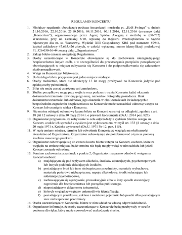 REGULAMIN KONCERTU 1. Niniejszy regulamin obowiązuje podczas inscenizacji musicalu pt. „Król Swingu” w dniach 21.10.2016, 22.10.2016, 23.10.2016, 04.11.2016, 06.11.2016, 12.11.2016 (zwanego dalej „Koncertem”), organizowanego przez Agorę Spółkę Akcyjną z siedzibą w (00-732) Warszawie, przy ul. Czerskiej 8/10, wpisaną do Rejestru Przedsiębiorców w Sądzie rejonowym dla m. st. Warszawy, Wydział XIII Gospodarczy KRS pod numerem 59944, kapitał zakładowy 47.665.426 złotych, w całości wpłacony, numer identyfikacji podatkowej PL 526-030-56-44 zwaną dalej „Organizatorem”. 2. Zakup biletu oznacza akceptację Regulaminu. 3. Osoby uczestniczące w Koncercie obowiązane są do zachowania niezagrażającego bezpieczeństwu innych osób, a w szczególności do przestrzegania przepisów porządkowych obowiązujących w miejscu odbywania się Koncertu i do podporządkowania się zaleceniom służb porządkowych. 4. Wstęp na Koncert jest biletowany. 5. Do każdego biletu przypisane jest jedno miejsce siedzące. 6. Osoby małoletnie, które nie ukończyły 13 lat mogą przebywać na Koncercie jedynie pod opieką osoby pełnoletniej. 7. Bilet nie może zostać zwrócony ani zamieniony. 8. Służby porządkowe mogą przy wejściu oraz podczas trwania Koncertu żądać okazania dokumentu tożsamości zawierającego imię, nazwisko i fotografię posiadacza. Brak dokumentu tożsamości lub odmowa jego okazania w okolicznościach świadczących o bezpośrednim zagrożeniu bezpieczeństwa na Koncercie może uzasadniać odmowę wstępu na Koncert lub usunięcie widza z Koncertu. 9. Nie można odstąpić od umowy kupna biletu na Koncert zawartej na odległość, zgodnie z art. 38 pkt 12 ustawy z dnia 30 mają 2014 r. o prawach konsumenta (Dz.U. 2014 poz. 827). 10. Organizator przypomina, że nabywanie w celu odprzedaży z zyskiem biletów wstępu na Koncert, a także ich sprzedaż z zyskiem jest wykroczeniem, w myśl art. 133 §1 ustawy z dnia 20 maja 1971 r. Kodeks wykroczeń (Dz.U. 1971 Nr 12, poz. 115). 11. W razie zmiany miejsca, terminu lub odwołania Koncertu ze względu na okoliczności niezależne od Organizatora, Organizator zobowiązuje się poinformować o tym za pomocą środków masowego przekazu. 12. Organizator zobowiązuje się do zwrotu kosztu biletu wstępu na Koncert, osobom, które ze względu na zmianę miejsca, bądź terminu nie będą mogły wziąć w nim udziału lub jeżeli Koncert zostanie odwołany. 13. Pomimo zachowania przesłanek z punktu 2, Organizator ma prawo odmówić wstępu na Koncert osobom: a) znajdującym się pod wpływem alkoholu, środków odurzających, psychotropowych lub innych podobnie działających środków, b) posiadającym broń lub inne niebezpieczne przedmioty, materiały wybuchowe, materiały pożarowo niebezpieczne, napoje alkoholowe, środki odurzające lub substancje psychotropowe, c) zachowującym się agresywnie, prowokacyjnie albo w inny sposób stwarzający zagrożenie dla bezpieczeństwa lub porządku publicznego, d) nieposiadającym dokumentu tożsamości, e) których wygląd zewnętrzny uniemożliwia identyfikację, f) posiadającym plastikowe, szklane i metalowe pojemniki lub puszki albo posiadającym inne niebezpieczne przedmioty. 14. Osoba uczestnicząca w Koncercie, bierze w nim udział na własną odpowiedzialność. 15. Organizator informuje, że osoby uczestniczące w Koncercie będą przebywały w strefie poziomu dźwięku, który może spowodować uszkodzenie słuchu. 16. Organizator nie ponosi odpowiedzialności za rzeczy zgubione, zniszczone lub skradzione w miejscu odbywania się Koncertu. 17. Organizator zastrzega sobie prawo do utrwalania przebiegu Koncertu. 18. Osoba uczestnicząca poprzez udział w Koncercie wyraża zgodę na nieodpłatne fotografowanie i filmowanie oraz na transmitowanie, rozpowszechnianie lub pokazywanie jej głosu lub wizerunku w ramach relacji z Koncertu. 19. Osobom uczestniczącym w Koncercie zabrania się: a) wnoszenia na miejsce odbywania się Koncertu i korzystania podczas Koncertu z aparatów fotograficznych, kamer, a także innych sprzętów służących do rejestrowania zapisu audio-wizualnego; b) wprowadzania na miejsce odbywania się Koncertu zwierząt; c) prowadzenia bez zgody Organizatora działalności handlowej, zarobkowej lub reklamowej, czy promocyjnej w miejscu odbywania się Koncertu; d) prowadzenia z Koncertu relacji na żywo za pośrednictwem wszelkich urządzeń elektronicznych służących komunikacji na odległość. 20. Osoby uczestniczące w Koncercie, których zachowanie jest sprzeczne z niniejszym Regulaminem mogą wyproszone z Koncertu lub przekazane Policji.