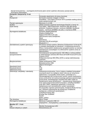 Sprzęt komputerowy – wymagania techniczne jakie winien spełniać oferowany sprzęt (zał.do formularza ofertowego) Komputer stacjonarny- 8 szt. Typ Komputer stacjonarny do pracy biurowej Wydajność Komputer powinien osiągać w teście PassMark - CPU Mark minimum 5414 punktów według strony: www.cpubenchmark.net Pamięć operacyjna Minimum 2 x 8 GB Grafika Układ powinien wspierać technologię DirectX w wersji 10 Dysk twardy Typ dysku : SSD Pojemność: minimum 256 GB wersja premium. Szybkość odczytu: minimum 560MB/s Szybkość zapisu : minimum 500MB/s dla pliku o rozmiarze 8MB Wymagania dodatkowe Gniazdo Gigabit Ethernet Wyjście DisplayPort Napęd DVD-RW 5,25 cala Wbudowana karta dzwiękowa Mysz Klawiatura Standard WLAN ac/a/b/g/n Bluetooth 4.1 Zainstalowany system operacyjny 64-bitowa wersja systemu Windows Professional 10 64-bit PL z prawami downgrade do Windows 7 Professional 64-bit PL. Wraz z komputerem dostarczone oprogramowanie na nośniku zewnętrznym pozwalające na odtworzenie systemu wraz ze sterownikami. Dodatkowe Zainstalowane oprogramowanie: MS Office w wersji polskiej oprogramowanie w skład którego wchodzi MS Word 2016,MS Excel 2016 oraz Outlook 2016 . Dołączona licencja MS Office 2016 w wersji nielimitowanej czasowo. Bezpieczeństwo Układ szyfrowania TPM Blokada portów USB Złącze Kensington Szerokość [mm] 36 Wysokość [mm] 178 Głębokość [mm] 182 Gwarancja, certyfikaty i standardy Gwarancja producenta, 5 lat w miejscu instalacji komputera;; usunięcie awarii na następny dzień roboczy po otrzymaniu zgłoszenia;; w przypadku awarii dysku, pozostaje on u zamawiającego bez konieczności zwrotu;; serwis realizowany przez producenta lub autoryzowanego partnera serwisowego producenta, posiadającego certyfikat ISO 9001:2000 na świadczenie usług serwisowych – oświadczenie Wykonawcy oraz autoryzacja producenta komputera;; certyfikat ISO9001 oraz ISO-14001;; deklaracja zgodności z normą CE;; dedykowany pod zainstalowany system operacyjny W przypadku naprawy gwarancyjnej, trwającej dłużej niż trzy : dni, Gwarant zobowiązuje się dostarczyć urządzenie zastępcze o zbliżonych parametrach Certyfikat Energy Star Energy Star Qualified RoHS Kolor: czarny Typ obudowy Micro Tower Wymagania dodatkowe Minimum 2 gniazda USB 3.0 DisplayPort – Kompatybilny z zamawianymi monitorami Monitor 23"- 8 szt. Typ Monitor Komputerowy LED Obszar aktywny w calach Panoramiczny 23" rodzaj podświetlenia matrycy Technologia wykonania matrycy LED FullHD Matryca IPS PIVOT Rozdzielczość podstawowa FULL HD: 1920 x 1080 piksele Regulacja Możliwość regulacji wysokości, przechylania monitora i obracania go w poziomie i pionie Kontrast 1000:1 Czas reakcji plamaki 8 ms kąt widzenia pion Minimum 178 ° kąt widzenia poziom Minimum 178 ° porty wejścia/wyjścia DisplayPort, DVI – kompatybilny z zamawianymi komputerami Wymagany kabel DisplayPort pozwalający na połączenie zamawianego komputera z zamawianymi monitorami Gwarancja Gwarancja producenta, 36 miesięcy;; serwis realizowany przez producenta lub autoryzowanego partnera serwisowego producenta, posiadającego certyfikat ISO 9001:2000 na świadczenie usług serwisowych Kopiarka A3 mono- 1szt. Instalacja w biurze RIO Warszawa w Ciechanowie Typ urządzenie wolno-stojące monochromatyczne Urządzenie wyposażone w ADF oraz automatyczny DUPLEX Maksymalny format oryginału A3 Formaty kopii A3 do A5 Rozdzielczość Skanowanie: 600 x 600dpi Kopiowanie: odpowiednik 600 dpi Drukowanie: odpowiednik 600dpi 256 odcieni szarości Szybkość kopiowania/druku 20 stron na minutę Drukowanie dwustronne Standardowe automatyczne bezstosowe Gramatura papieru 64 do 128g/m2 Podawanie papieru Kasety: 250 arkuszy Podawanie ręczne:100 arkuszy Interfejs Ethernet (100Base-TX/10Base-T) USB 2.0 Zasilanie 220-240V 5A 50/60Hz Gwarancja 24 miesiące w siedzibie zamawiającego Kolorowe urządzenie wielofunkcyjne- 4szt. Funkcje: Kolorowe urządzenie wielofunkcyjne, mono/kolor - tekst i Kopiowanie, grafika wbudowany moduł automatycznego druku Drukowanie, dwustronnego, wbudowana karta sieciowa 10/100/1000T Skanowanie Gigabit Ethernet, Karta sieci bezprzewodowej 802.11 b/g/n dotykowy ekran LCD echnologia druku - laserowa kolor format A4 standardowa pamięć 256 MB miesięczne obciążenie do 75000 stron poziom hałasu max 66 dB Wymagania Systemowe - Sterowniki Windows 10 Windows XP, Windows Vista, Windows 7 Zasilanie sieciowe AC (220-240V) Wymiary szerokość 515 mm wysokość 500 mm głębokość 538 mm Języki i Emulacje standardowe języki drukarki PCL 6 PCL 5c PDF (1.7) Postscript 3 obsługiwane formaty nośników Serwer plików NAS- 1szt. A4 A5 A6 B5 (JIS) B6 (JIS) 10 x 15 cm pocztówki postcard (JIS) koperty papier zwykły papier broszurowy papier kolorowy papier błyszczący papier firmowy papier fotograficzny podstawowy papier wstępnie zadrukowany papier dziurkowany papier szorstki karty (pocztowe) folie etykiety koperty gramatura nośników do 220 g/m2 ilość podajników w standardzie 3 automatyczny podajnik dokumentów (ADF) pojemność podajnika głównego 350 arkuszy pojemność podajnika automatycznego (ADF) 50 arkuszy maksymalna pojemność podajników do 850 arkuszy pojemność odbiornika papieru do 250 arkuszy podajnik kopert (możliwość drukowania) pojemność podajnika (koperty) 10 sztuk pojemność podajnika (folia) 100 sztuk niestandardowe wymiary nośników (szerokość) min 76 mm max 127 mm niestandardowe wymiary nośników (długość) min 216 mm max 356 mm rozdzielczość kopiowania 300x300 dpi kopiowanie w kolorze 300x300 szybkość kopiowania monochromatycznego do 30 kopii/min szybkość kopiowania w kolorze do 30 kopii/min zakres skalowania min 25 % max 400 % ilość kopii na arkuszu, N-up do 4 kopii/arkusz maksymalna liczba kopii 99 automatyczne kopiowanie dwustronne (DADF) skanowanie w kolorze skanowanie dwustronne skanowanie do e-maila optyczna rozdzielczość skanowania do 1200x1200 dpi kodowanie koloru 24 bit s