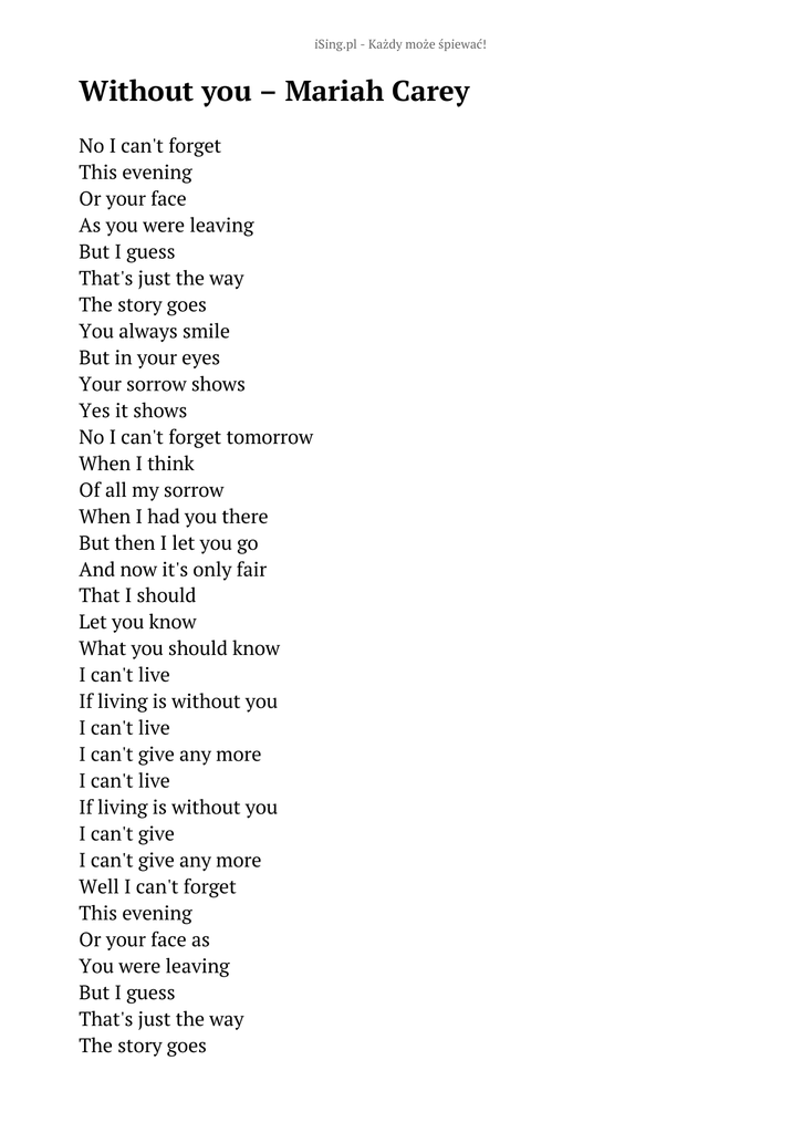 iSing.pl - Każdy może śpiewać! Without you – Mariah Carey No I can't forget This evening Or your face As you were leaving But I guess That's just the way The story goes You always smile But in your eyes Your sorrow shows Yes it shows No I can't forget tomorrow When I think Of all my sorrow When I had you there But then I let you go And now it's only fair That I should Let you know What you should know I can't live If living is without you I can't live I can't give any more I can't live If living is without you I can't give I can't give any more Well I can't forget This evening Or your face as You were leaving But I guess That's just the way The story goes You always smile But in your eyes Your sorrow shows Yes it shows I can't live If living is without you I can't live I can't give any more I can't live If living is without you I can't give I can't give any more OOO AAAAA Give any more I can't live If living is without you I can't live I can't give any more I can't live If living is without you I can't live I can't give any more Słowa: brak danych Muzyka: brak danych Rok wydania: brak danych Płyta: brak danych