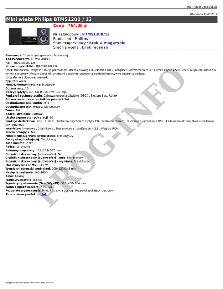 Informacje o produkcie Utworzono 02-03-2017 Mini wieża Philips BTM5120B / 12 Cena : 764,05 zł Nr katalogowy : BTM5120B/12 Producent : Philips Stan magazynowy : brak w magazynie Średnia ocena : brak recenzji PR O G -I N FO Gwarancja: 24 miesiące gwarancji fabrycznej Kod Producenta: BTM5120B/12 P/N:: 4895185609126 Numer części EAN:: 4895185609126 Opis: Mikrowieża Philips z funkcją przesyłania strumieniowego Bluetooth z wielu urządzeń, odtwarzaniem MP3 przez złącze USB Direct i wejściem audio dla innych systemów. Potężne głośniki z tubami basowymi zapewnią bardziej intensywne wrażenia podczas korzystania z domowej rozrywki. Typ: Mini wieża Moduły komunikacyjne: Bluetooth Odtwarzacz: CD Odczyt (płyty): CD , CD-R , CD-RW , CD-mp3 Funkcje i systemy audio: Cyfrowa korekcja dźwięku (DSCI) , System Bass Reflex Odtwarzanie z zew. nośników pamięci: Tak Obsługiwane pliki audio: MP3 Obsługiwane pliki wideo: Nie dotyczy Tuner: FM Rodzaj strojenia: Cyfrowe Liczba zapamiętanych stacji: 20 Funkcje dodatkowe: RDS , Budzik , Budzenie nagraniem z płyty CD , Budzenie radiem , Budzenie z urządzenia USB , Ładowanie akumulatora urządzenia zewnętrznego Interfejsy: Antenowe , Glośnikowe , Słuchawkowe , Wejście Jack 3,5 , Wejście RCA Stacja dokująca: Nie Modele obsługiwane przez stację: Nie dotyczy Cechy stacji dokującej: Nie dotyczy Ilość kolumn: 2 szt. Rodzaj: 2 -drożne Kolumny - wymiary: 159x243x207 mm Głośnik niskotonowy (subwoofer): Nie Głośnik niskotonowy (subwoofer) - moc: Nie dotyczy Głośnik niskotonowy (subwoofer) - wymiary: Nie dotyczy Moc muzyczna (RMS): 100 W Wymiary jednostki centralnej: 200x120x243 mm Napięcie zasilania: 100-240 V Kolor: Czarny Waga urządzenia: 5,8 kg Wymiary opakowania (Szer/Wys/Gł): 395x460x264 mm Waga z opakowaniem: 7,691 kg Pozostałe wyposażenie: Pilot, Instrukcja obsługi, Przewód zasilający sieciowy Strona www produktu: Link Wygenerowano w programie www.oscGold.com